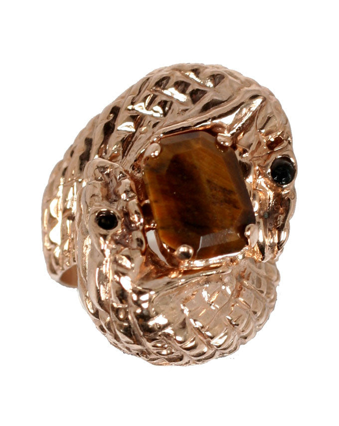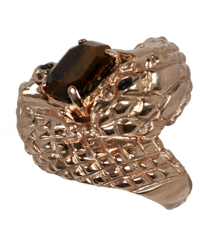 Bronze ring with serpent detail and tiger eye center stone. Metal is a rose gold tone.