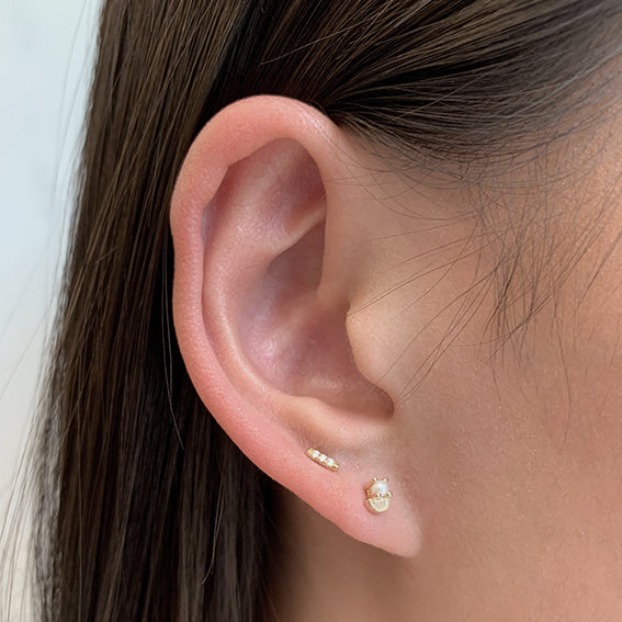A pristine baguette diamond sits atop a soft geometric half moon gold nugget to create the perfect balance of edges and curves. Hand implemented milgrain detail around the perimeter of the half moon.