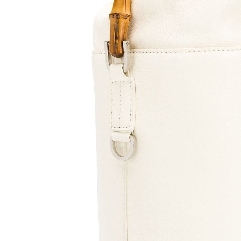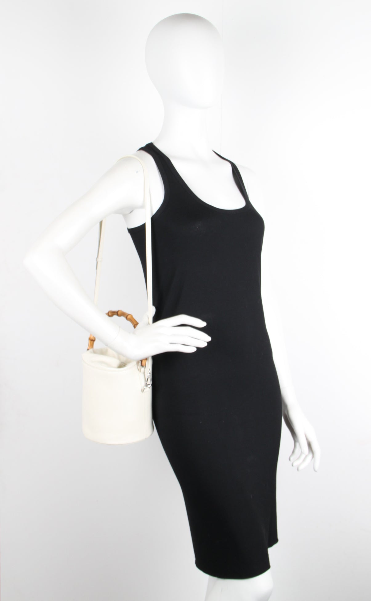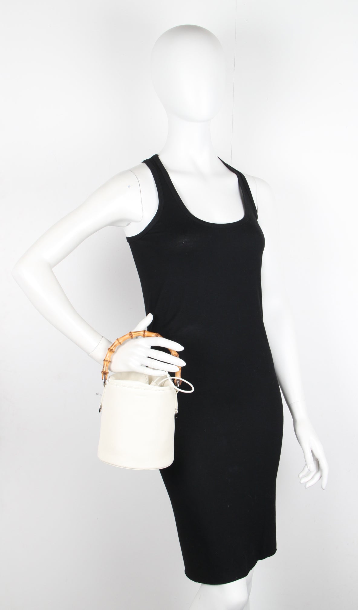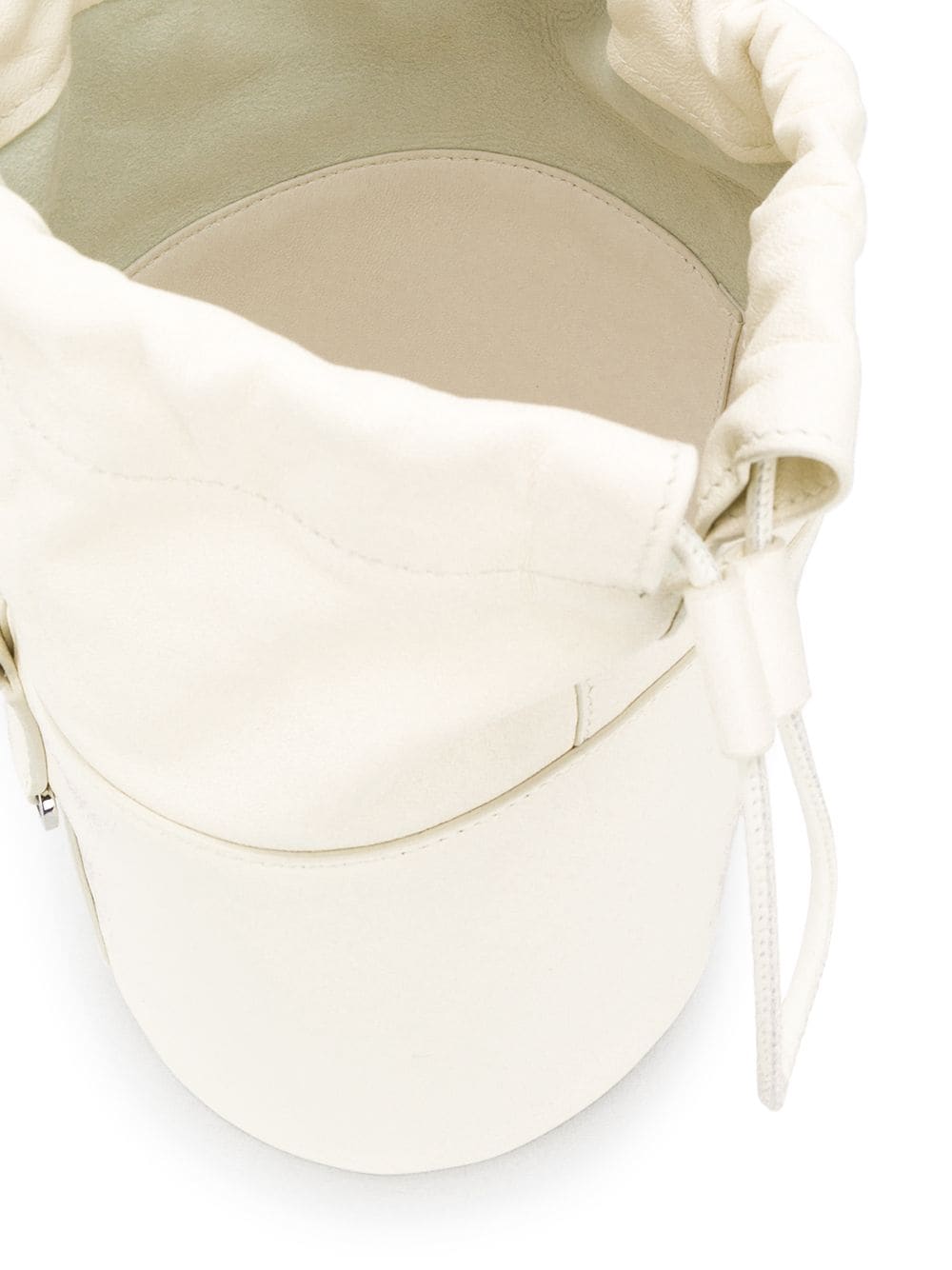 Soft leather bucket bag featuring a bamboo leather handle, detachable leather strap, drawstring closure, nappa lining and blind embossed Jil Sander logo.