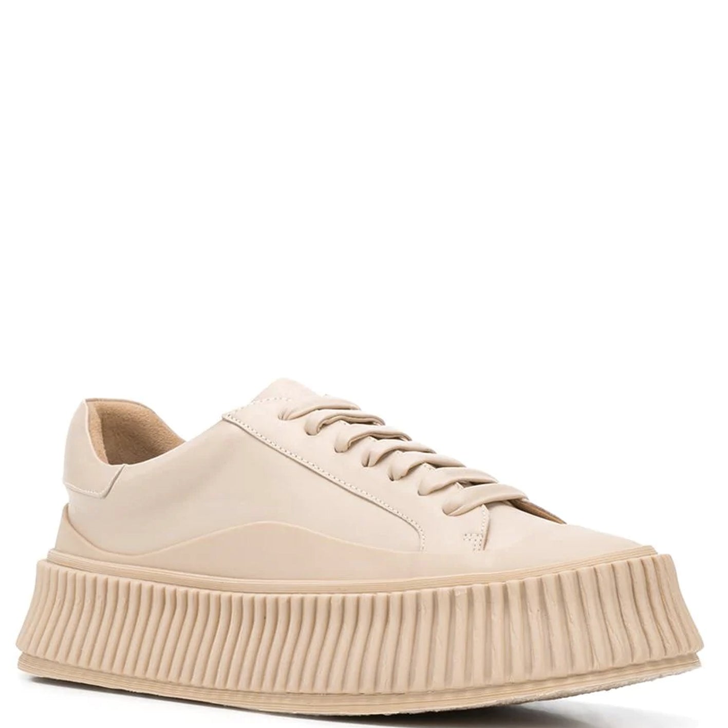 Round toe leather sneakers featuring leather insole and vulcanized rubber sole.