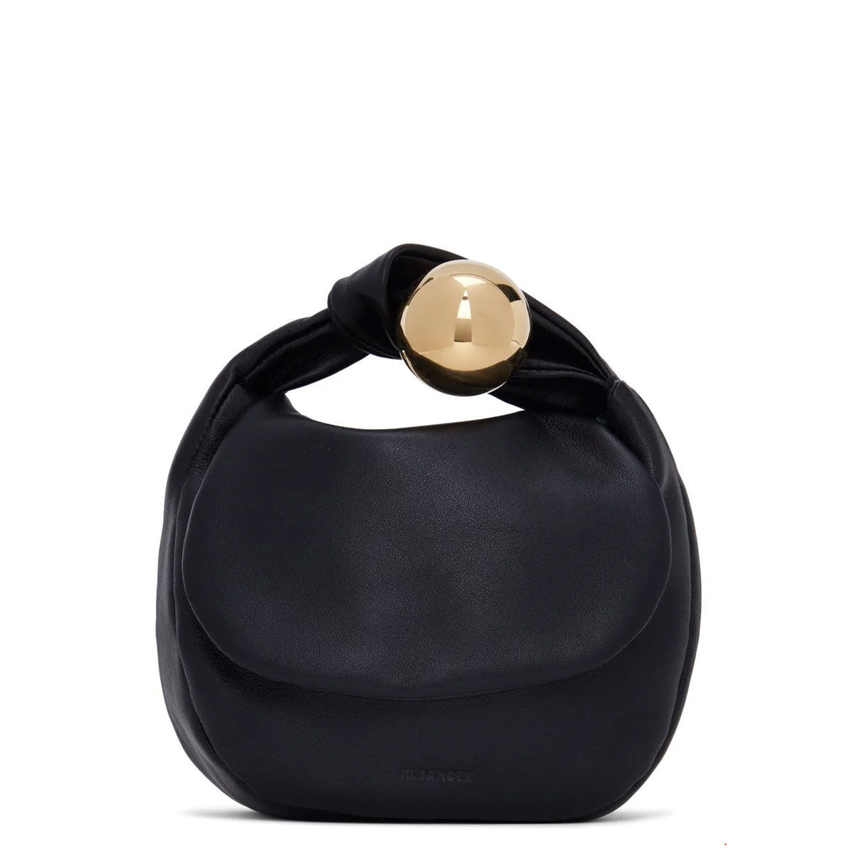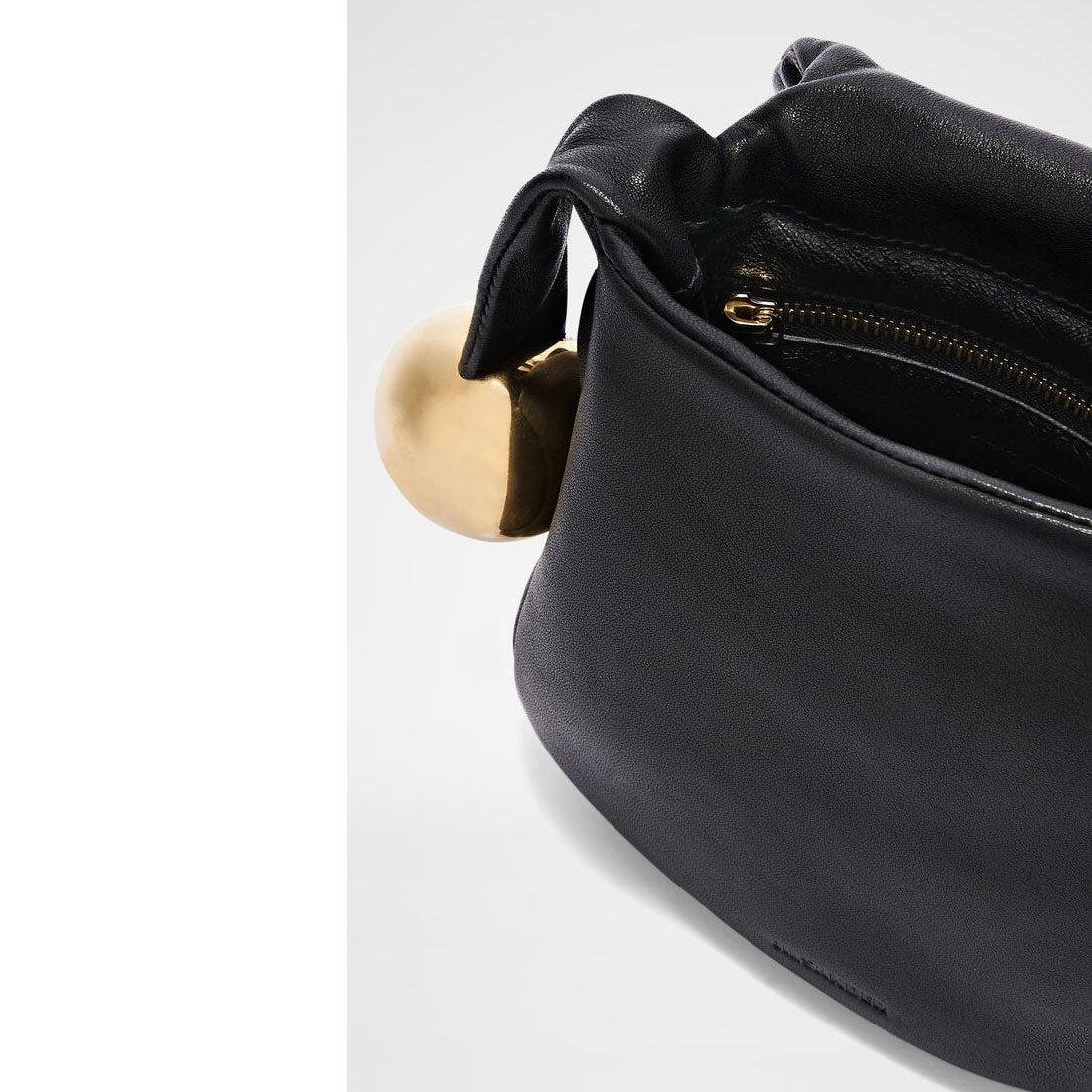 Leather pouch with metal sphere closure and handle detail. Soft body, featuring inner zipped pockets and nappa lining.