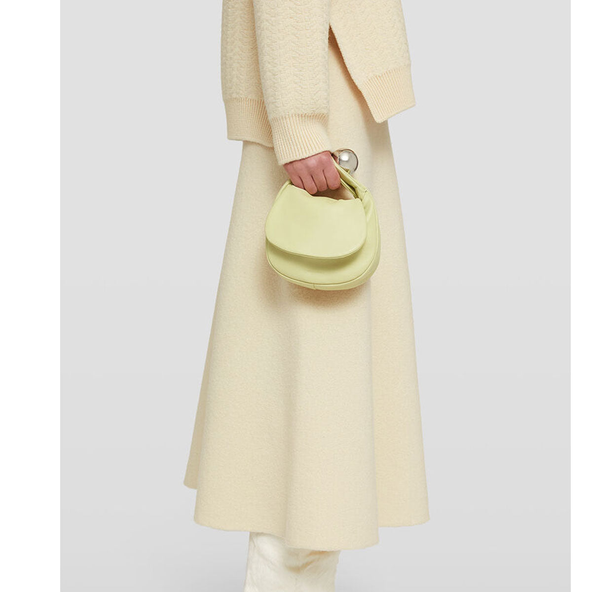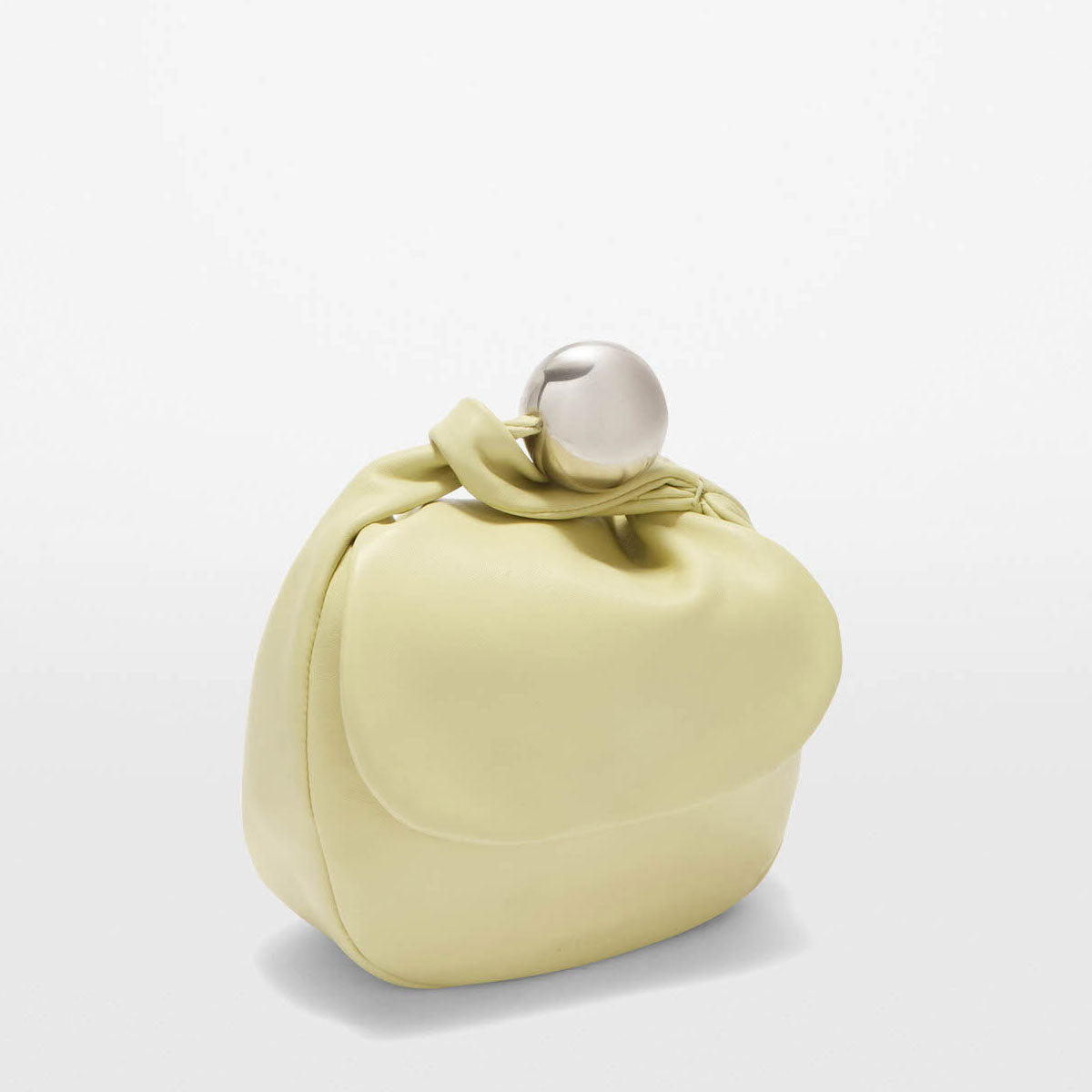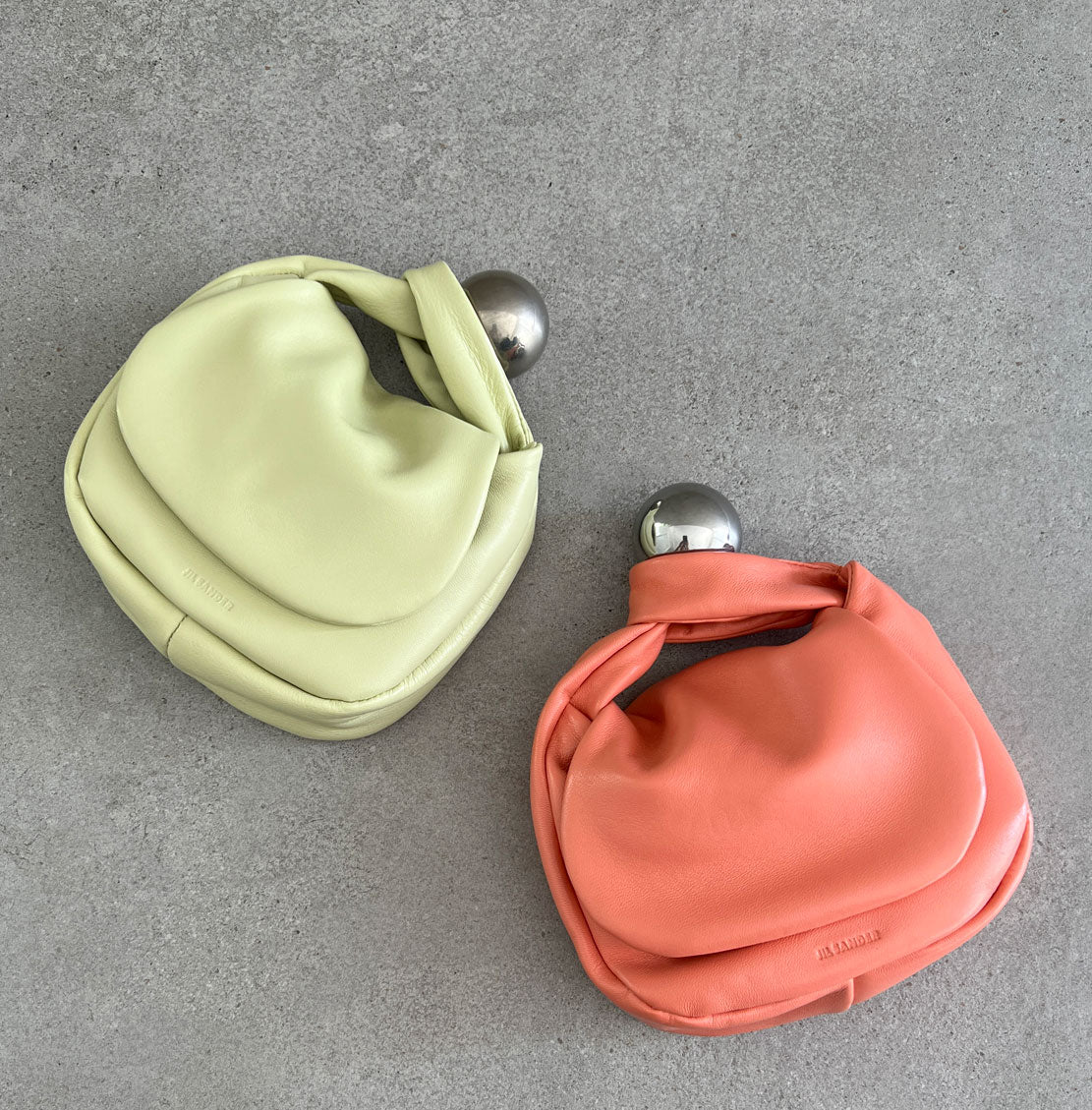 Leather pouch with metal sphere closure and handle detail. Soft body, featuring inner zipped pockets and nappa lining.