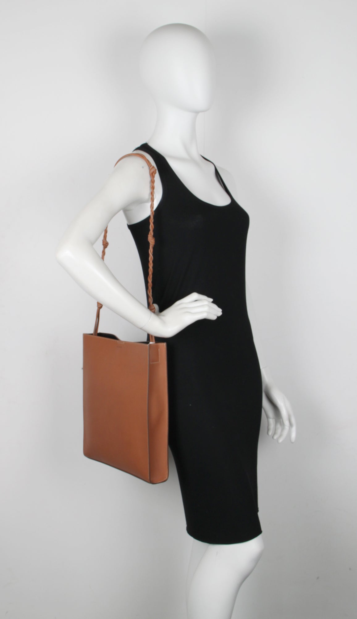 Large shoulder, crossbody rectangular bag featuring a hand-knotted leather strap and a foil embossed Jil Sander logo. Also features an internal flat pocket, two internal card slots and magnetic button closure.