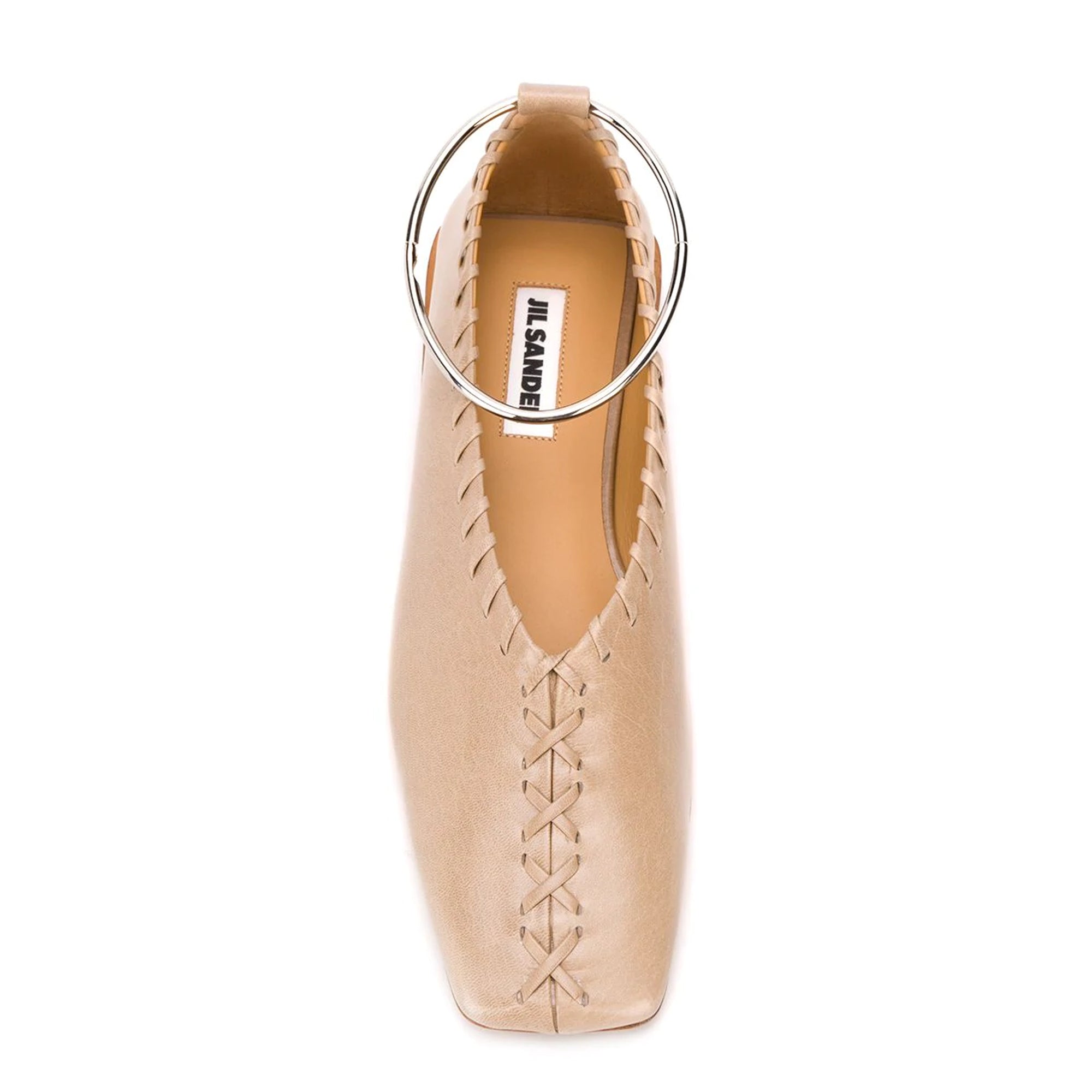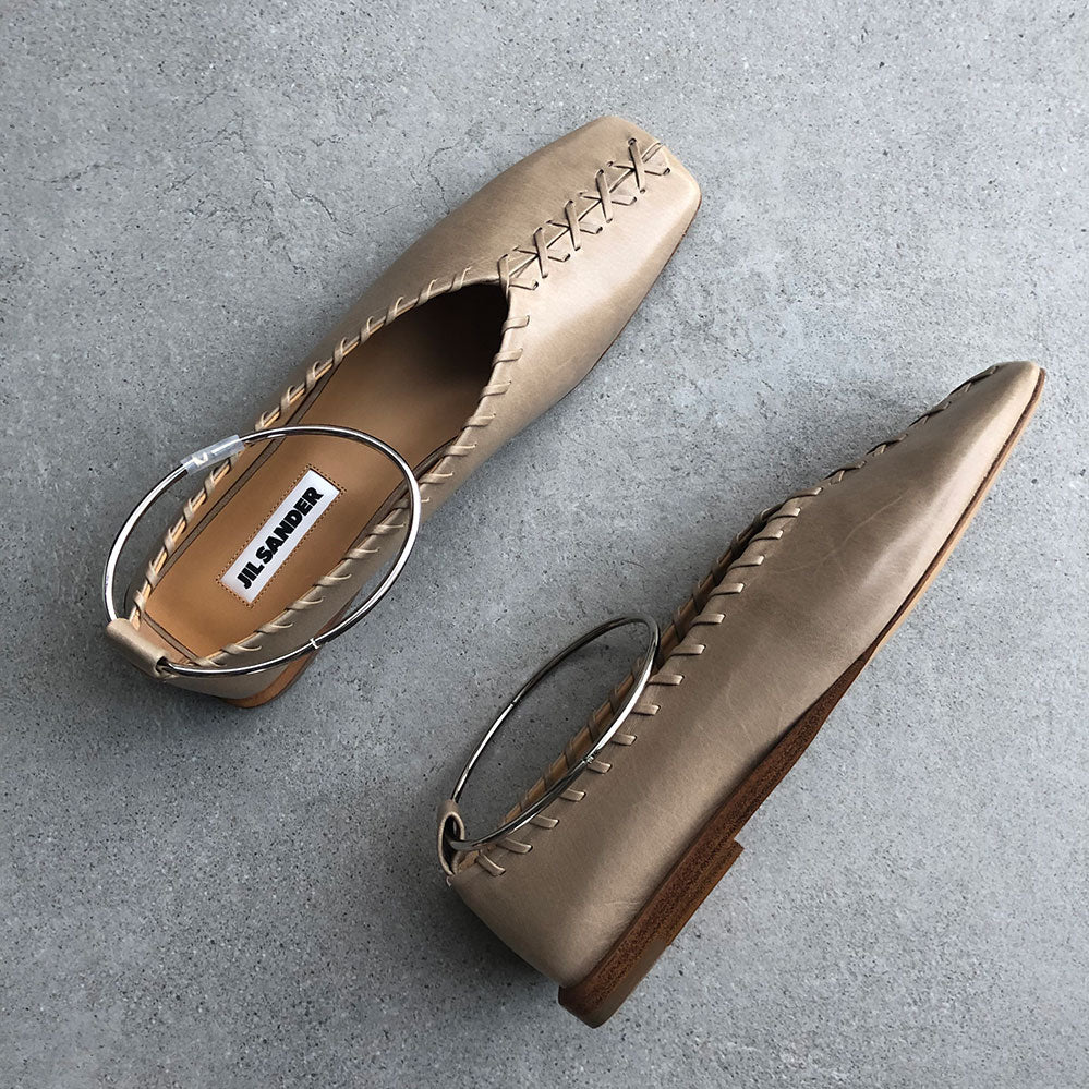 Square toe, leather ballerinas featuring stitching details and a detachable metal ankle bracelet