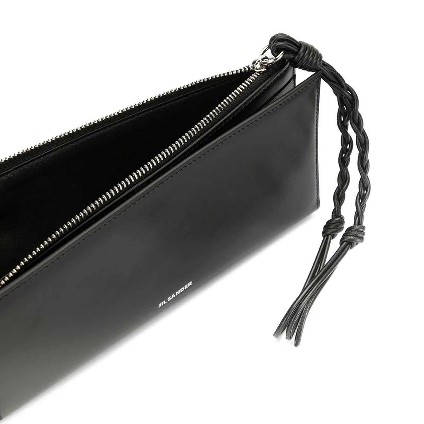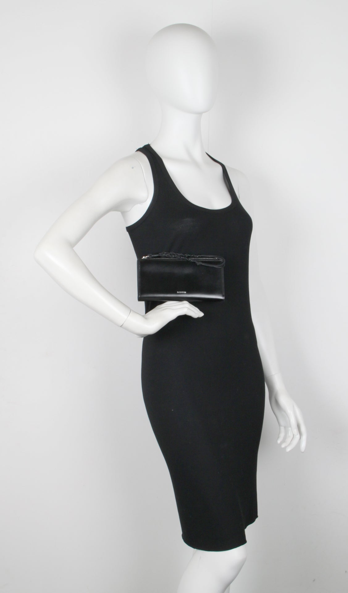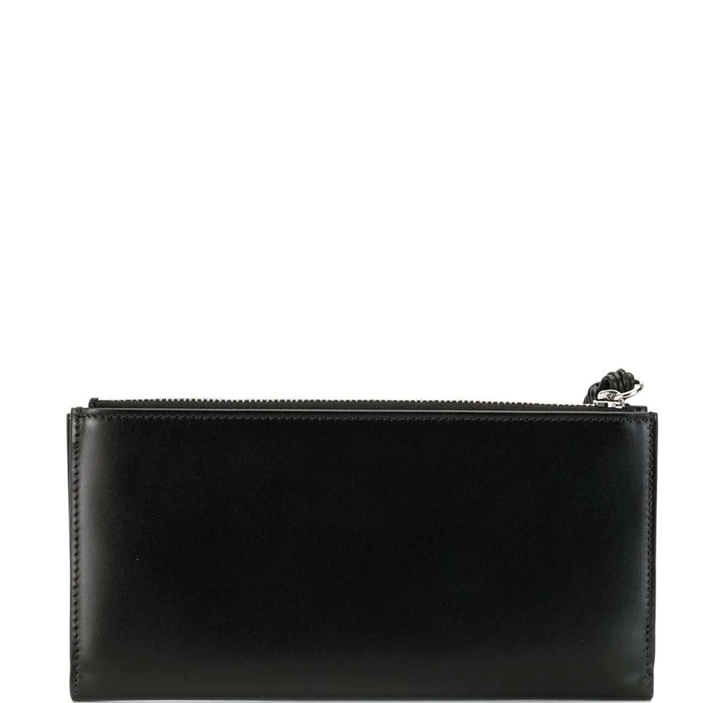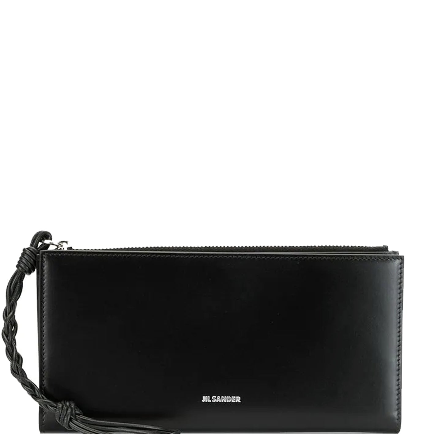 Leather wallet with hand-knotted wrist strap and foil embossed Jil Sander logo. Inclosed six card slots and one zipped pocket.