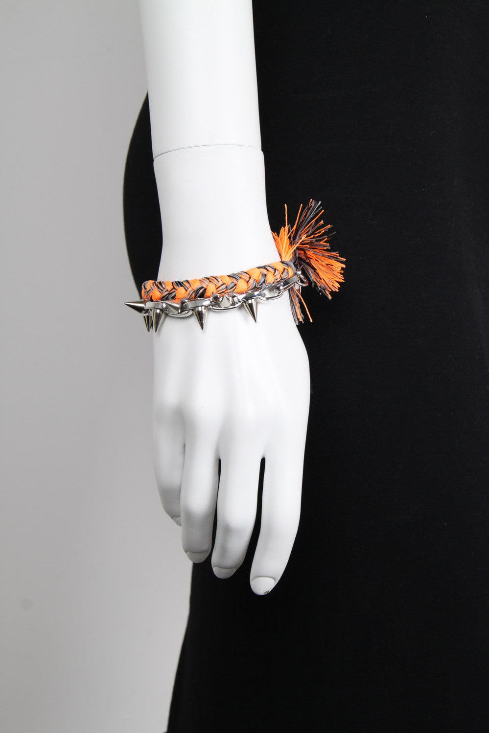 Joomi Lim bracelet with braided cotton colorful threads with brass bracelet and spikes dipped in Rhodium. Weighty chain. Lobster-claw clasp.