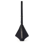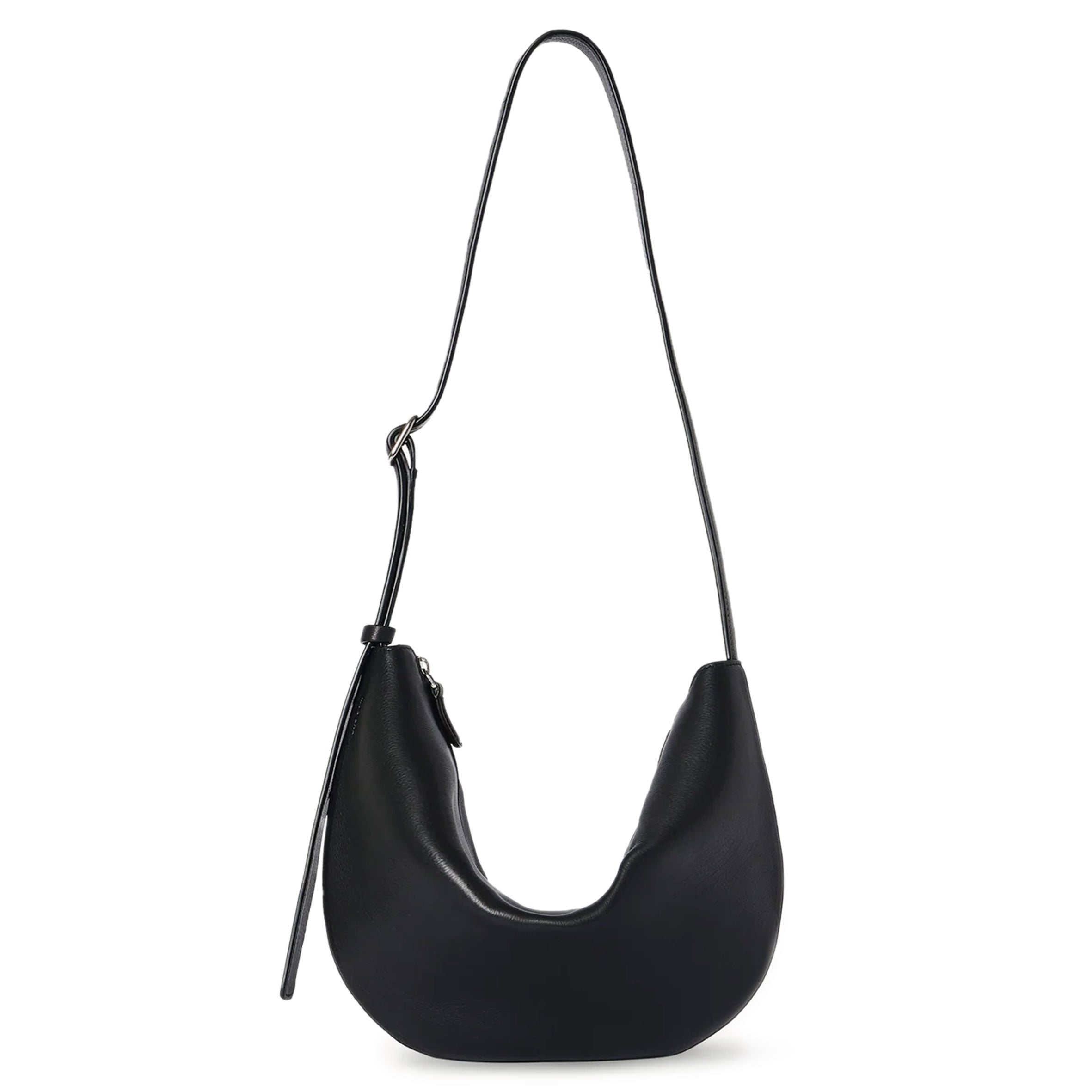 Crescent-shaped crossbody bag in finely grained calfskin leather with zipper closure and adjustable strap with metal buckle.