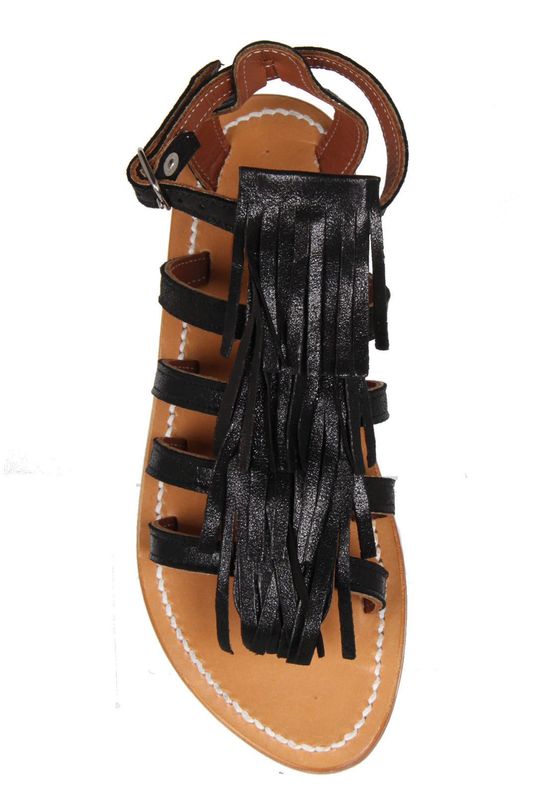 Versatile leather K. Jacques tribal-inspired Fregate sandals are made with a soft leather (in very subtle metallic sheen) . Straps ensure a comfortable fit, while the fringed front panel gives them a bohemian feel. Buckle closure. Leather sole.