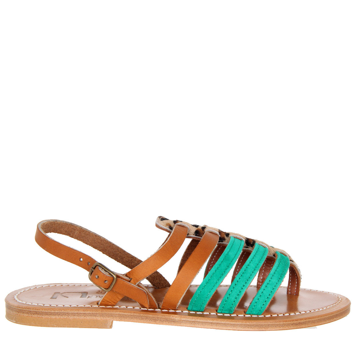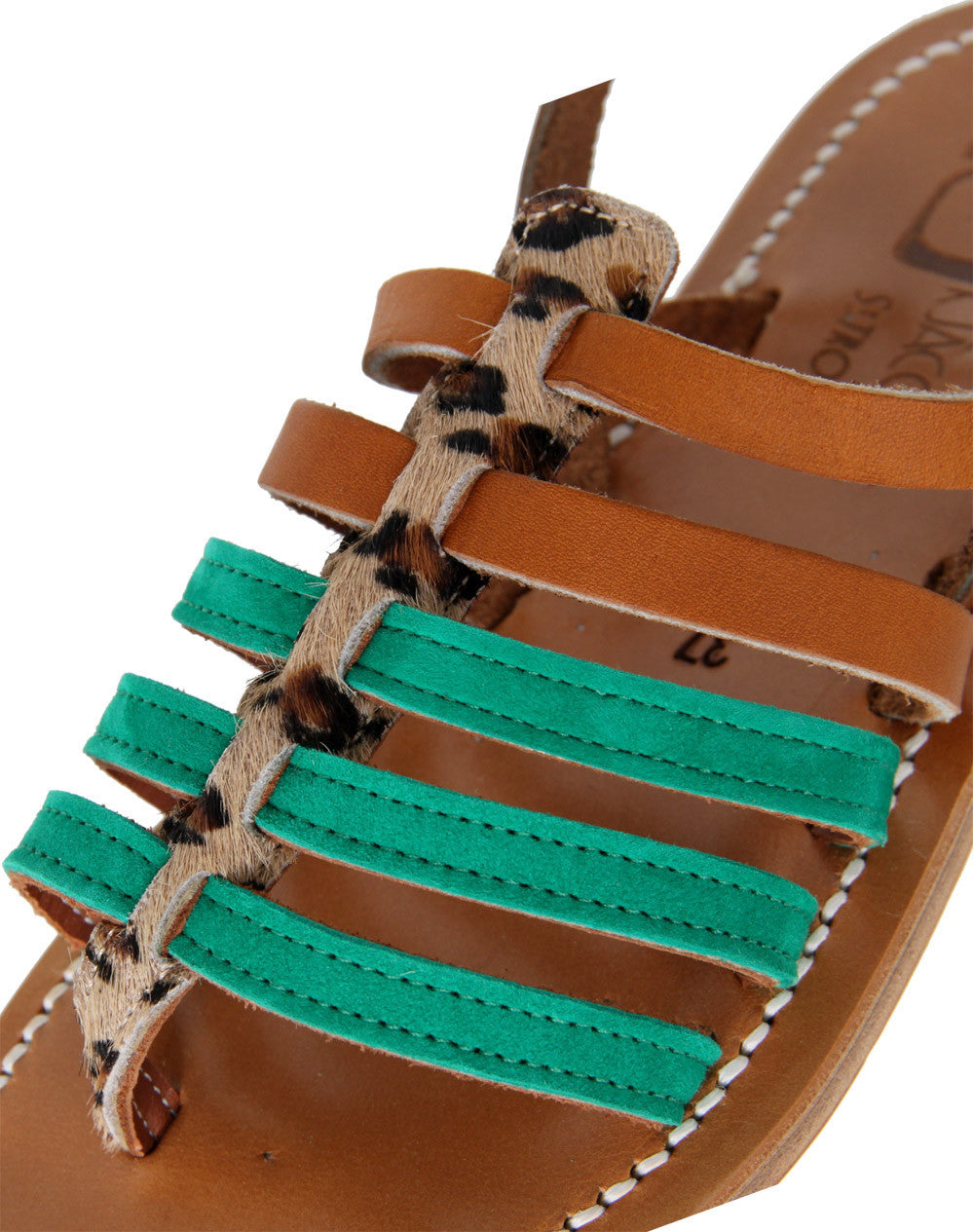 Calf Hair with leopard Print with contrasting green Suede leather on straps.