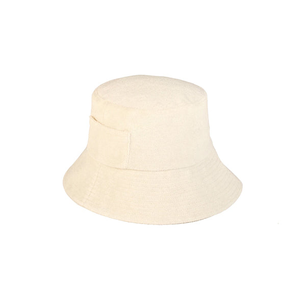 The Wave Bucket hat made from beige terrycloth is an updated easy to wear style for a sun-safe street look. This brimmed bucket hat design features a small side pocket.