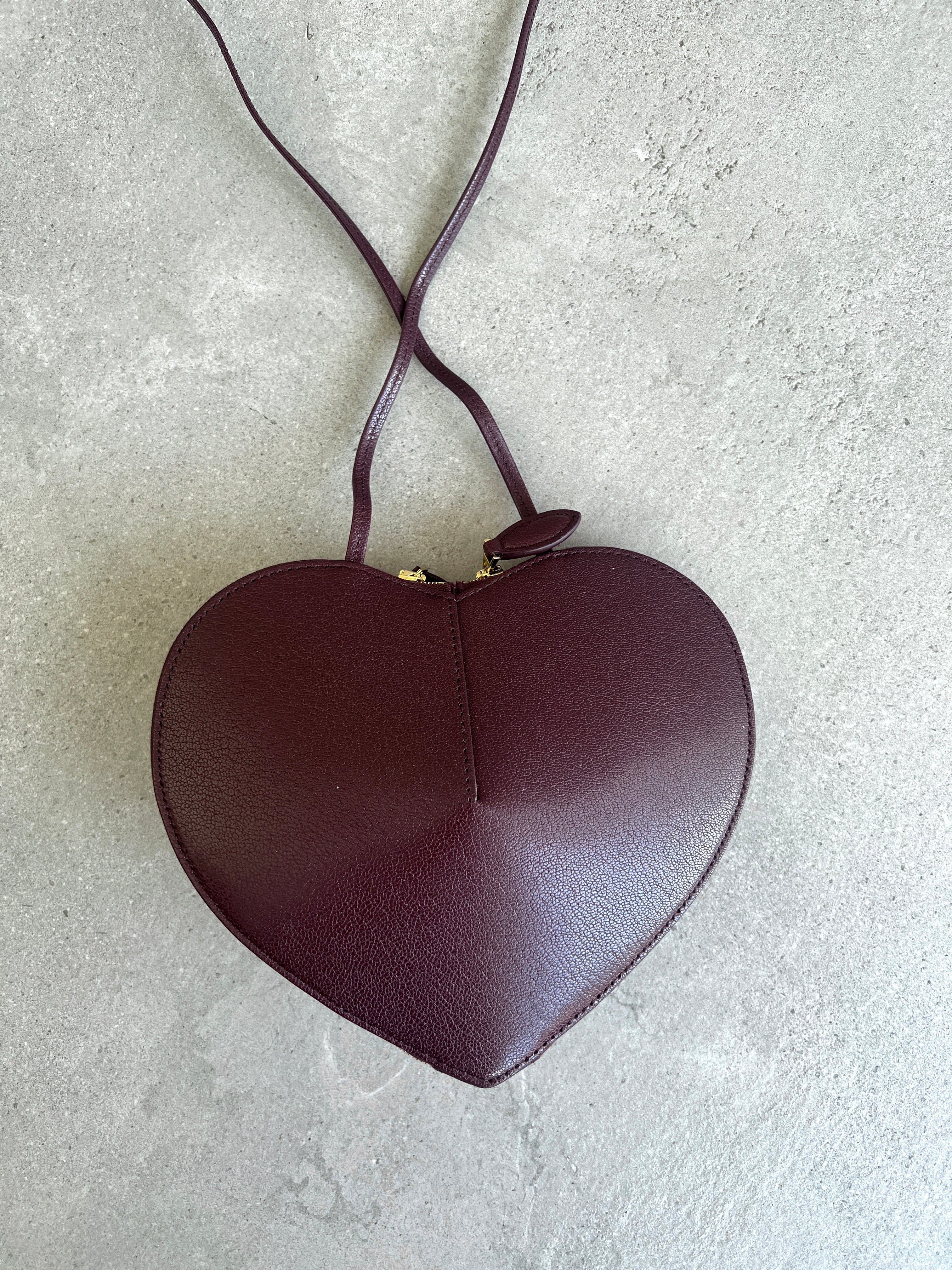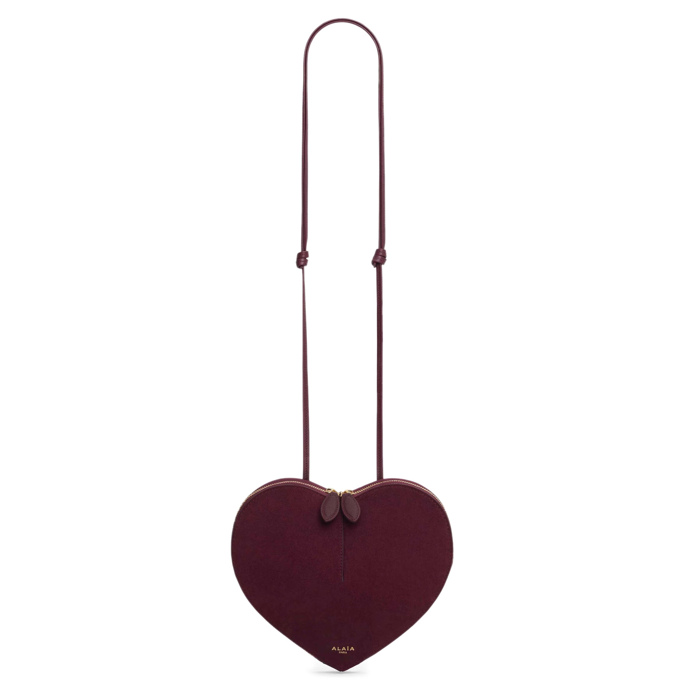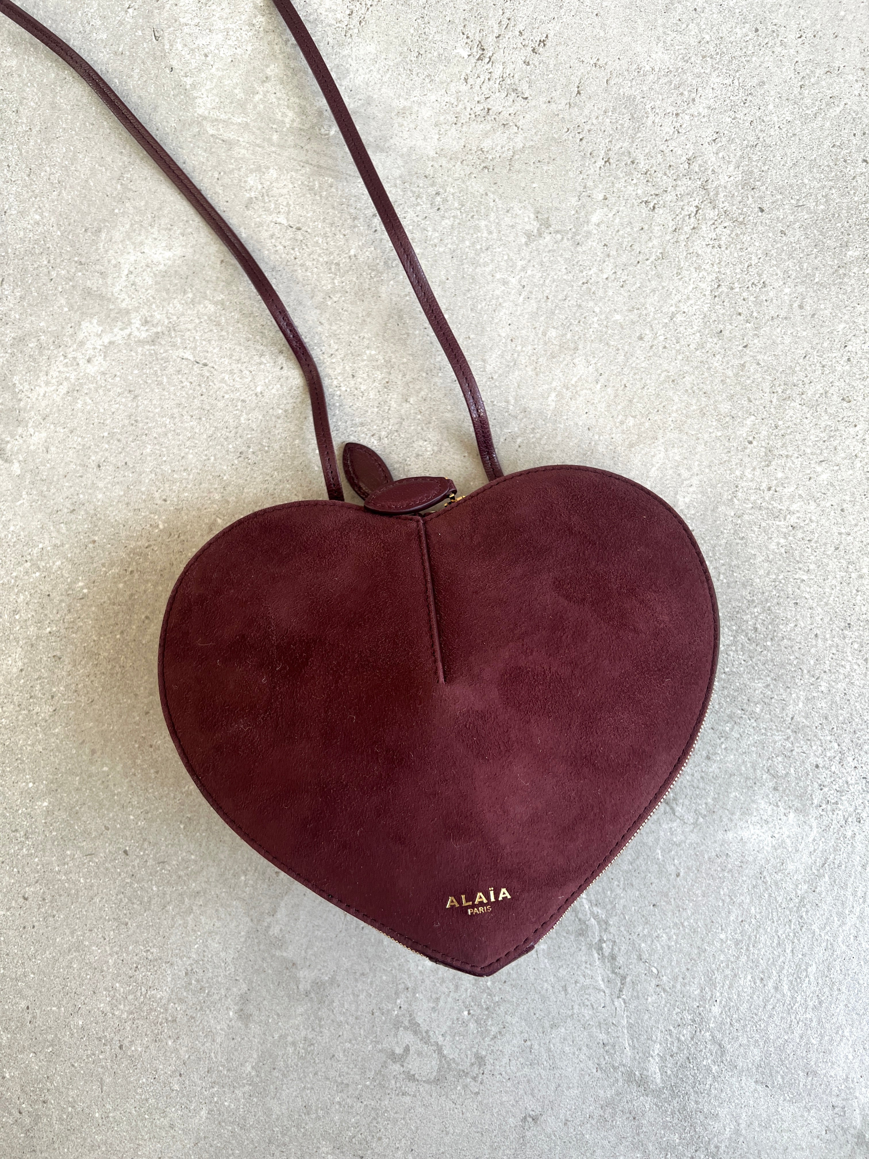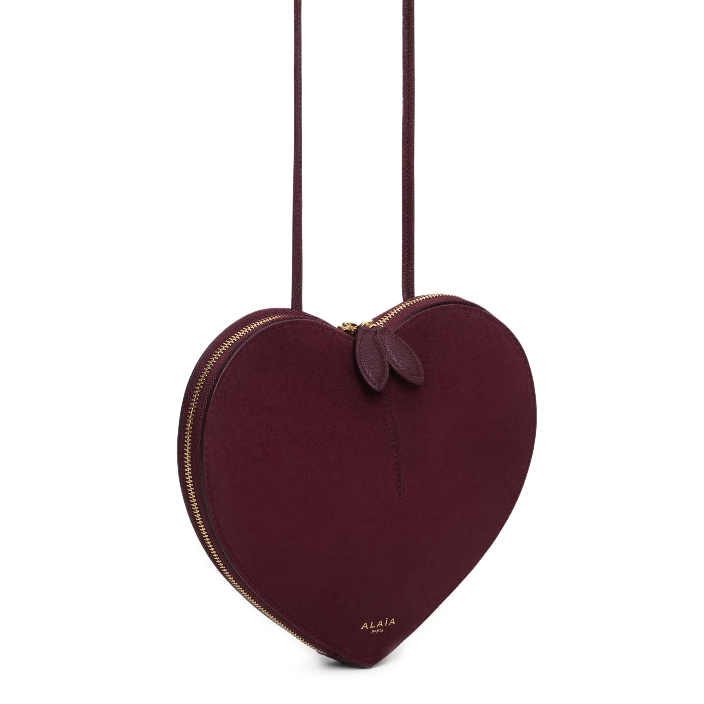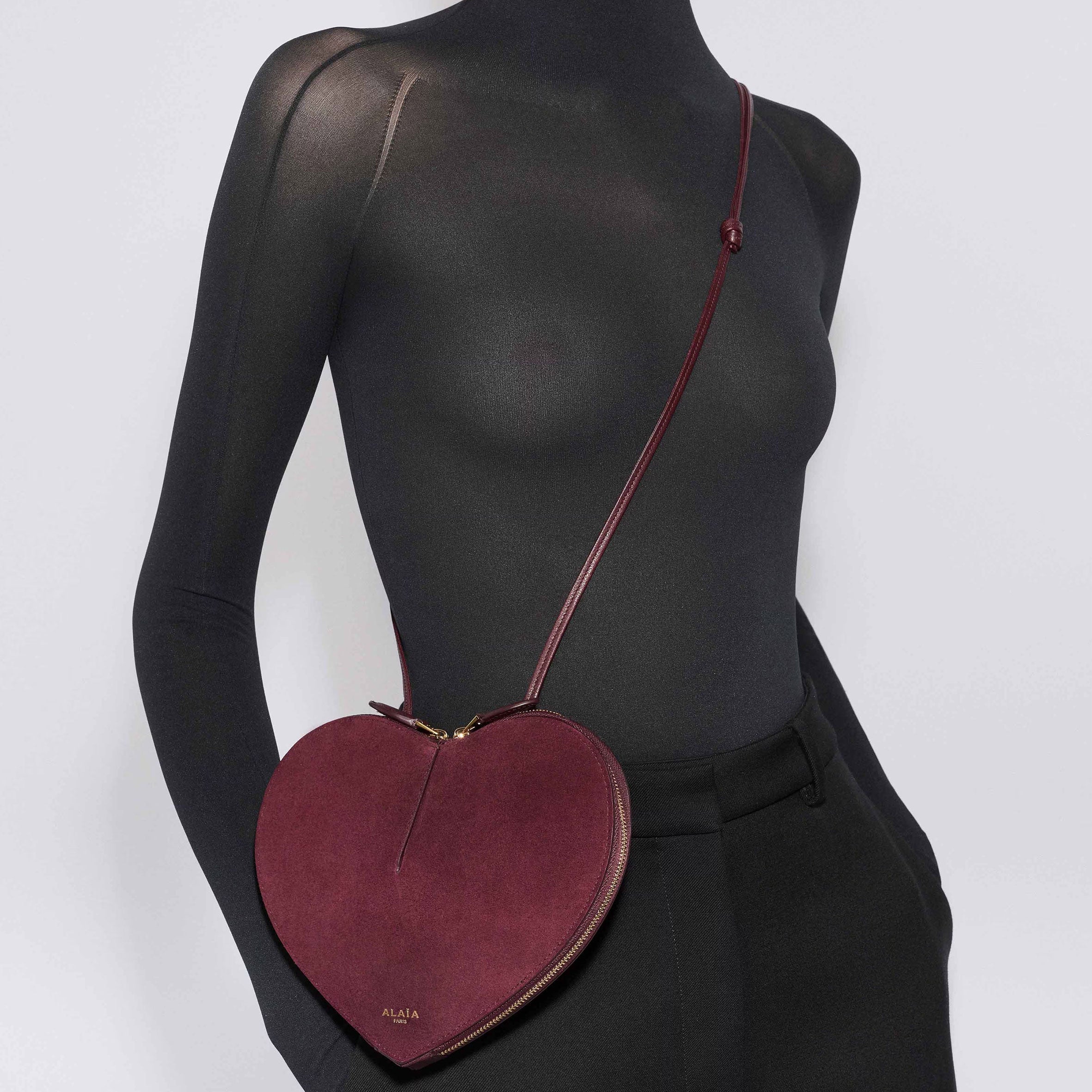 The iconic heart-shaped bag of the Alaïa Maison. Crafted in a mix of suede goatskin and shiny goatskin leather with natural subtle grain, featuring a zip pouch, an adjustable strap and silver logo detailing.