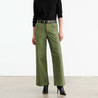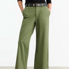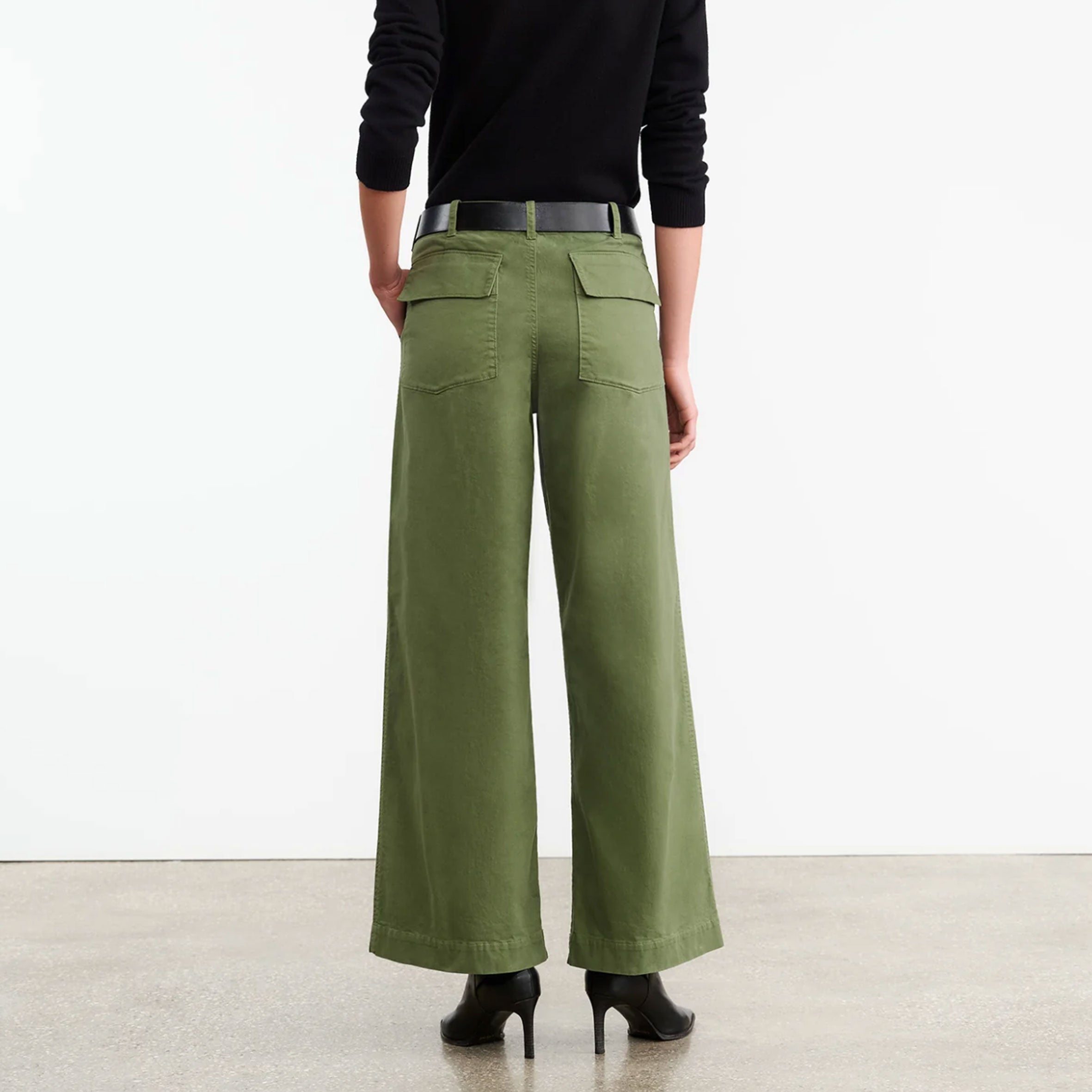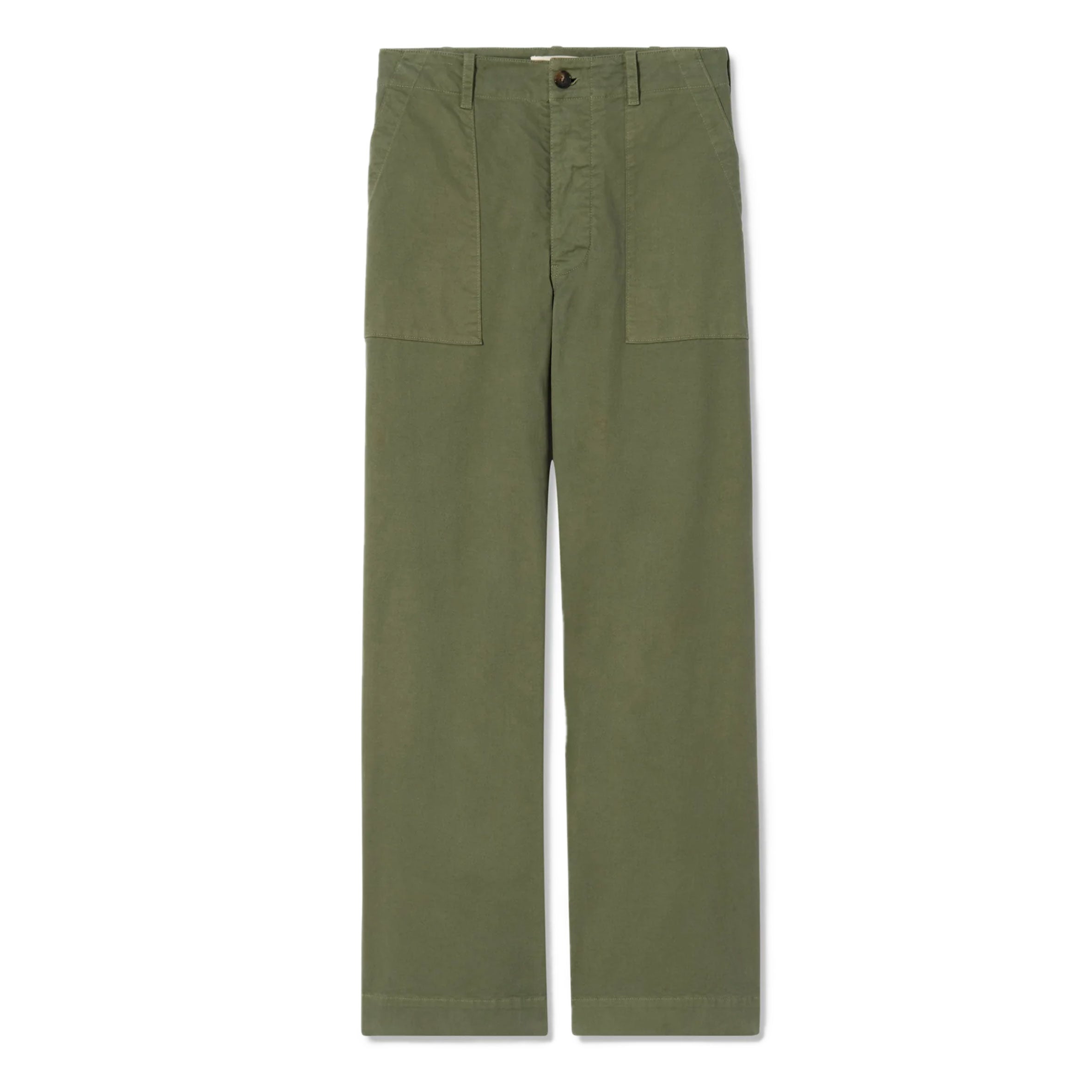 Flat front, mid-rise relaxed straight leg pant in brushed stretch twill cotton. Front patch pockets. Back patch pockets with flaps. Back darts. Zip fly. Button closure. Belt loops.