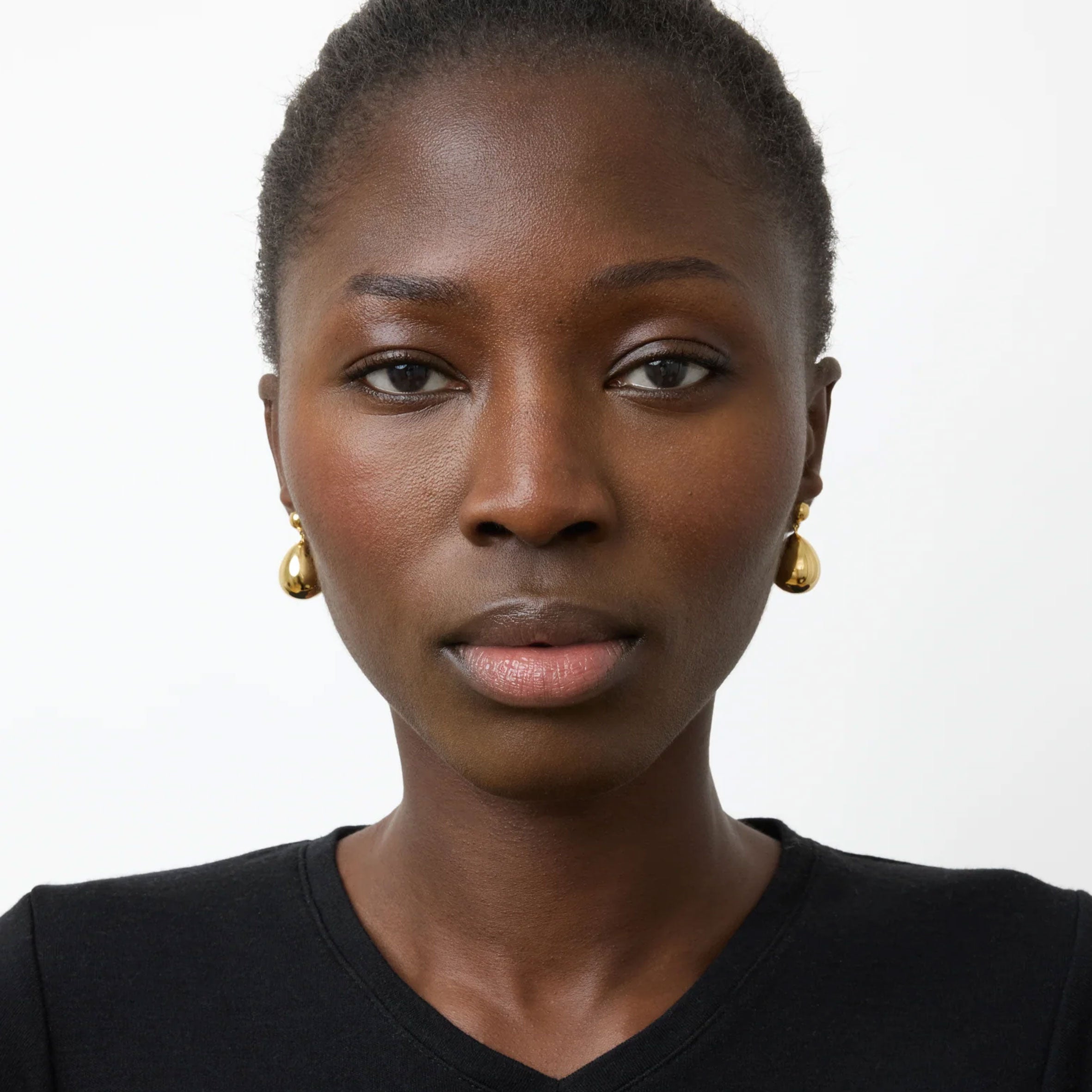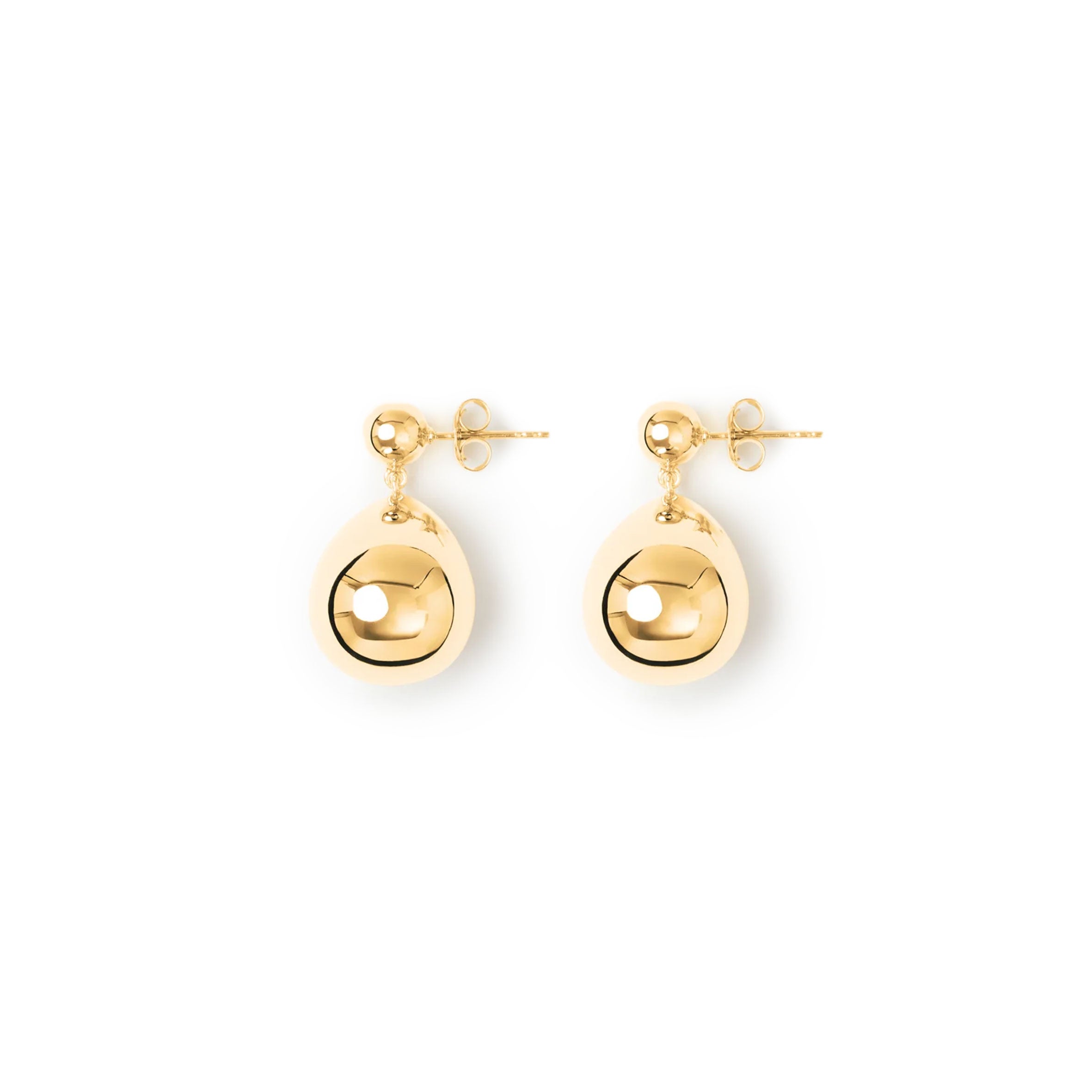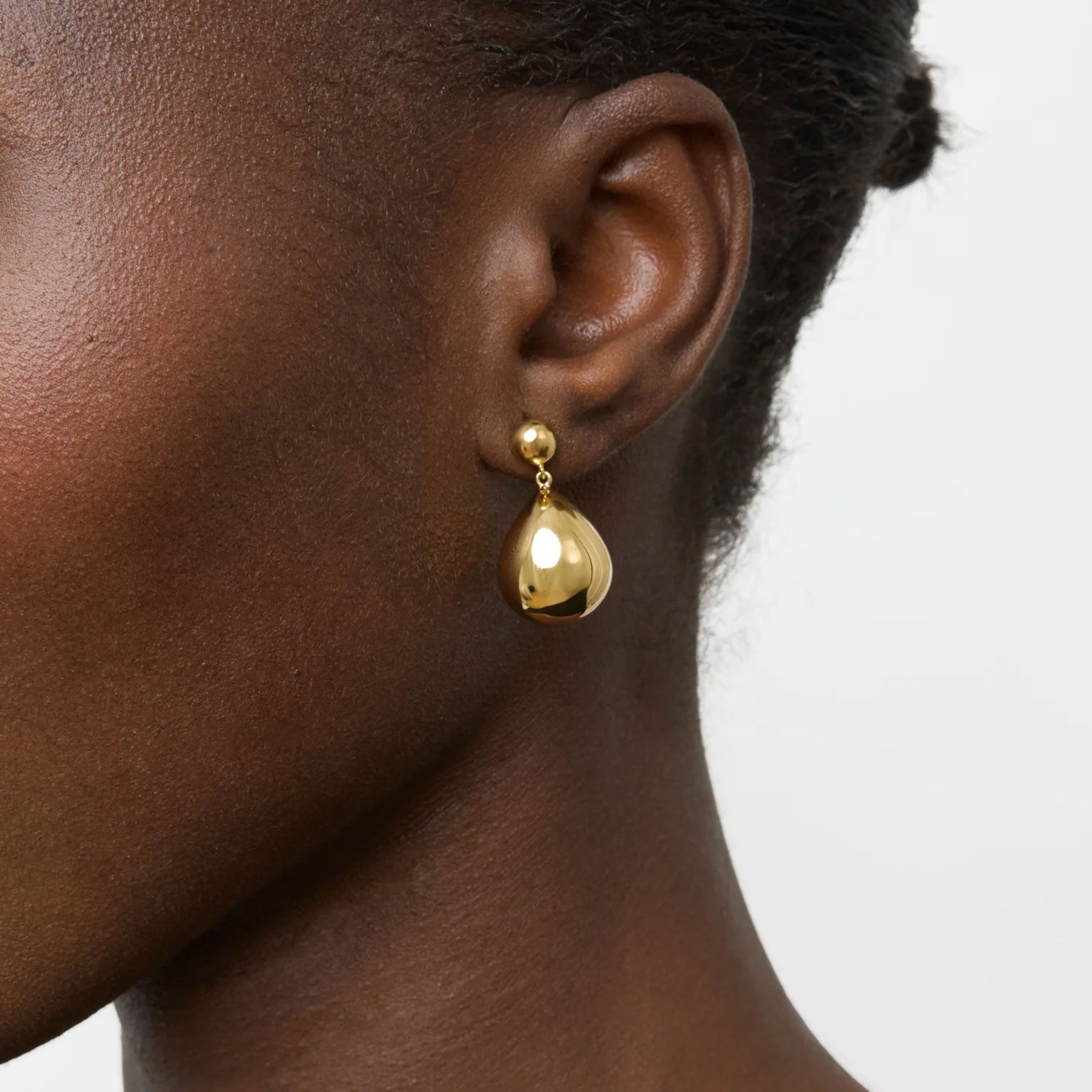 Subtle and sophisticated drop-shapes earrings hanging from a small round stud. The Julie earrings come to life gently as you move. This earring is crafted from 18 carat gold-plated sterling silver.