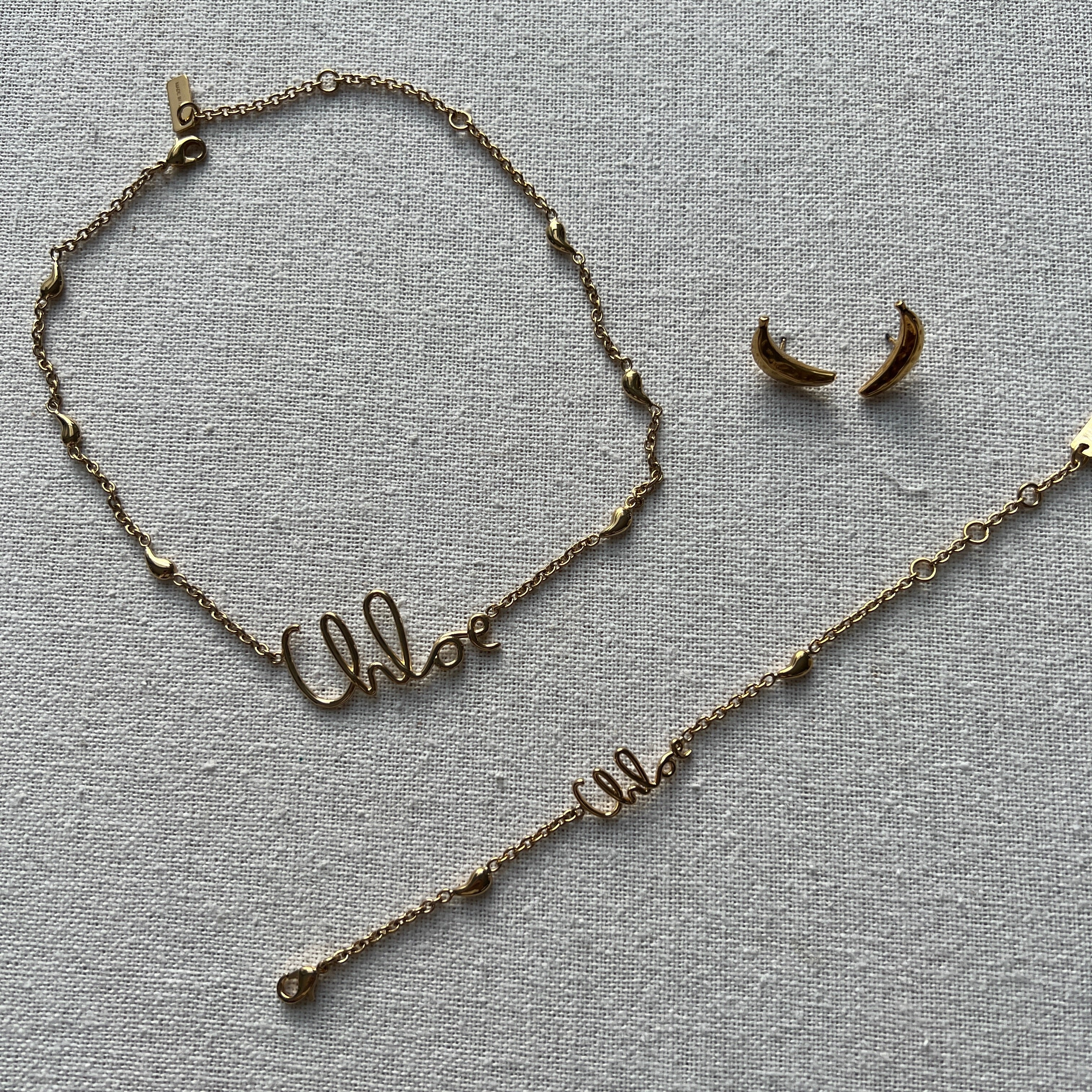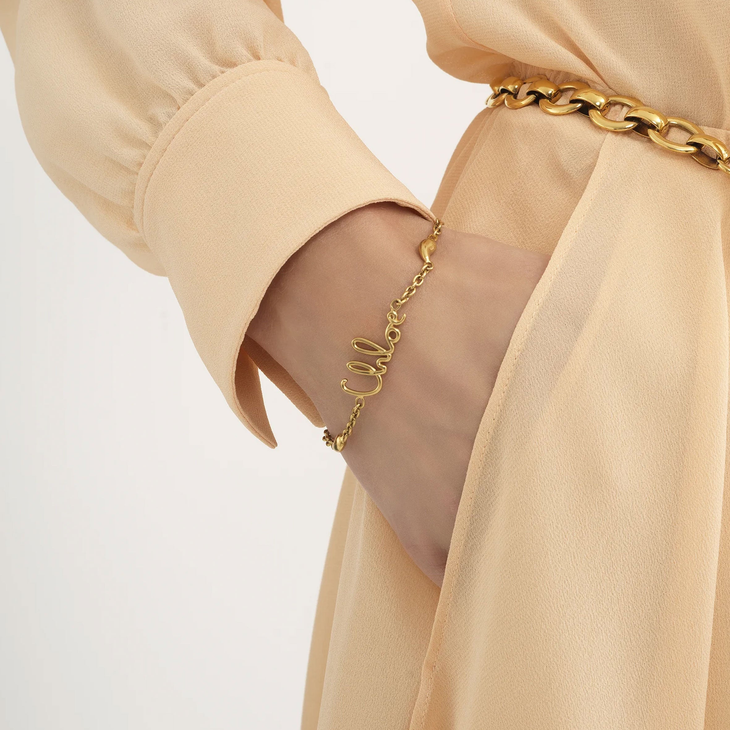 Chloé Iconic bracelet in vintage gold brass, inspired by a chain belt rooted in the Maison's heritage. The Chloé logo is showcased in a soft, handwritten font and rounded off by accent pendants inserted into the chain.