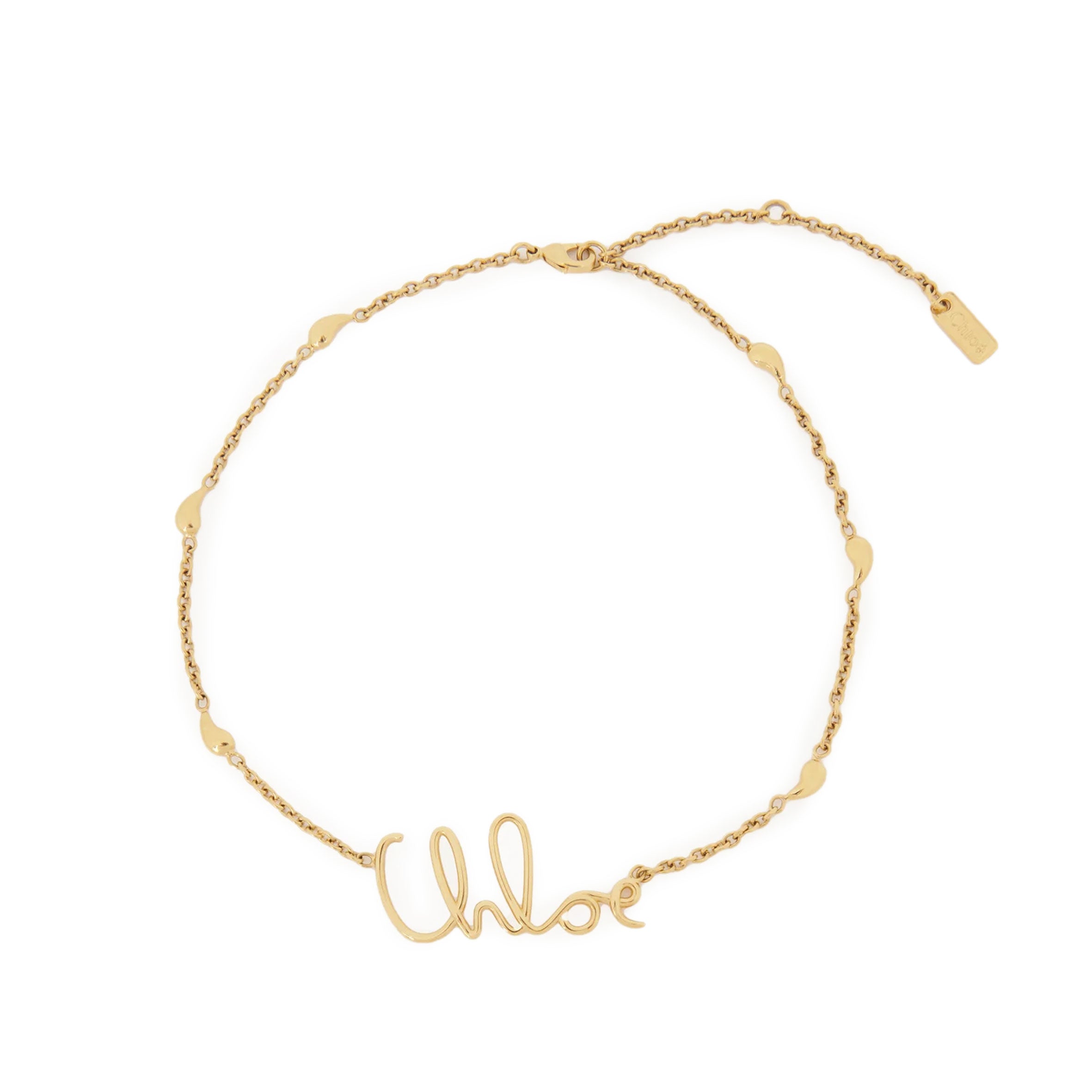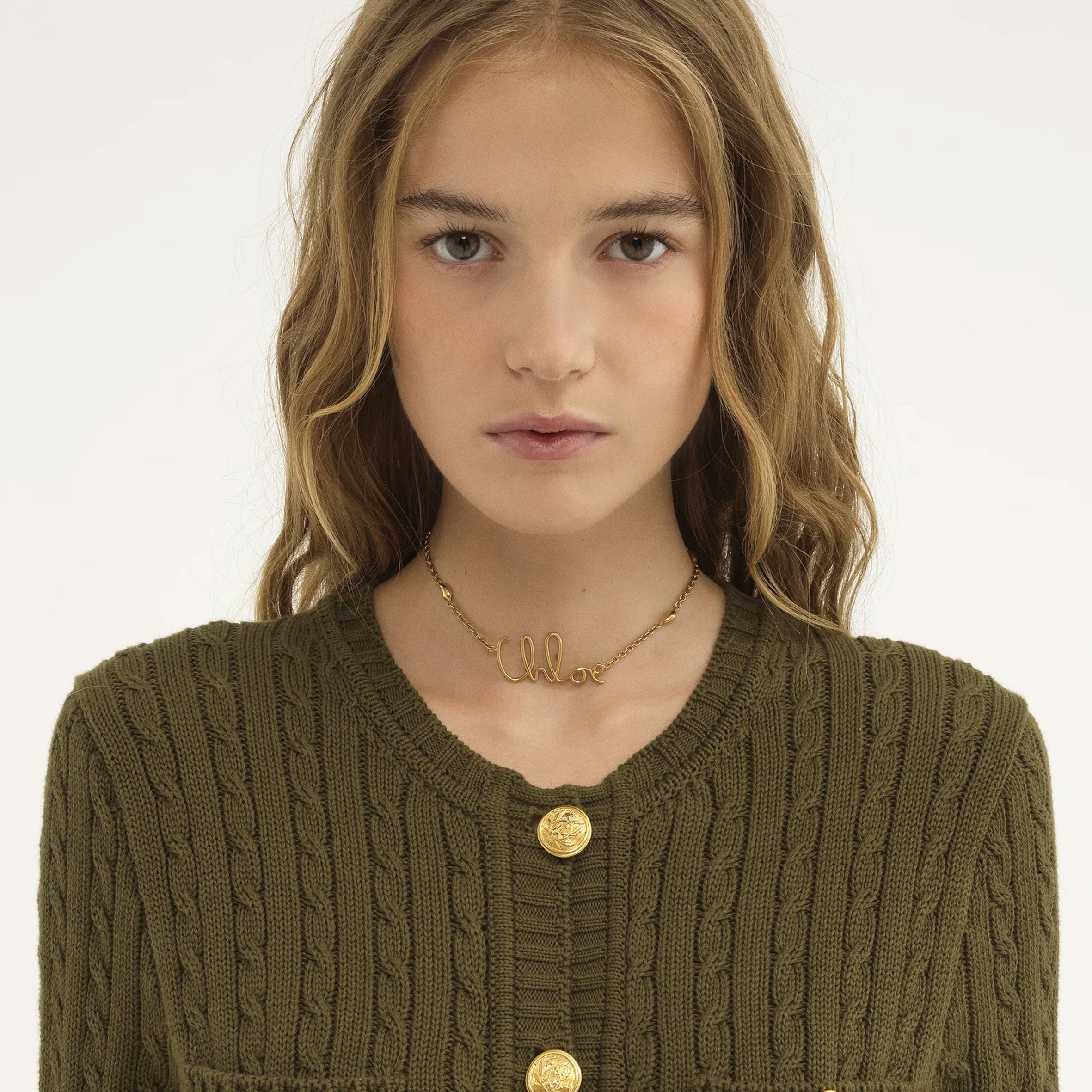 Chloé Iconic necklace in vintage gold brass featured on the Fall-Winter 2024 runway, inspired by an archival chain belt. The Chloé logo is showcased in a soft, handwritten font and rounded off by accent pendants inserted into the chain.