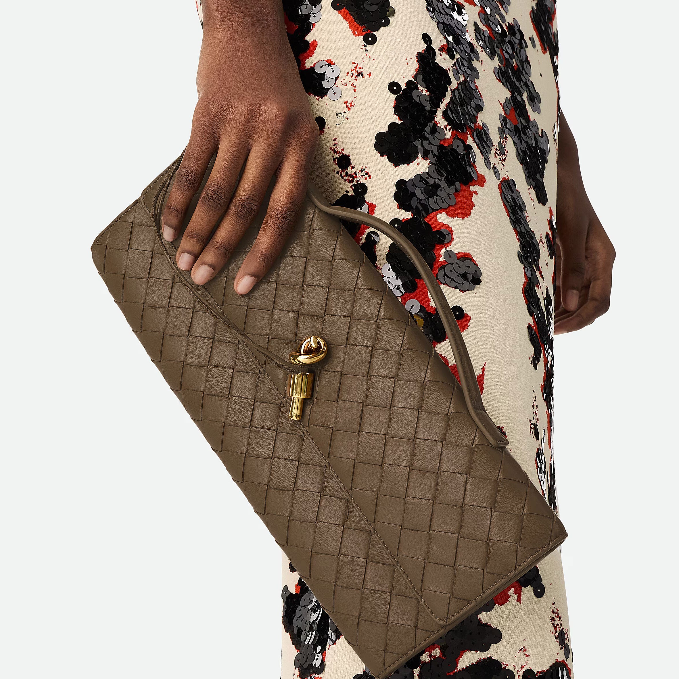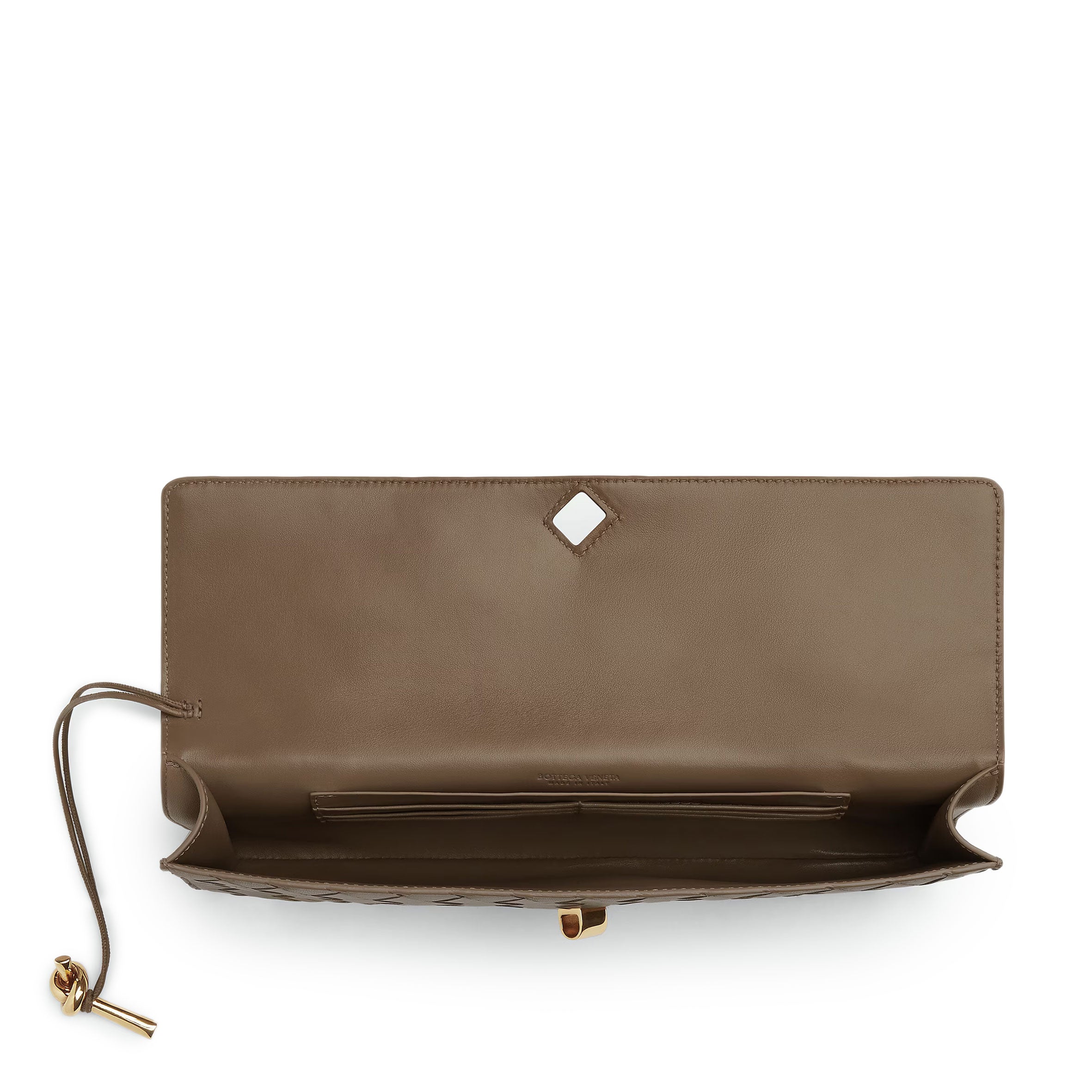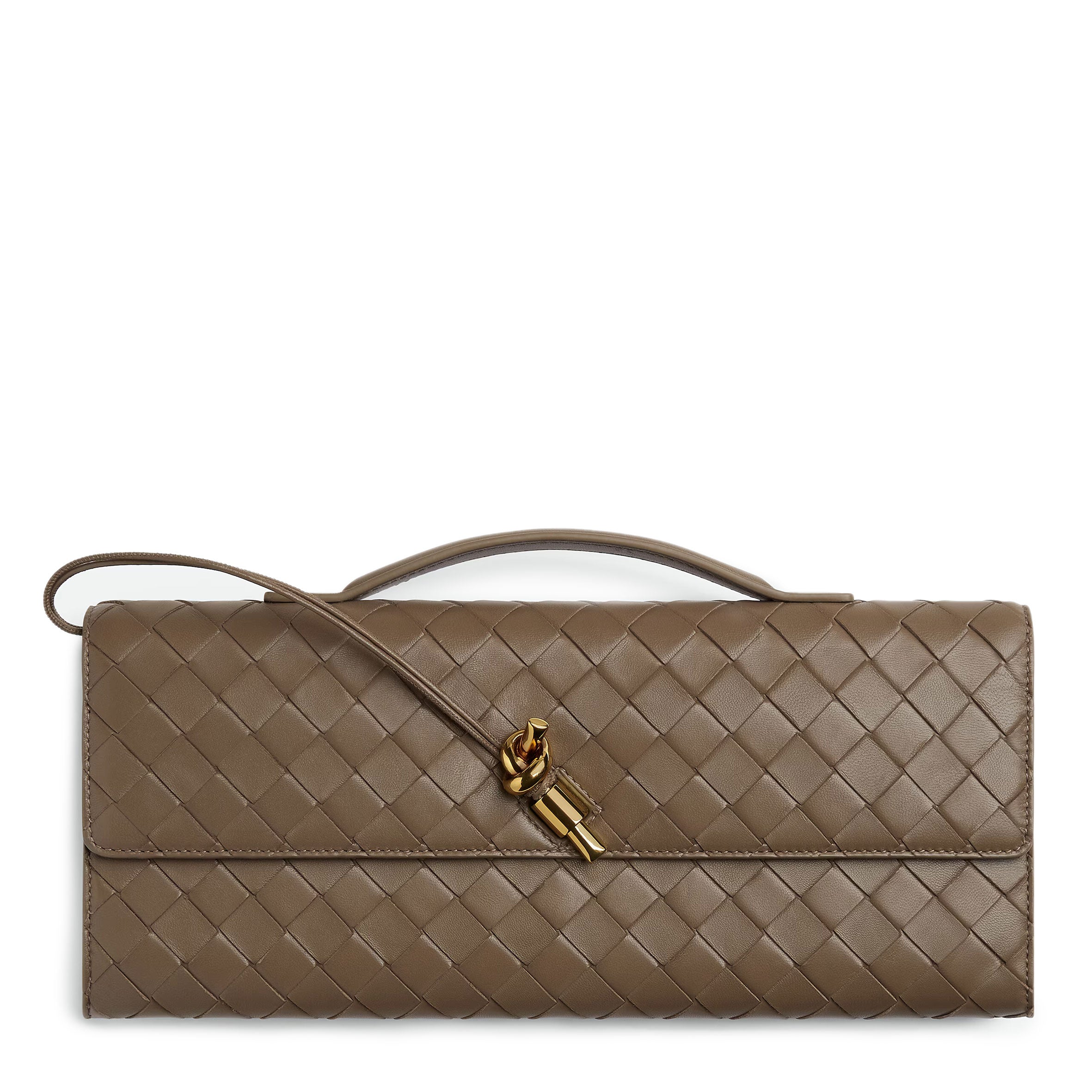 • Intrecciato leather handle clutch with metallic knot closure