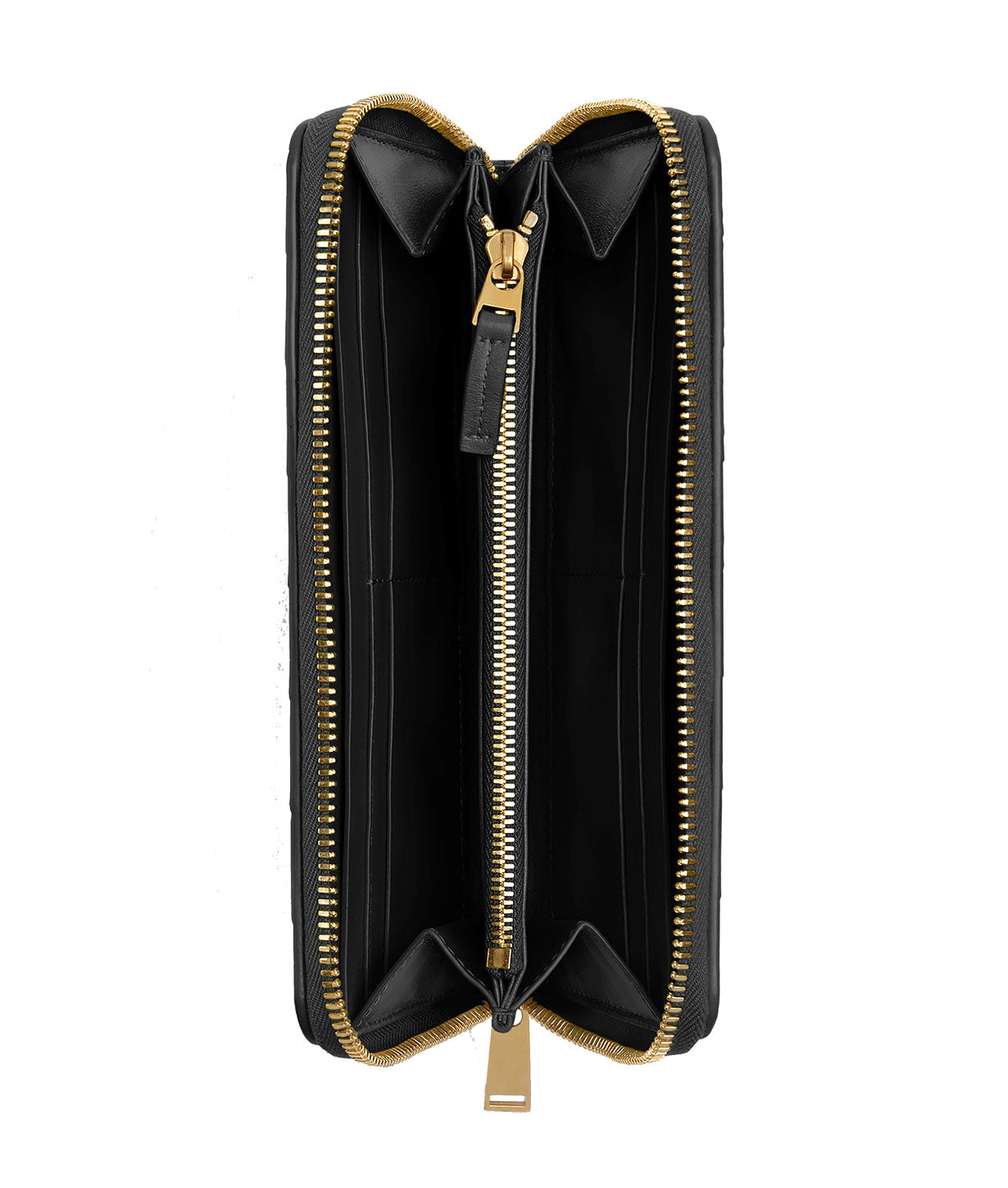 Long Zip wallet with gold tone hardware. Intrecciato leather wallet. Eight card slots, two note compartments, two additional pockets, one zipped coin purse. Zip closure
