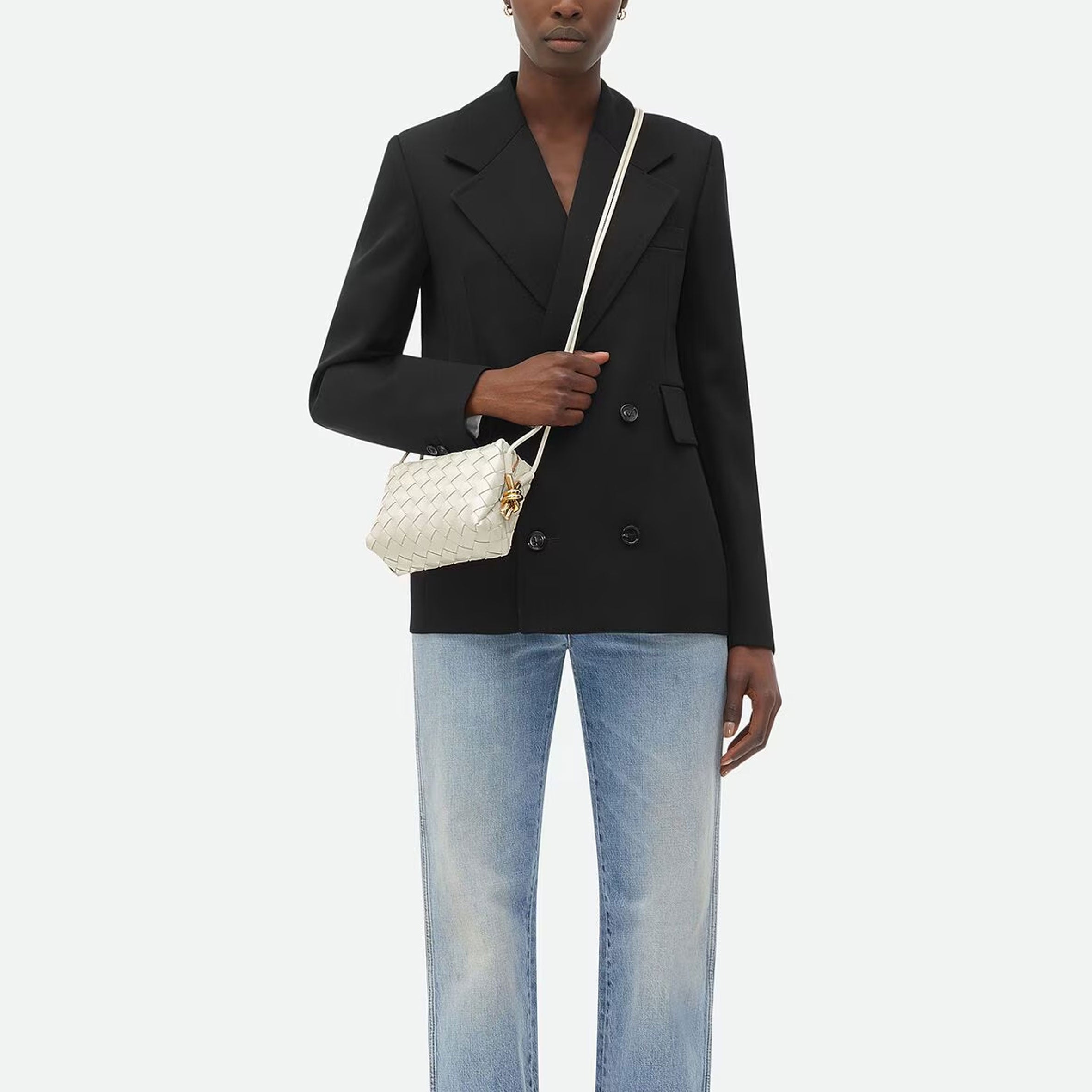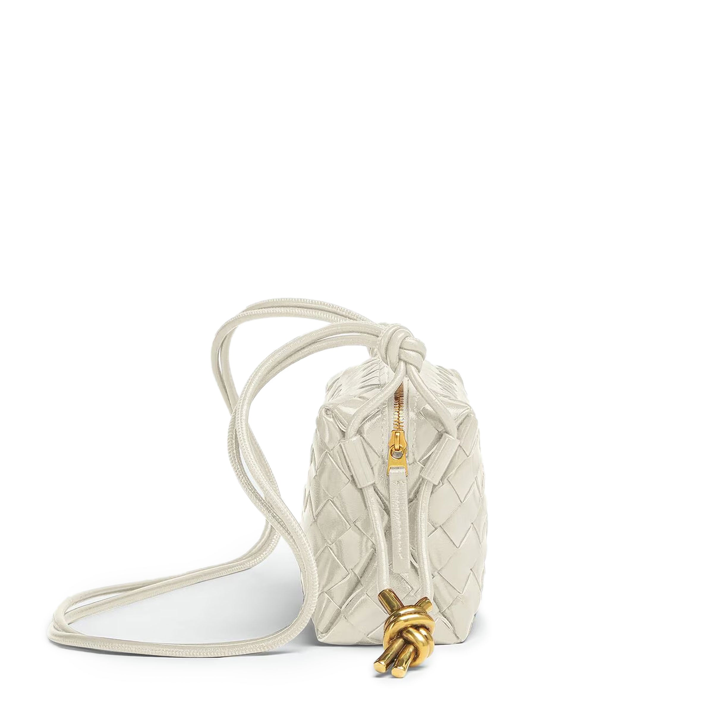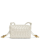Bottega Veneta's Loop Mini bag is woven in the designers distinguishable intrecciato weave. This crossbody bag has a soft edge boxy shape crafted from lamb leather and features double knotted brass side details on the strap, zip top closure and internal leather lining with one slot pocket.