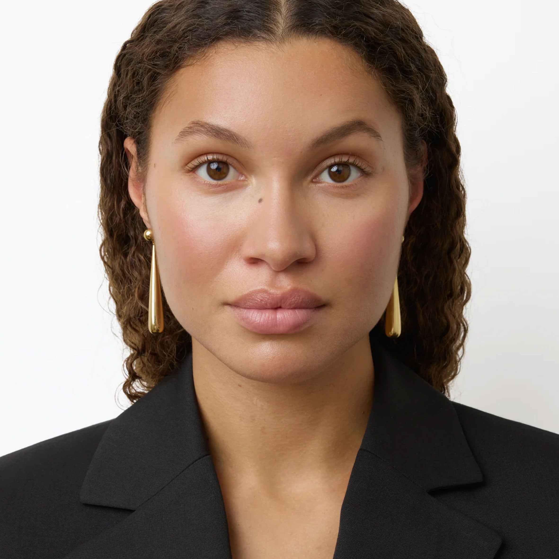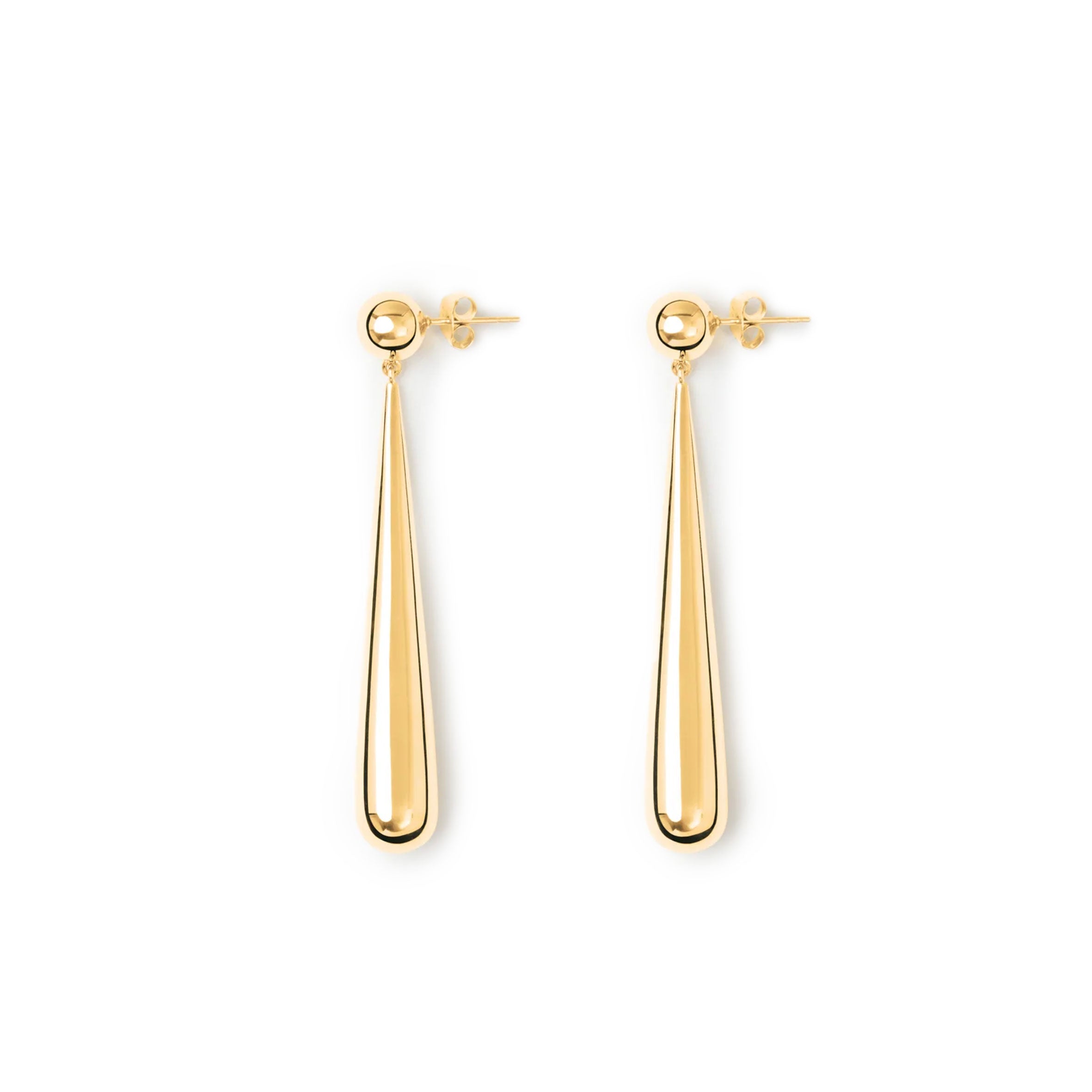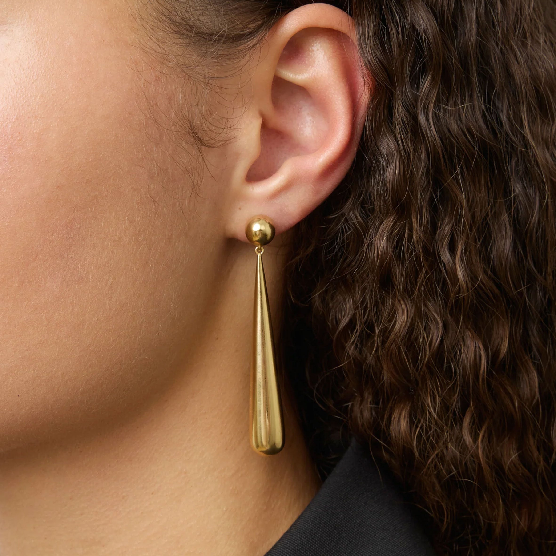 The Louise Earrings are made from 18 carat gold plated sterling silver, and feature a stud earring with an oblong drop shaped pendant.
