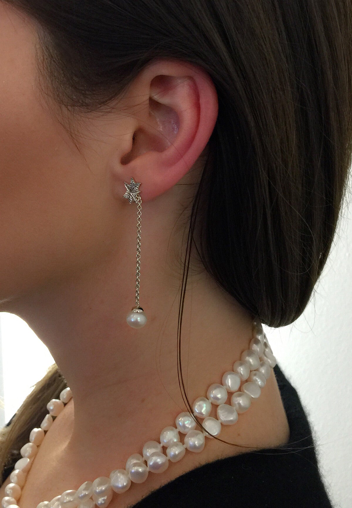 Single Sterling Silver earring stud with Palm pattern and dangling Akoya Fresh Water Pearl.
