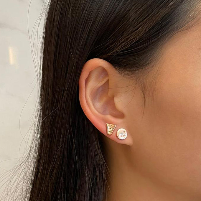 Asymmetrical rose gold studs with signature Lucy Folk detailing.