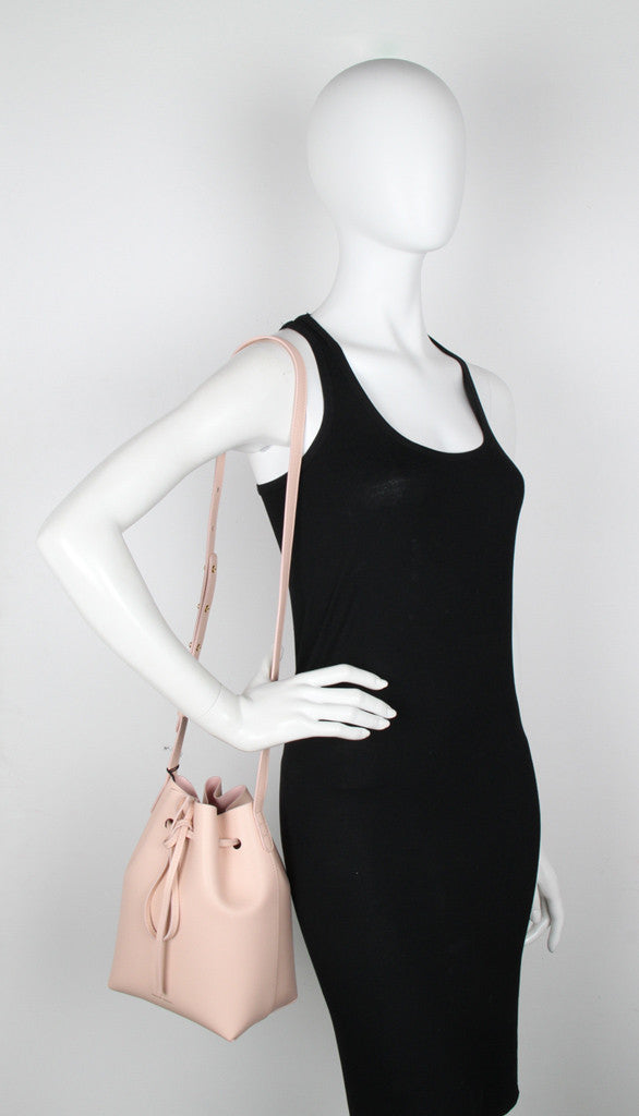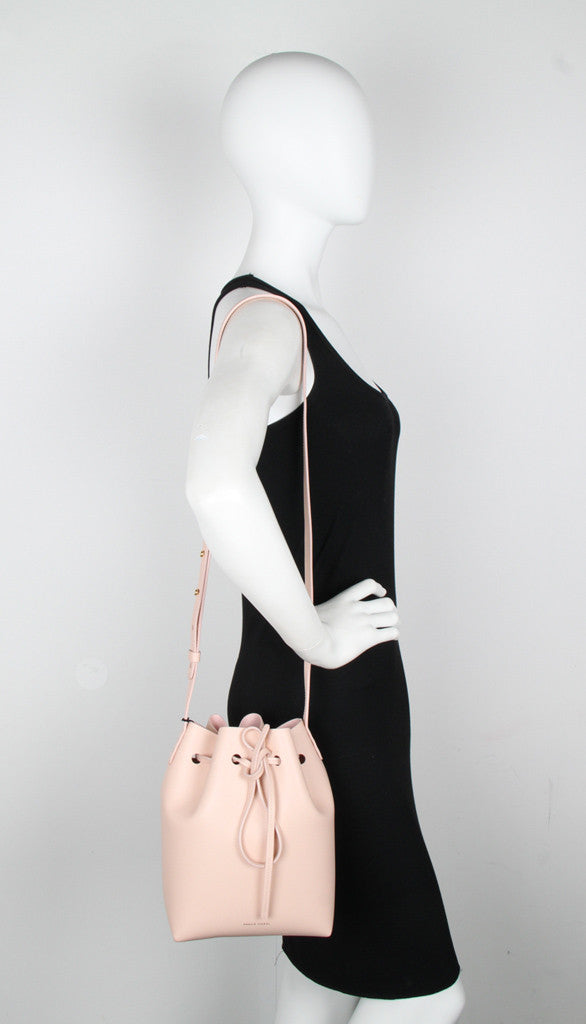Italian calf leather light pink bucket bag with light pink interior matte patent. Detachable wallet and adjustable strap.