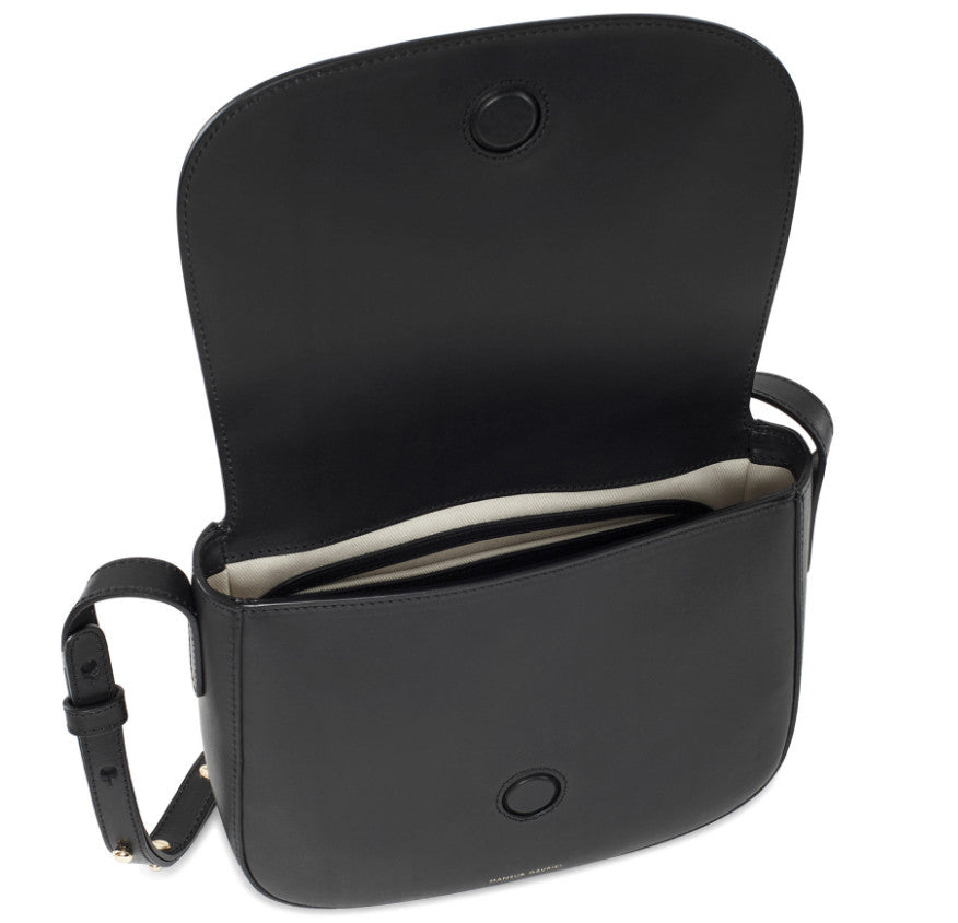 Italian vegetable tanned black leather crossbody with beige canvas interior. Interior pocket. Magnetic closure and adjustable strap.