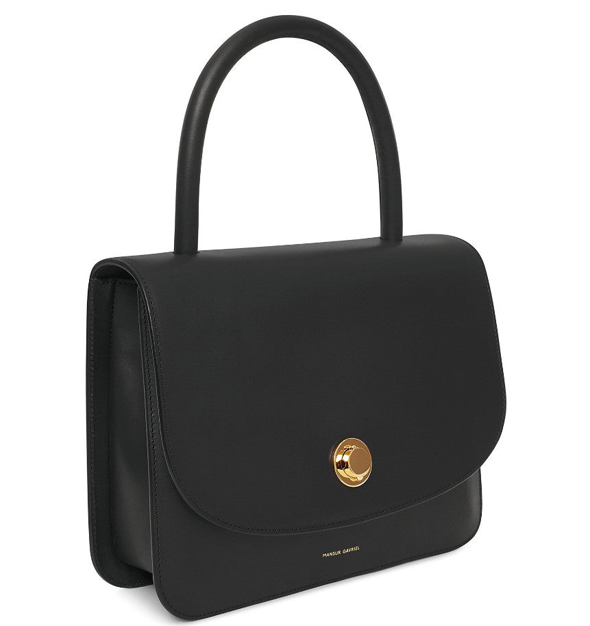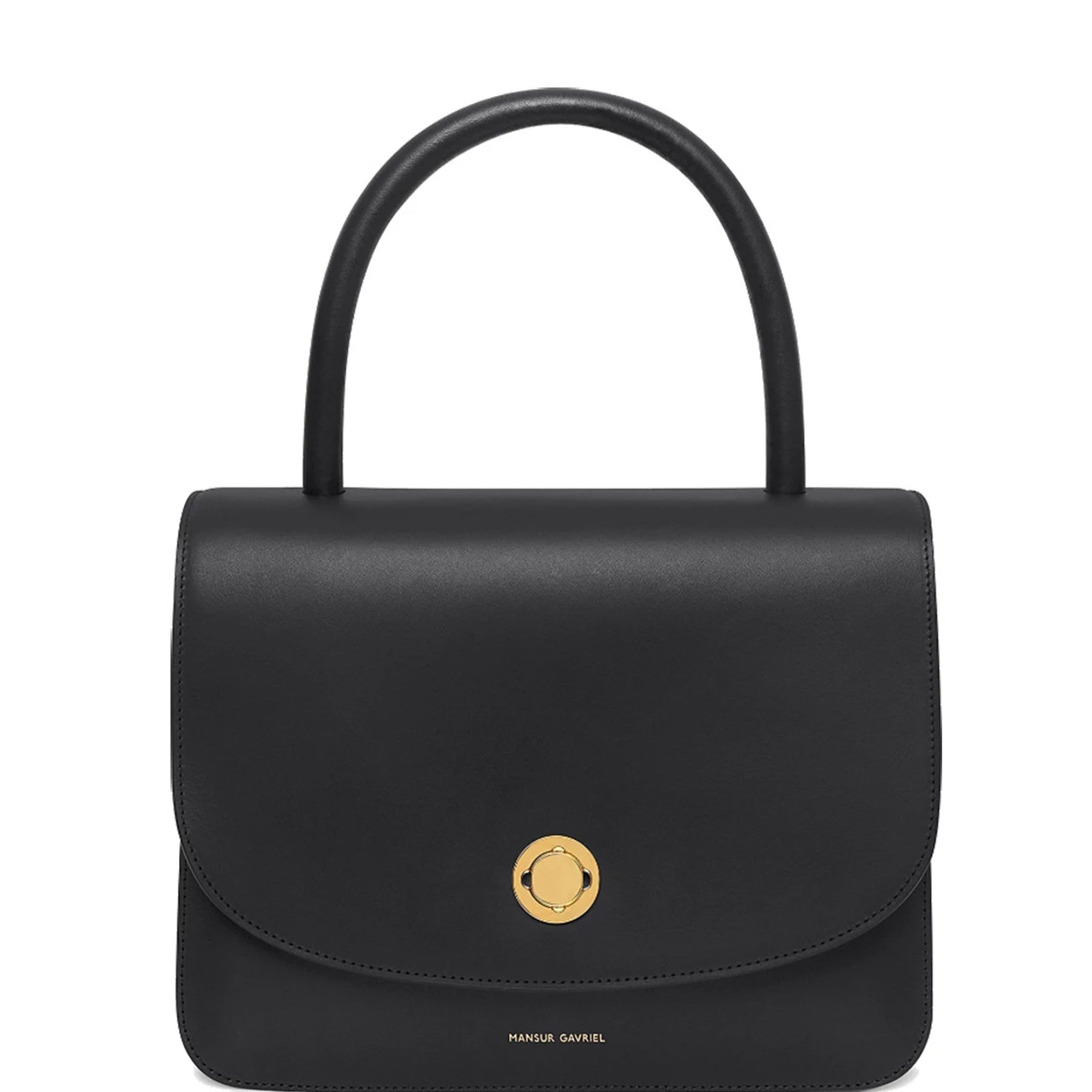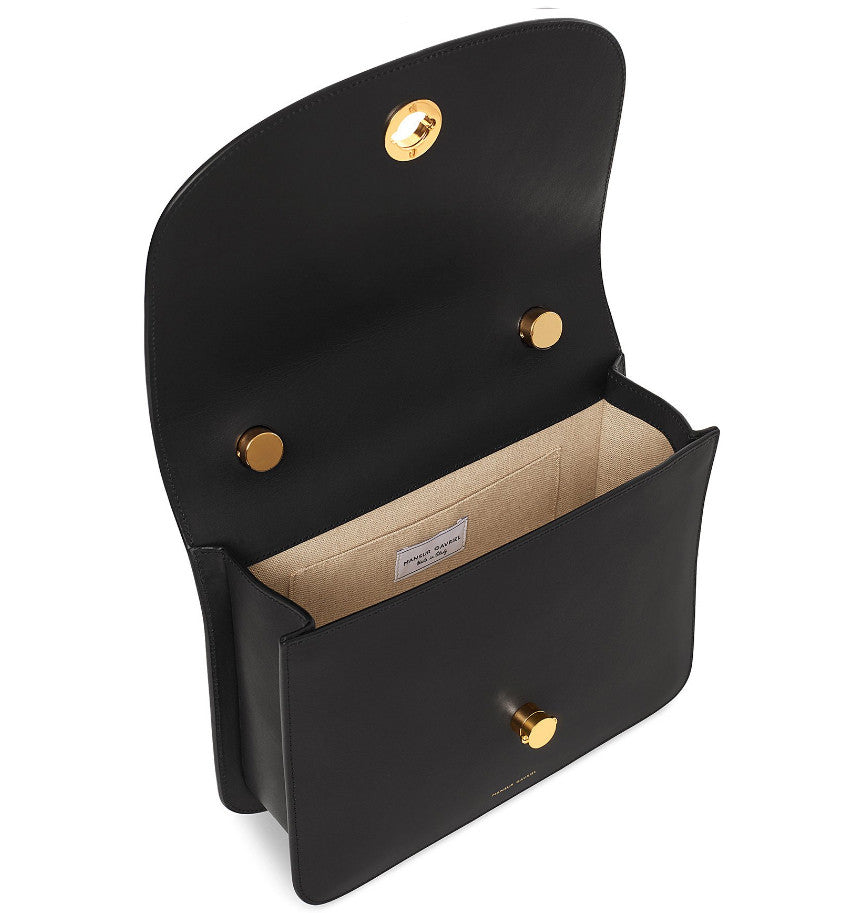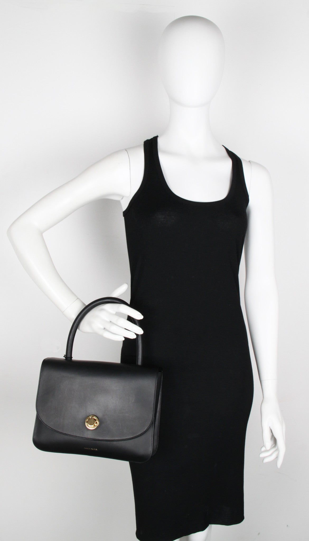 Italian vegetable tanned leather black metropolitan bag with beige canvas interior. Top handle, interior side pocket and goldtone turnlock closure.