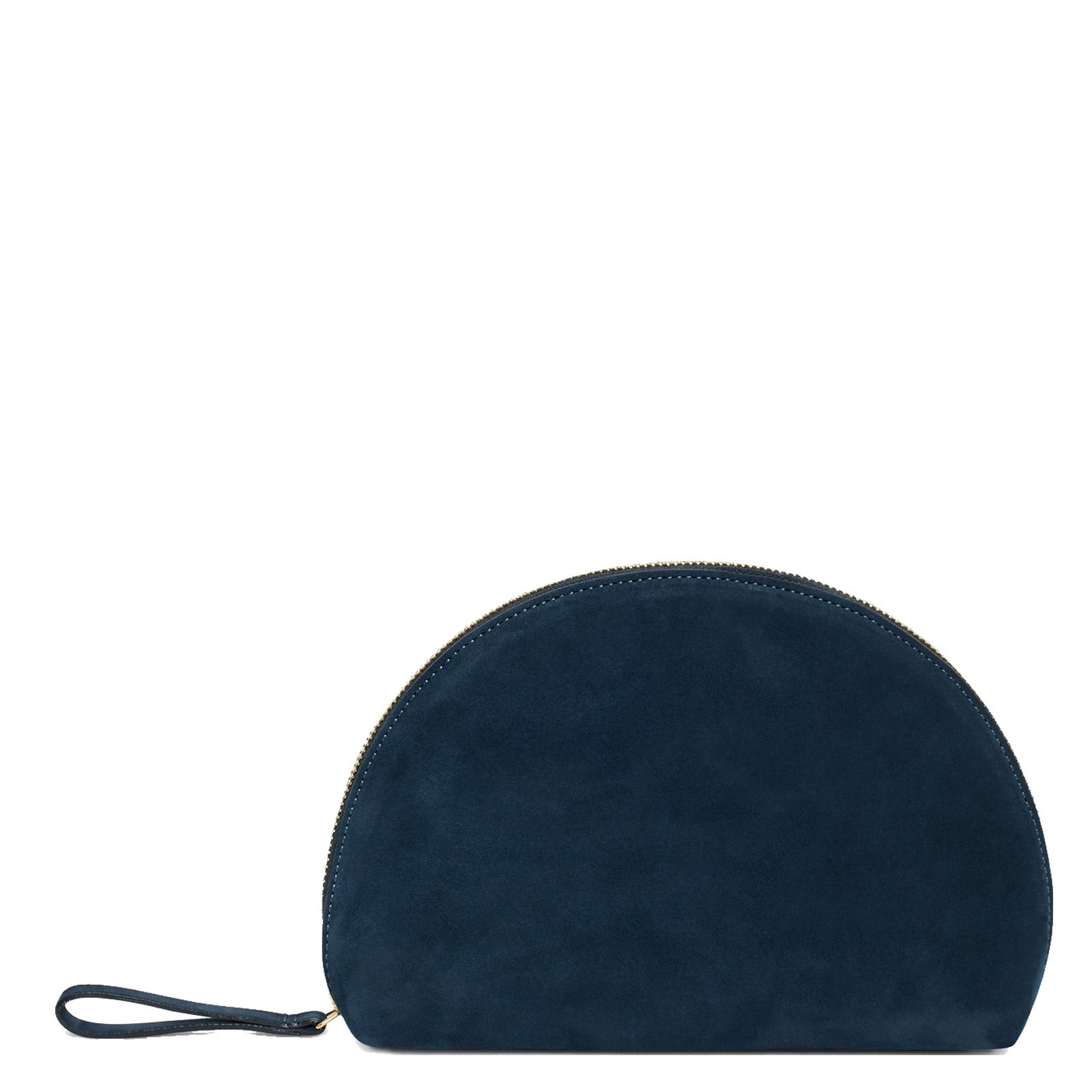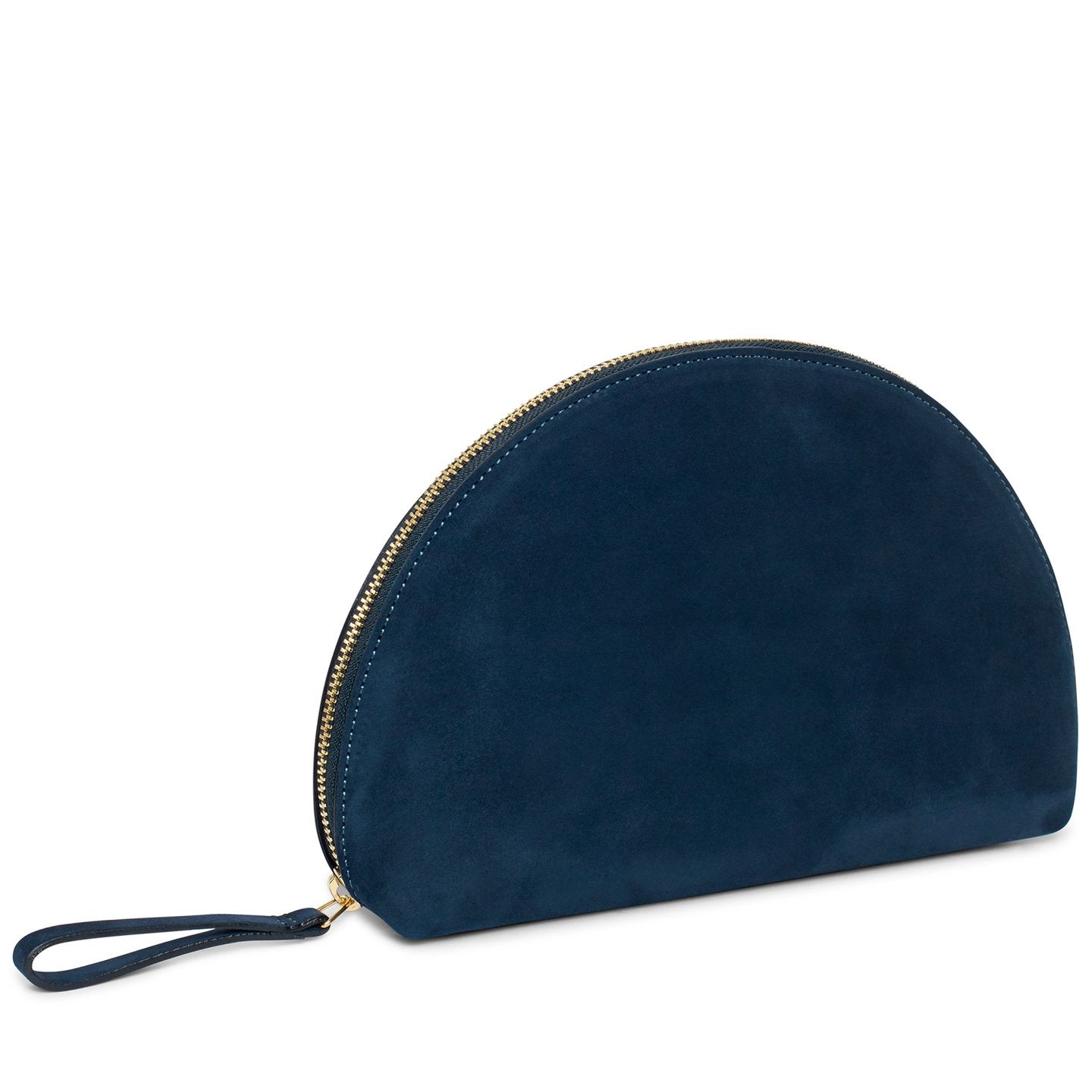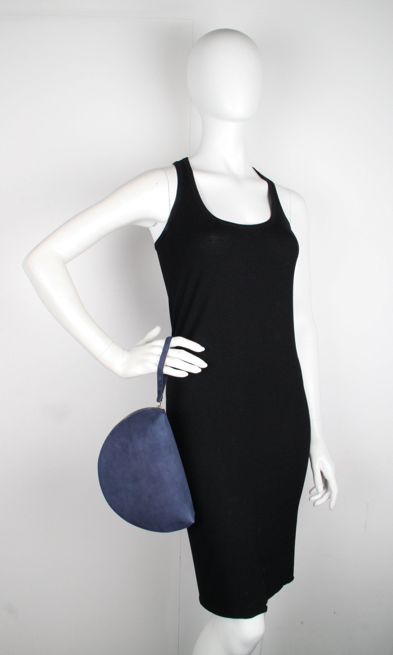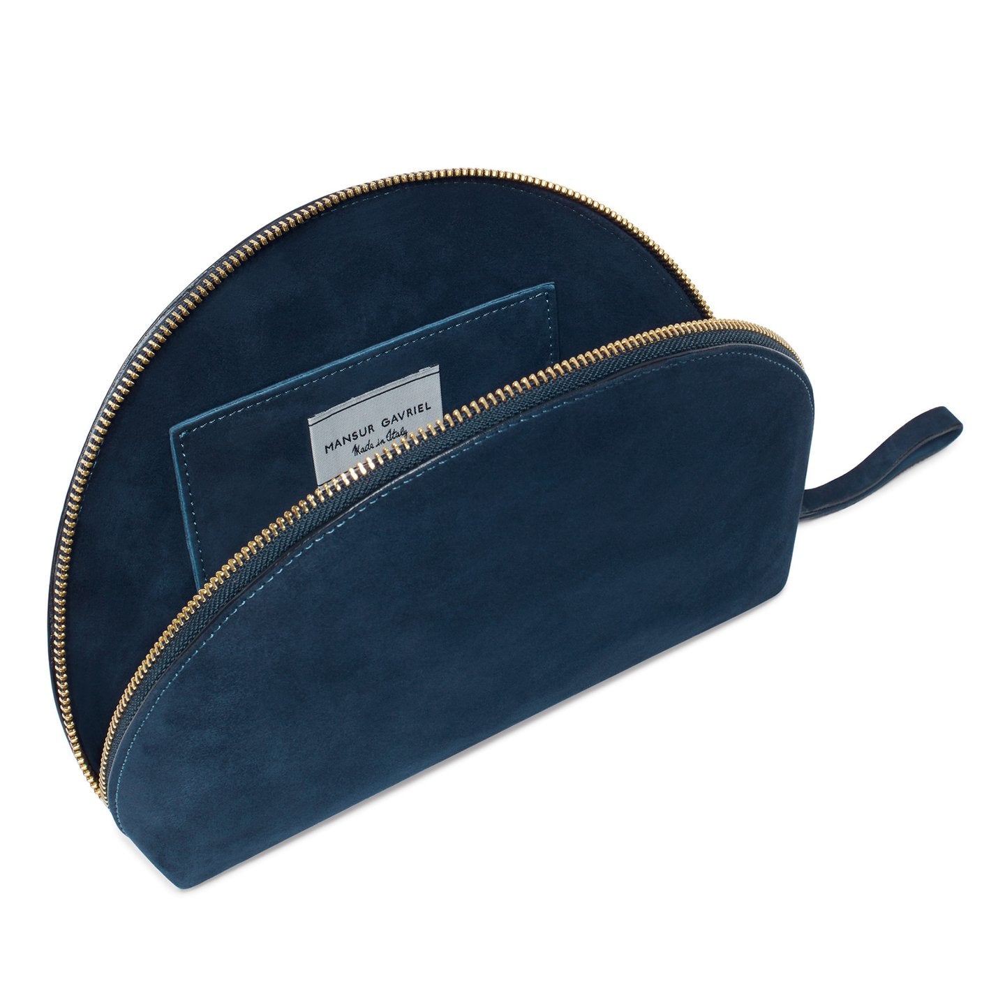 Italian suede leather navy mini moon clutch with a navy suede leather interior and wristlet function.