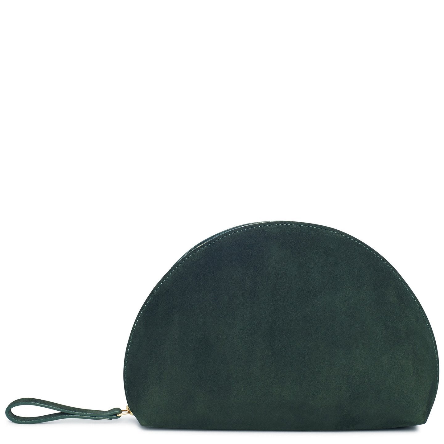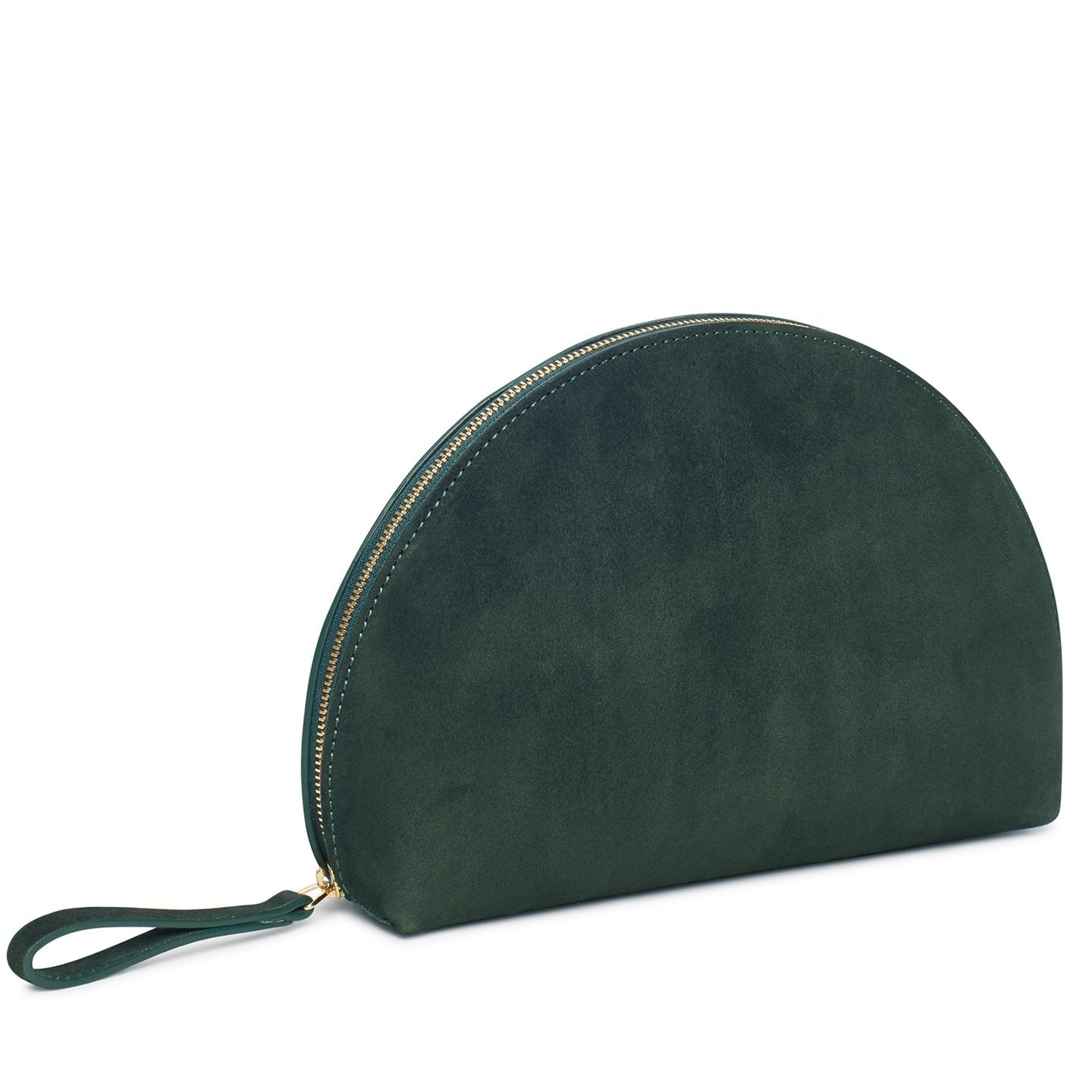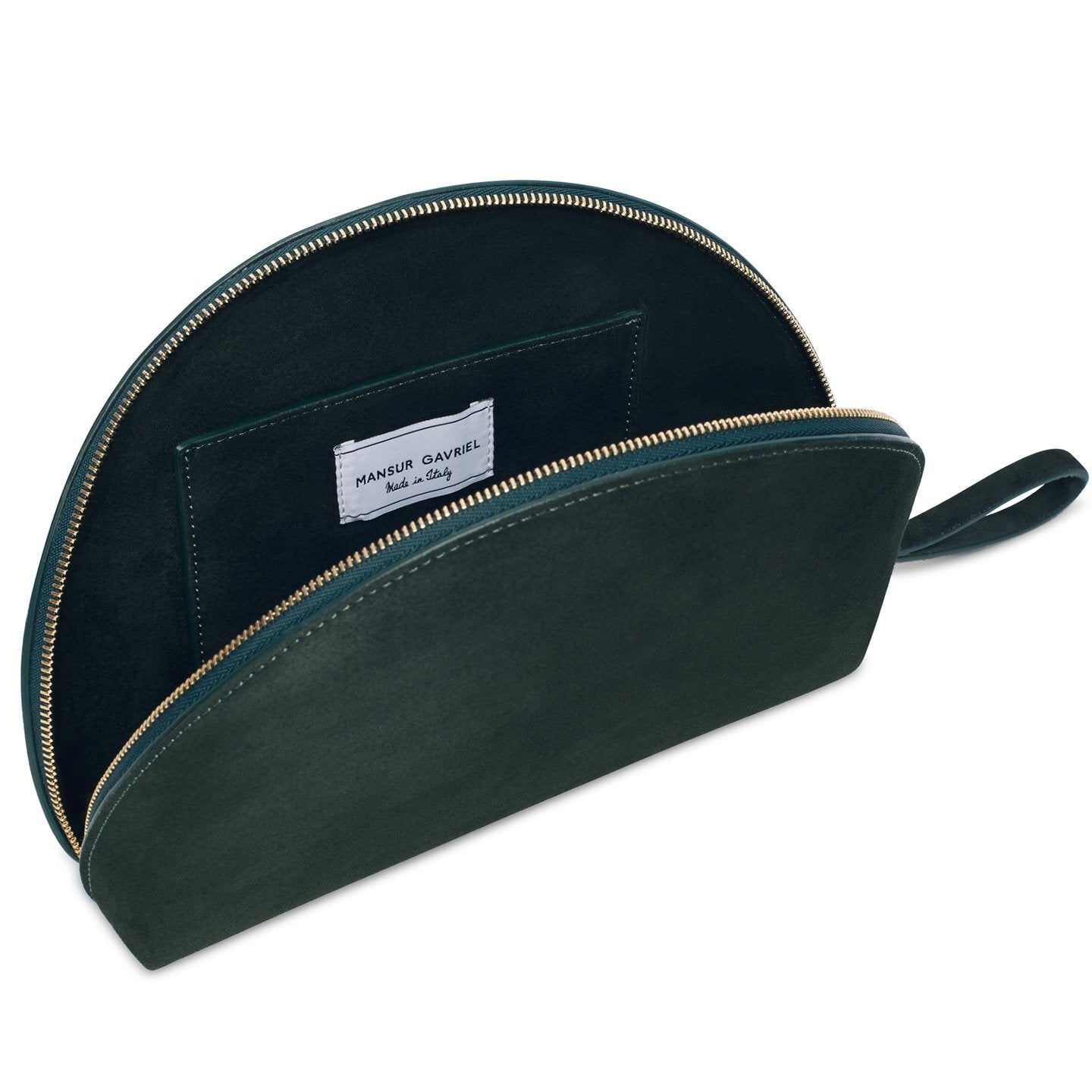 Italian suede leather moss mini moon clutch with moss suede leather interior with a wristlet function.