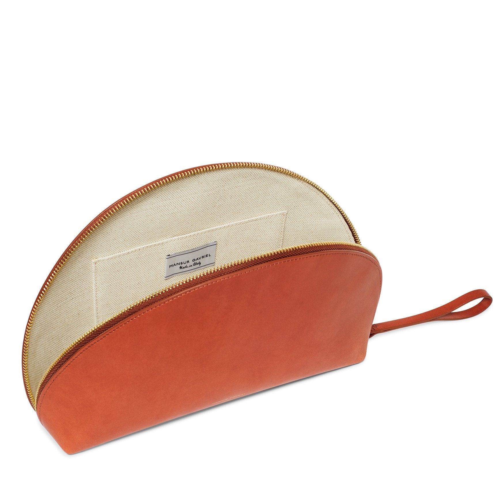Italian vegetable tanned leather brandy mini moon clutch with beige canvas interior. Interior pocket and zip closure. Features a wristlet function.