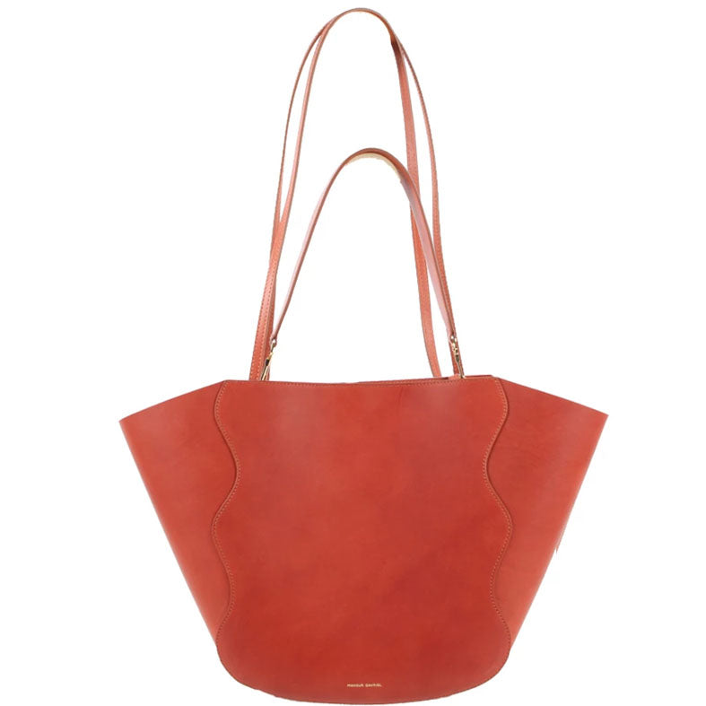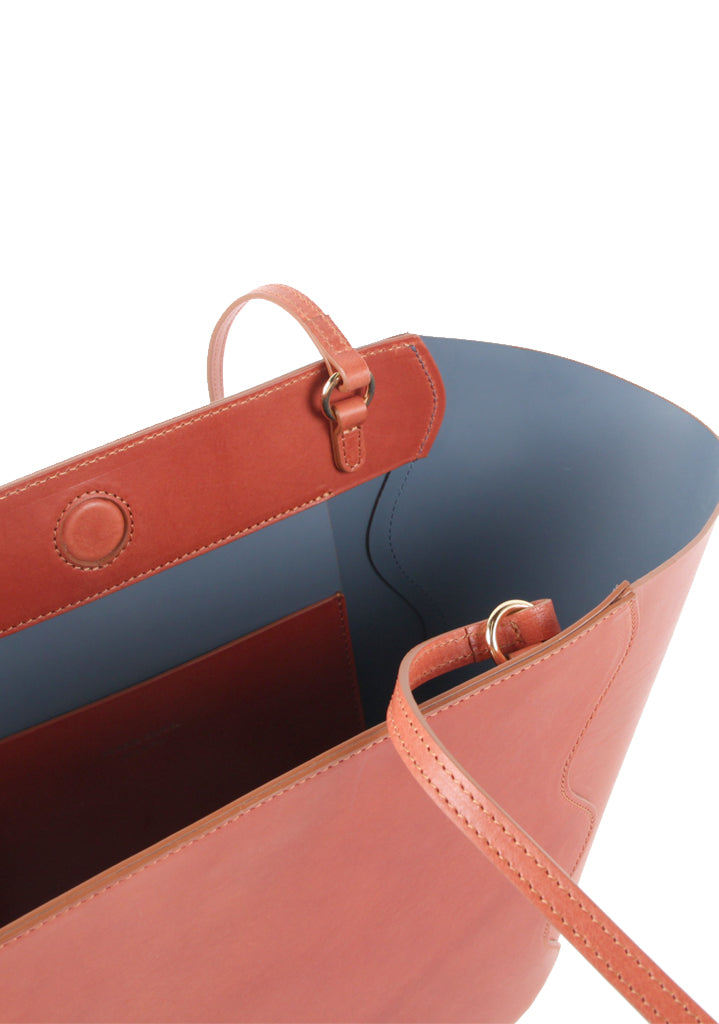 Italian vegetable tanned leather brandy brown ocean tote with avion blue matte patent interior. Two straps lengths offer multiple ways to wear the tote. Magnetic closure. Gold tone hardware. One interior compartment.