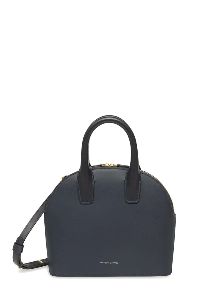 Italian calf leather mini top handle bag with matte patent interior. Two-way zip closure and interior side pocket. Detachable adjustable shoulder strap.