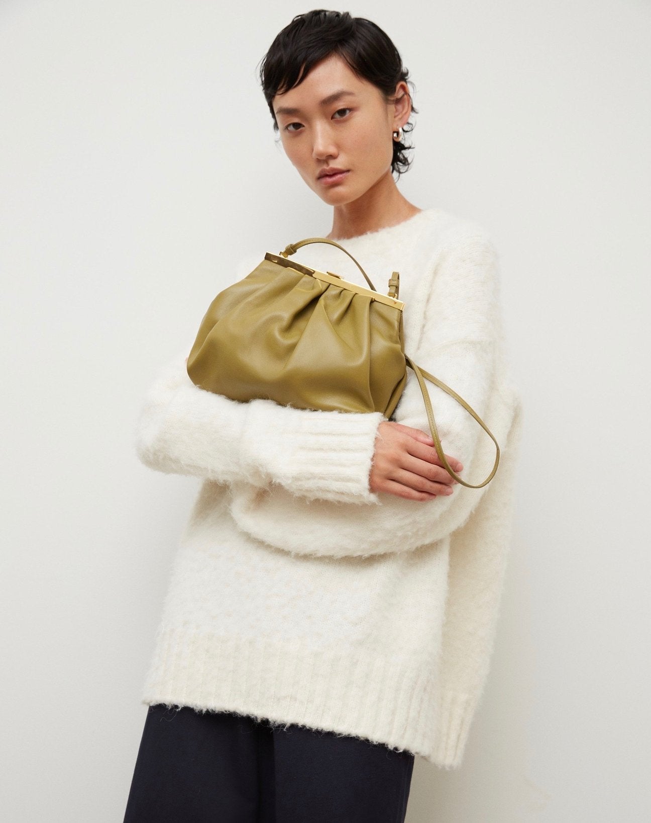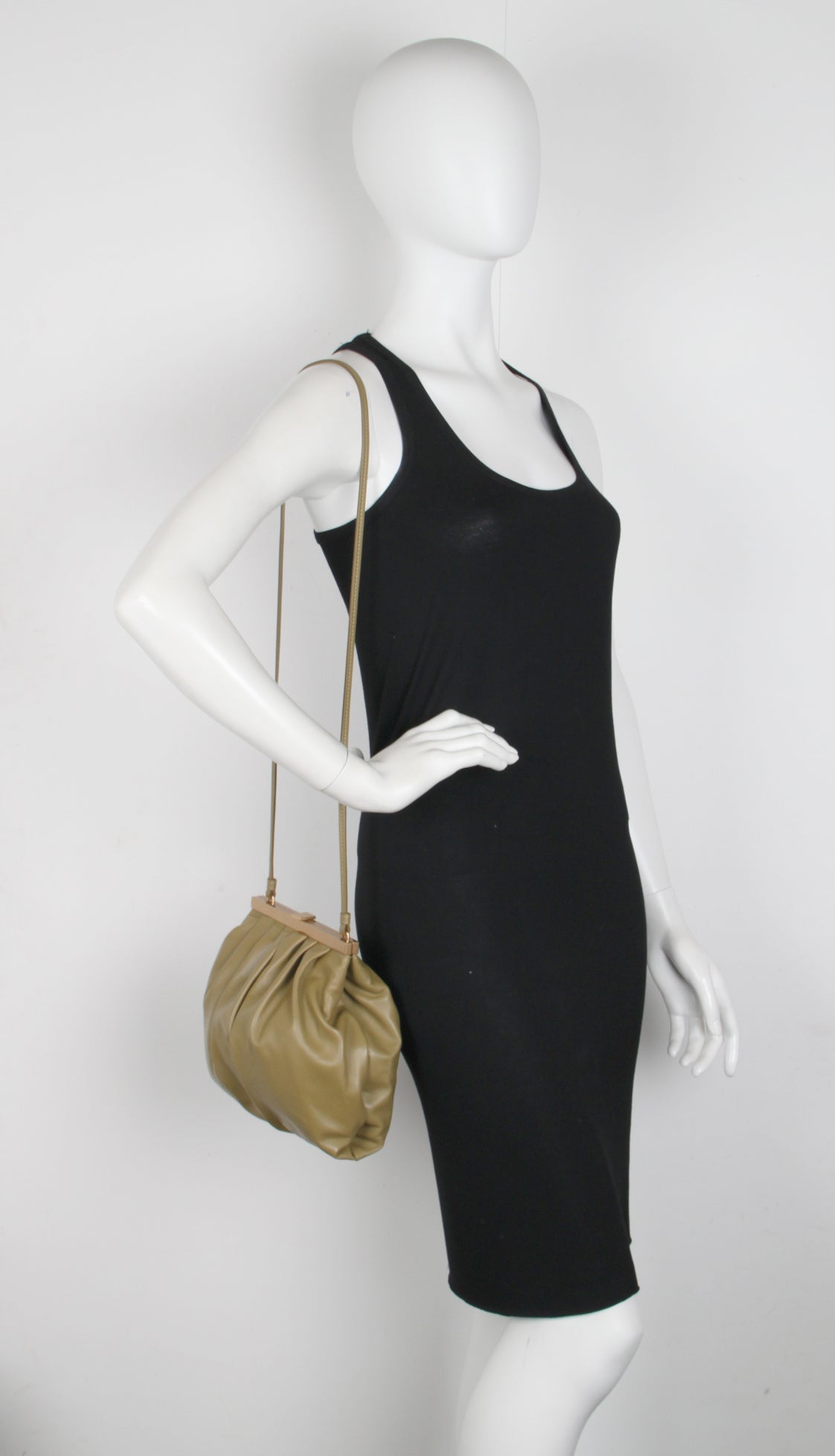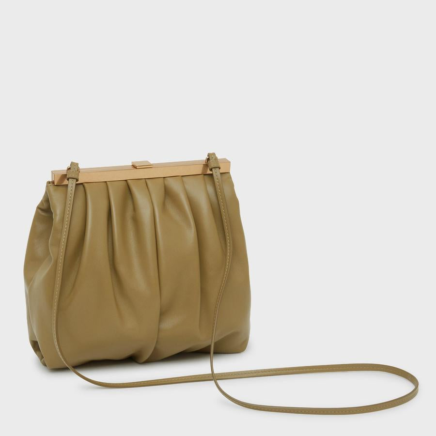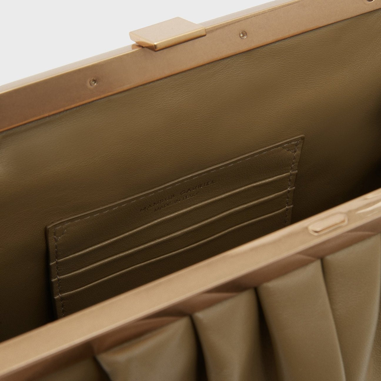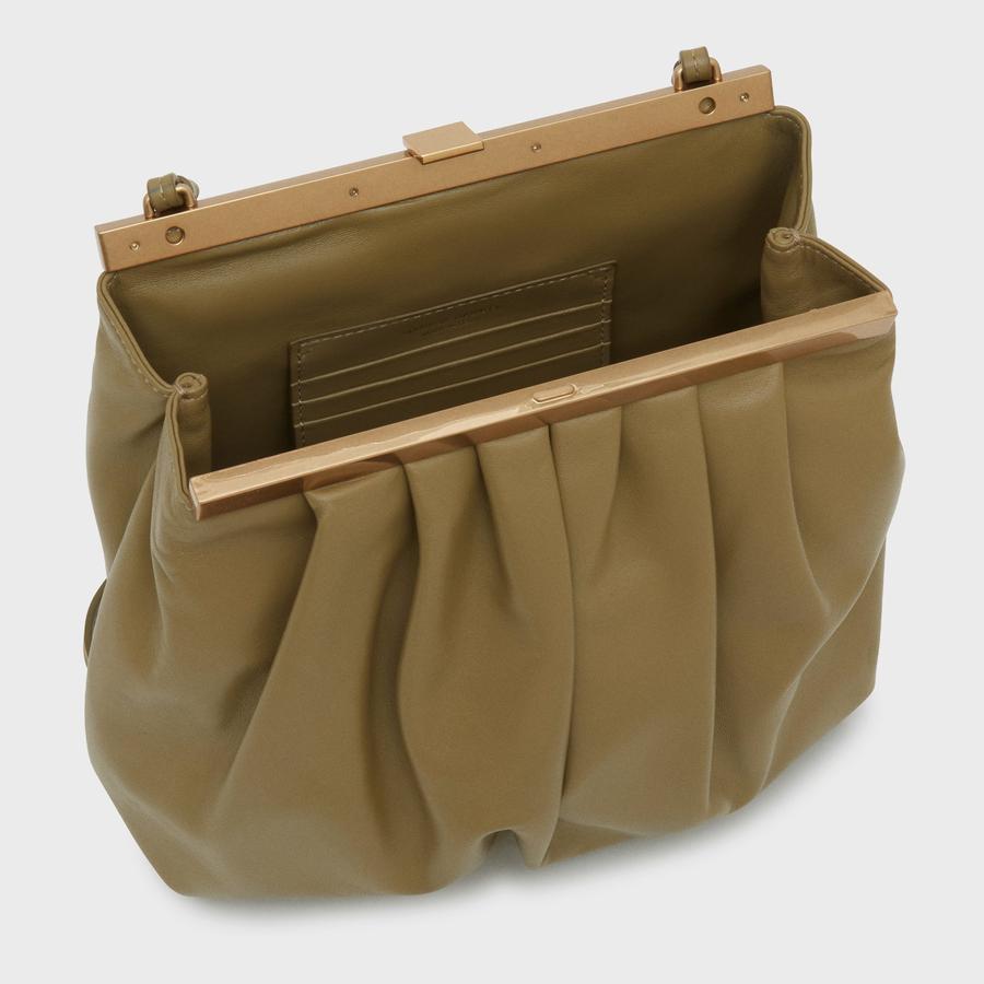 Made from buttery smooth lambskin leather that folds into soft natural pleats and topped with a gold-tone magnetic frame closure, the Frame Crossbody is designed to be a perfect mix of edge and ease. The matching leather interior features one main compartment, three card slots, and a gold foil stamp.