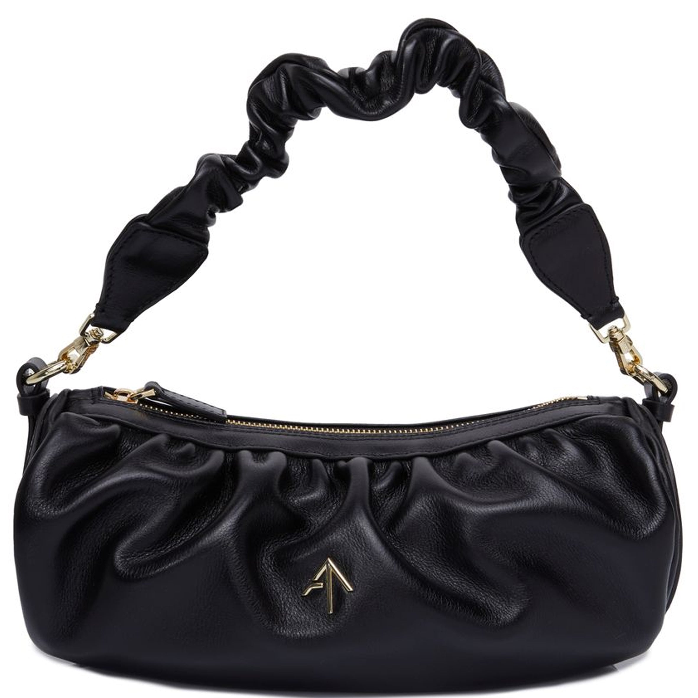 This Manu Atelier Cylinder bag features a top zip fastening, gold tone metal logo detailing at the front, a detachable additional ruched strap with gold tone hardware. Constructed from smooth leather.