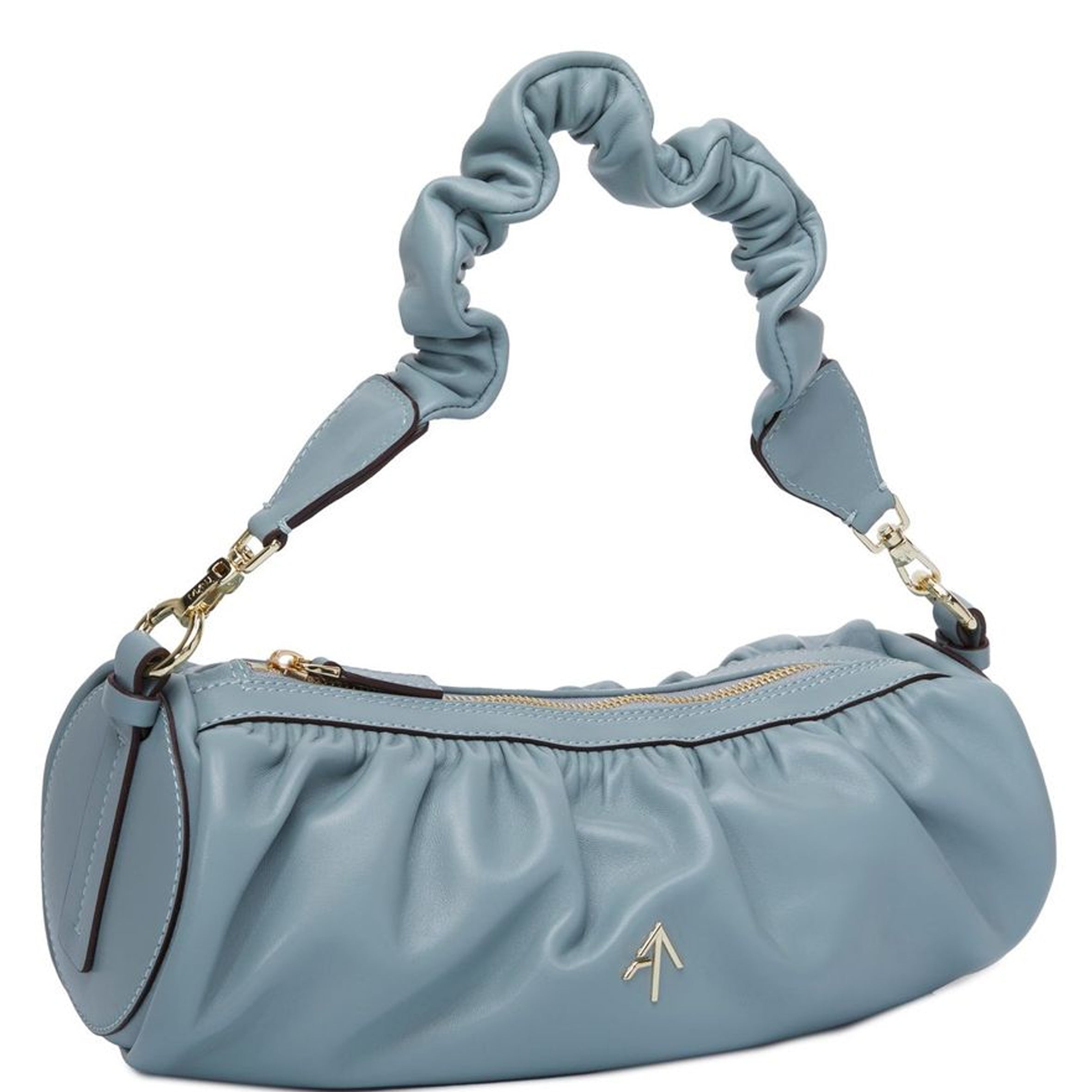 This Manu Atelier Cylinder bag features a top zip fastening, gold tone metal logo detailing at the front, a detachable chain shoulder strap and additional gold tone hardware. Constructed from smooth leather.