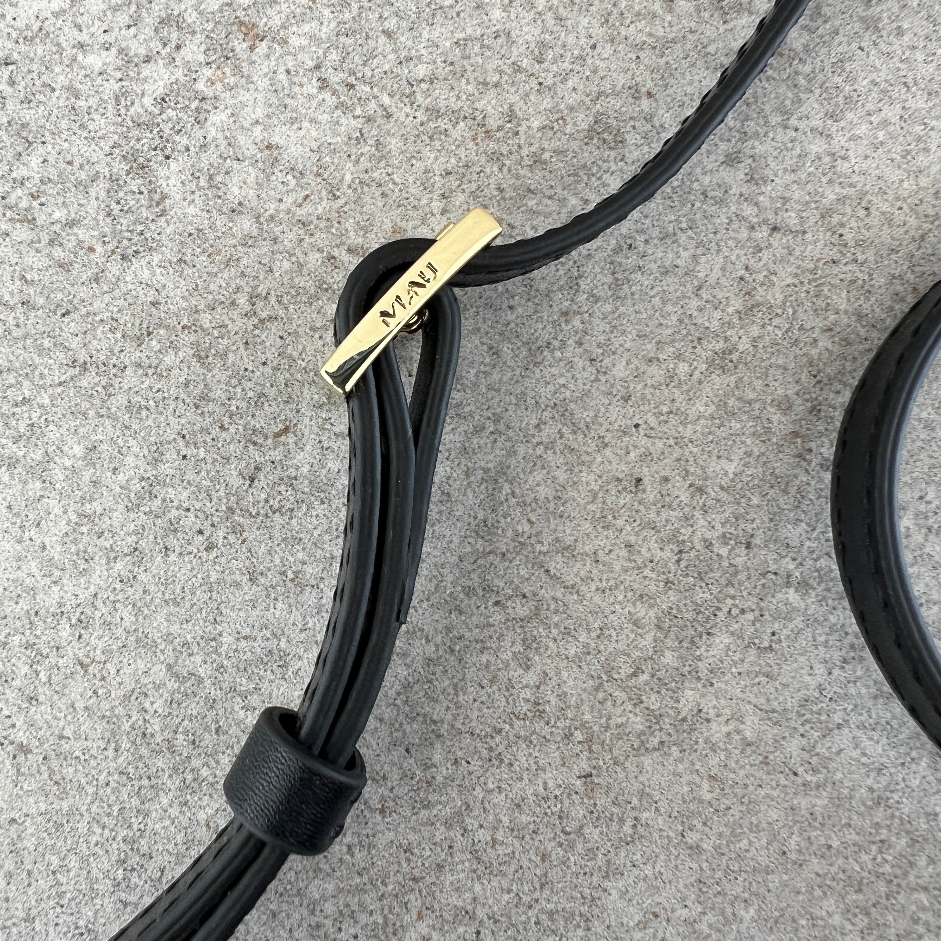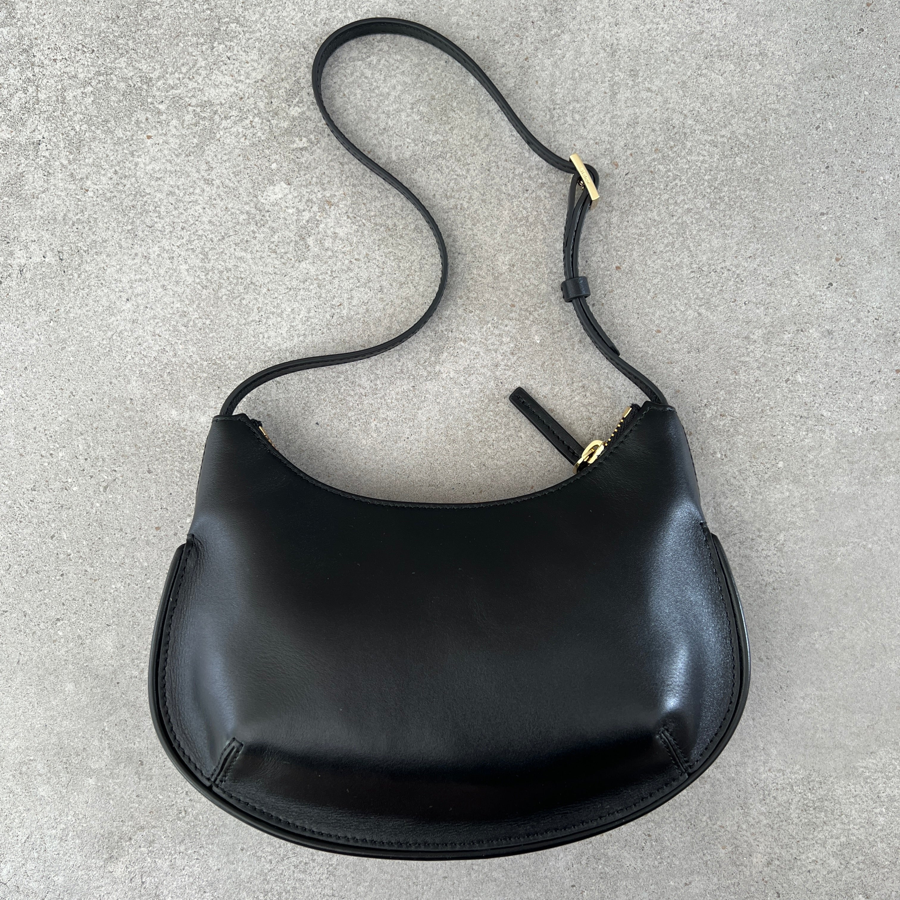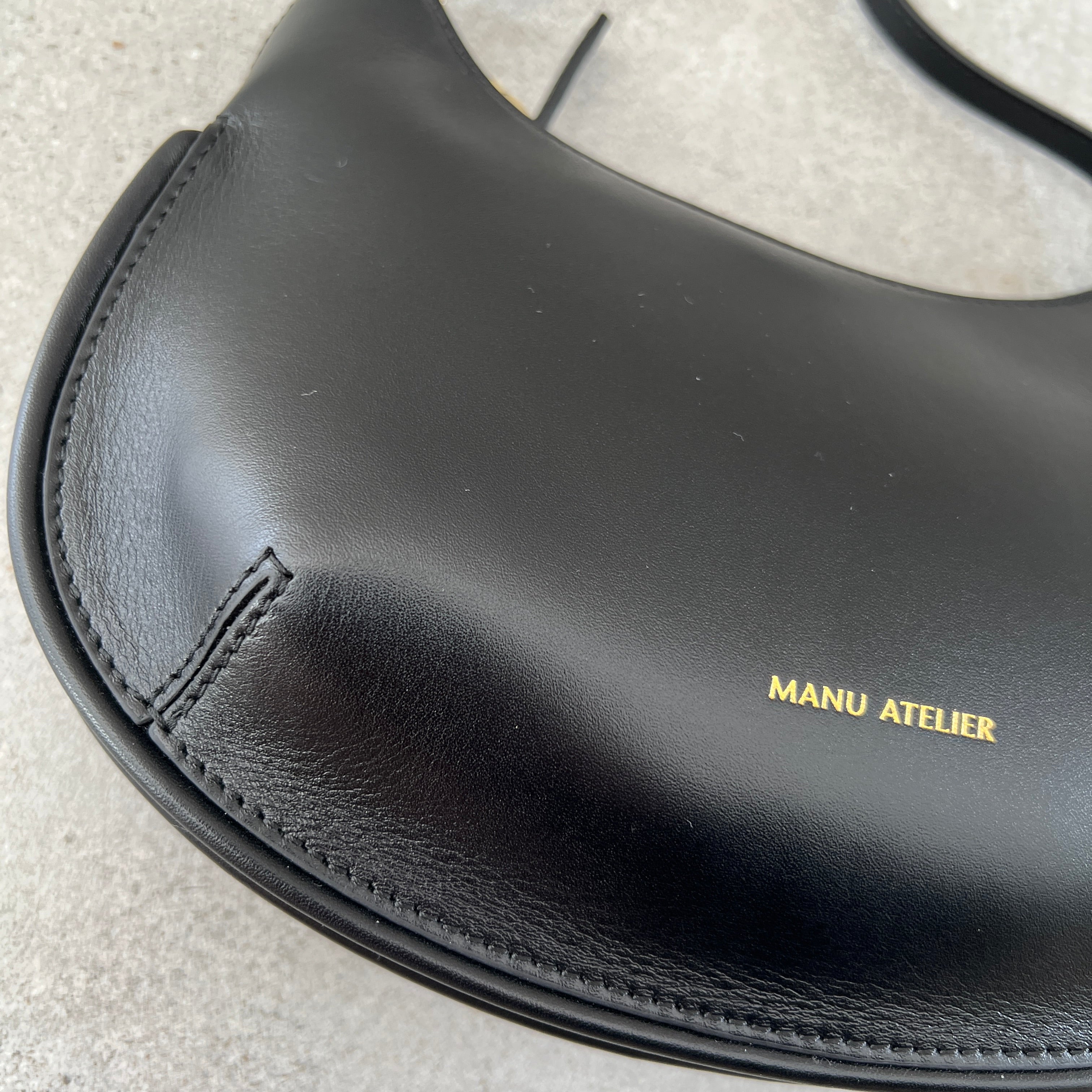 A shoulder bag featuring soft calfskin leather with a Manu Atelier embossed logo. It features an adjustable black leather strap and an interior zipped pocket.