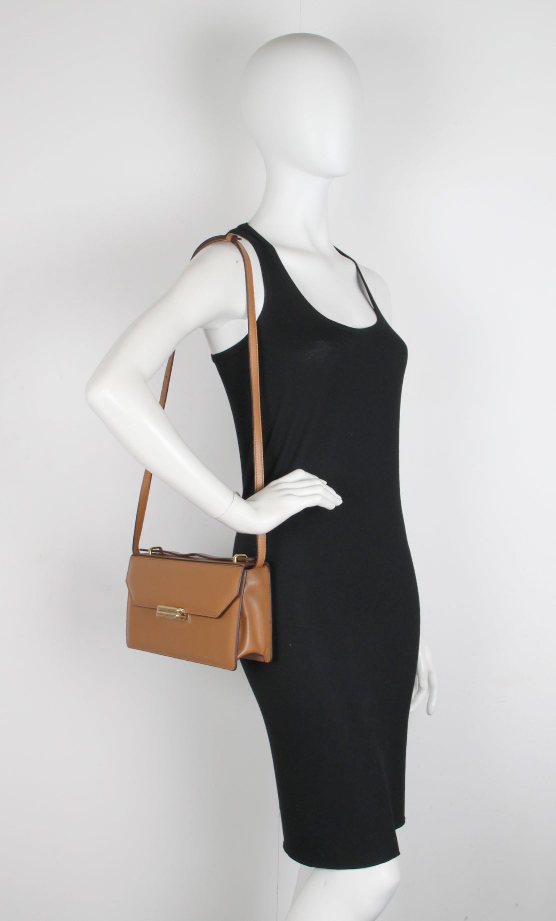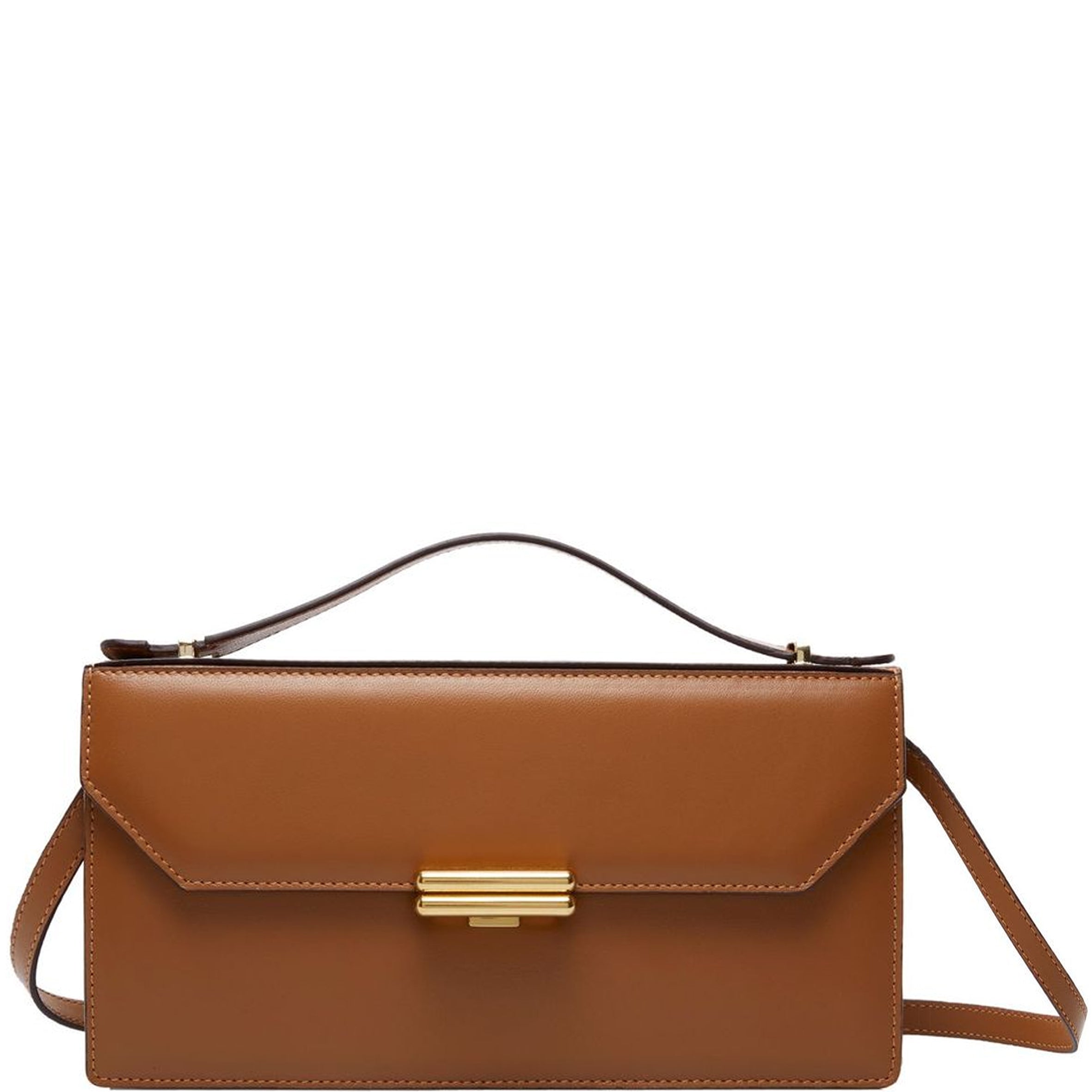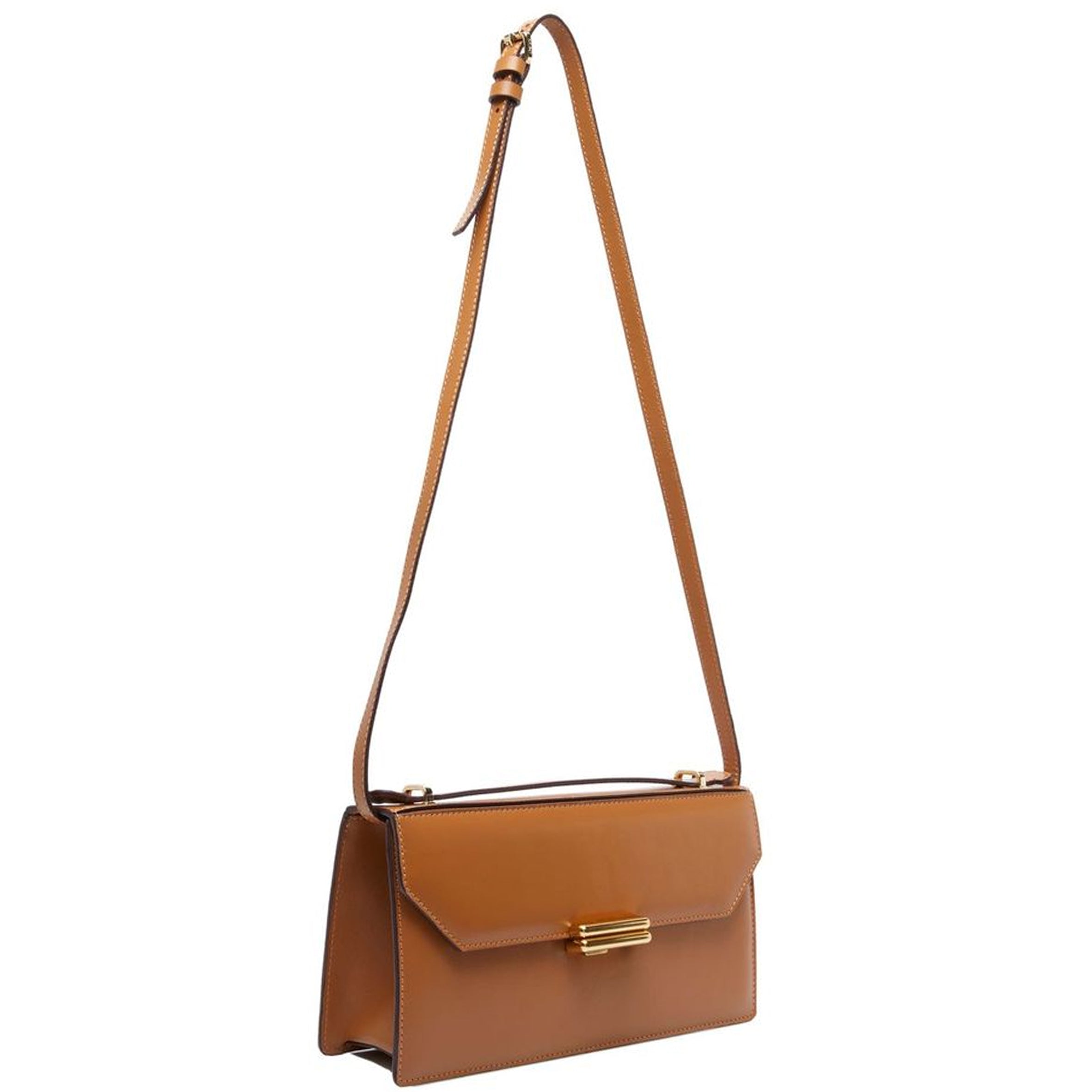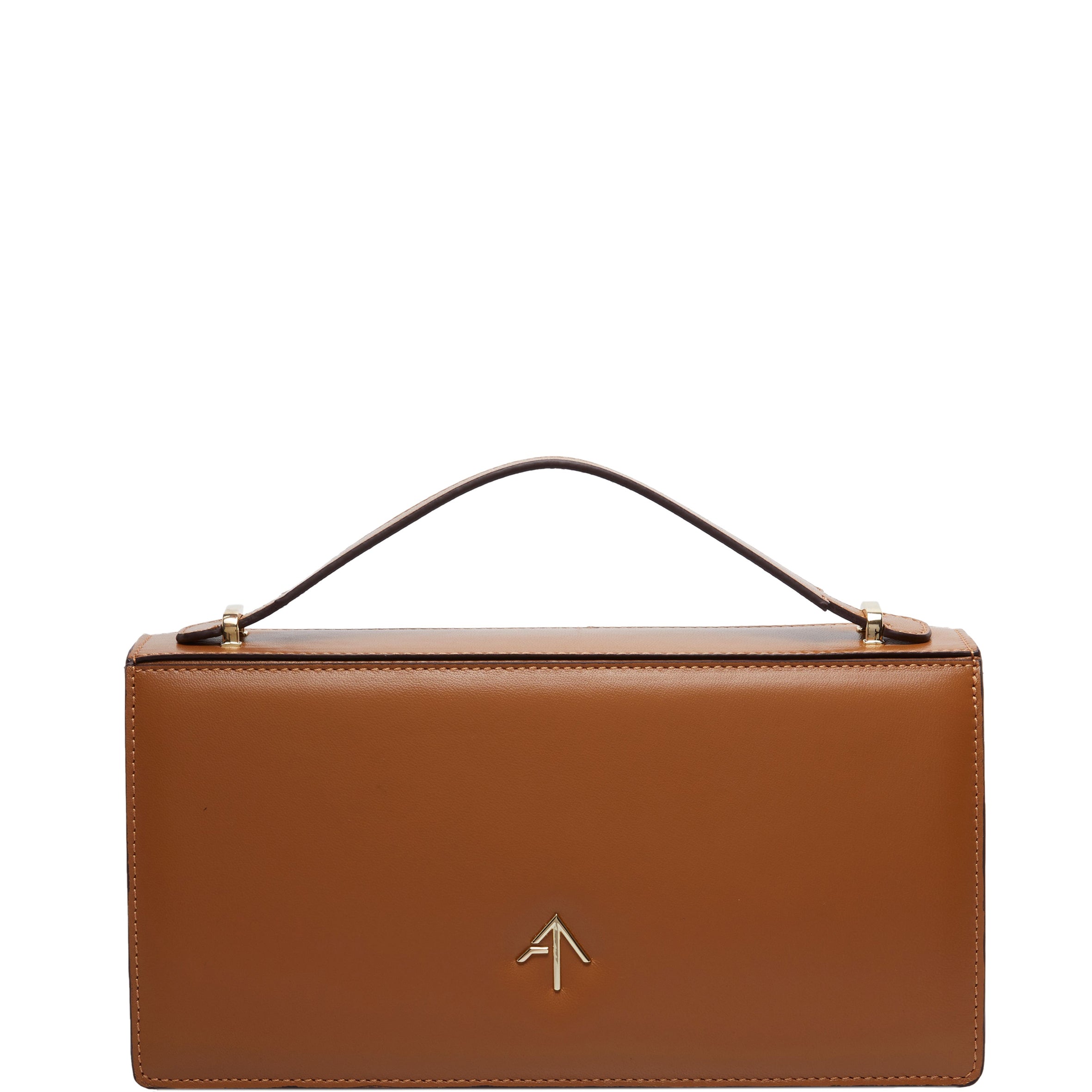 The Manu Atelier Jackie Satchel is a long satchel style with a top handle and adjustable leather strap. Featuring a push lock closure and brass toned hardware.