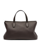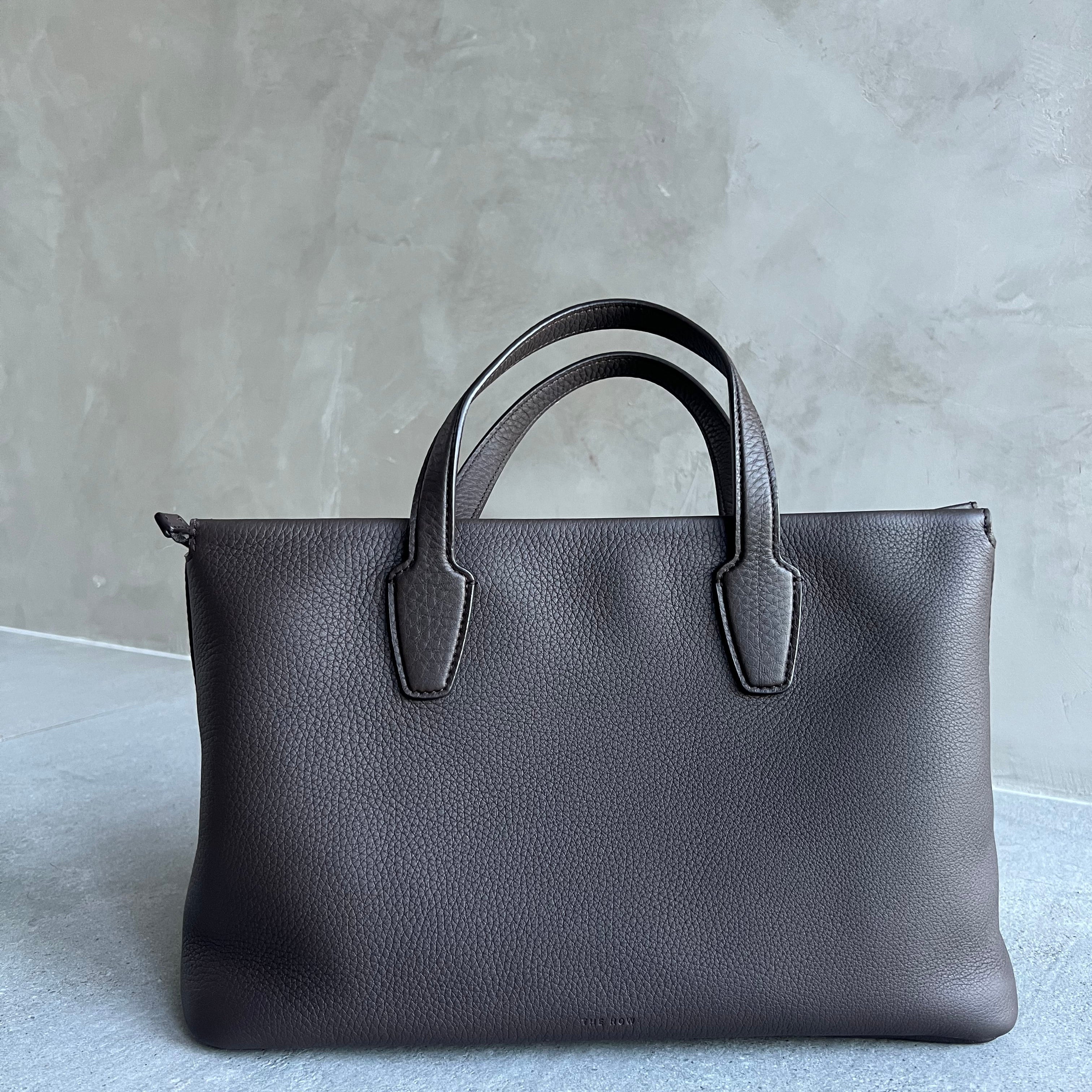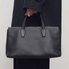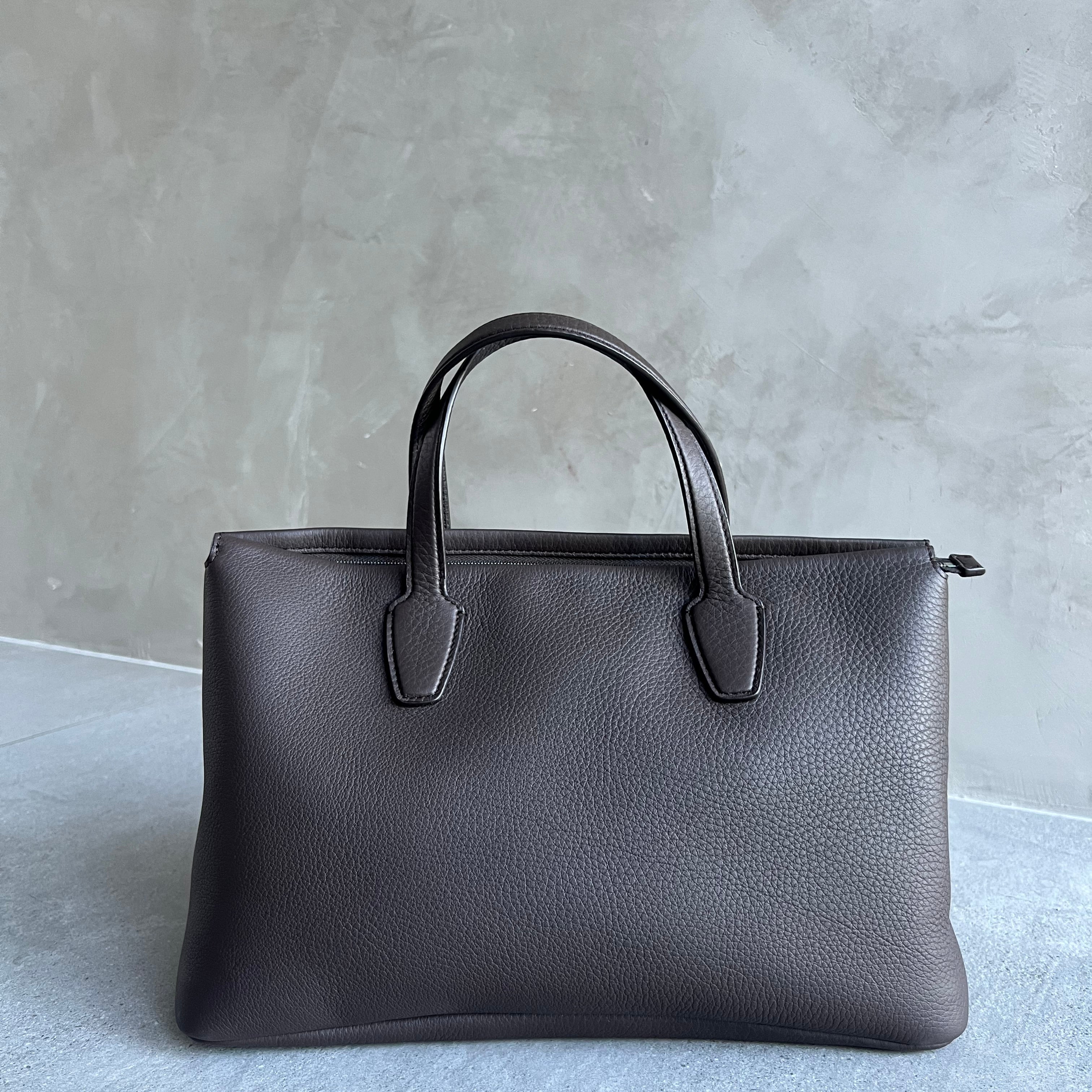 Top handle bag in textured calfskin leather with flat handles, overlap construction, and concealed top zipper closure. The softly structured silhouette is lined in smooth nappa with a folded top edge for a refined finish. Minimally finished, the natural grain surface is left intact, giving the leather a supple hand and refined texture that develops character over time.