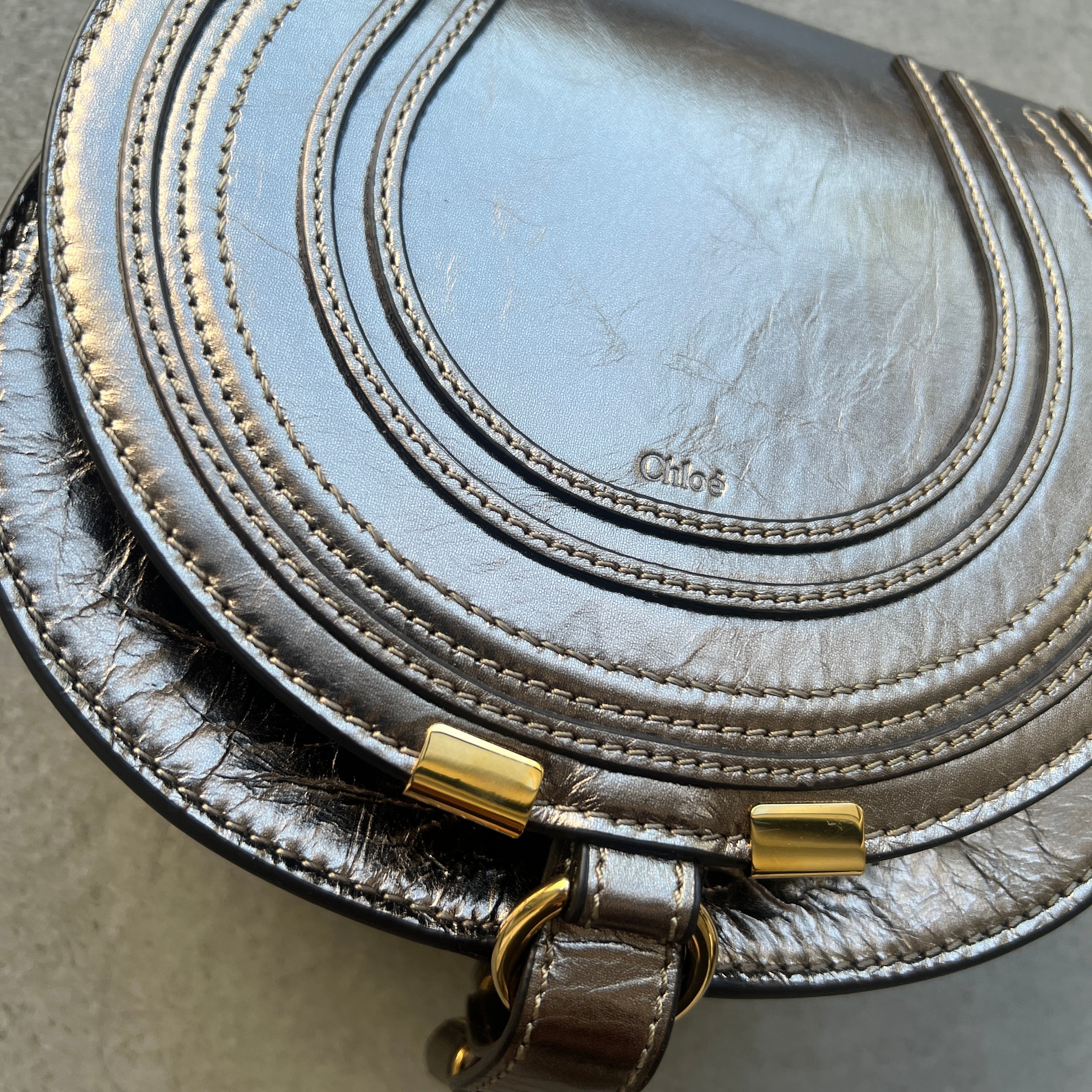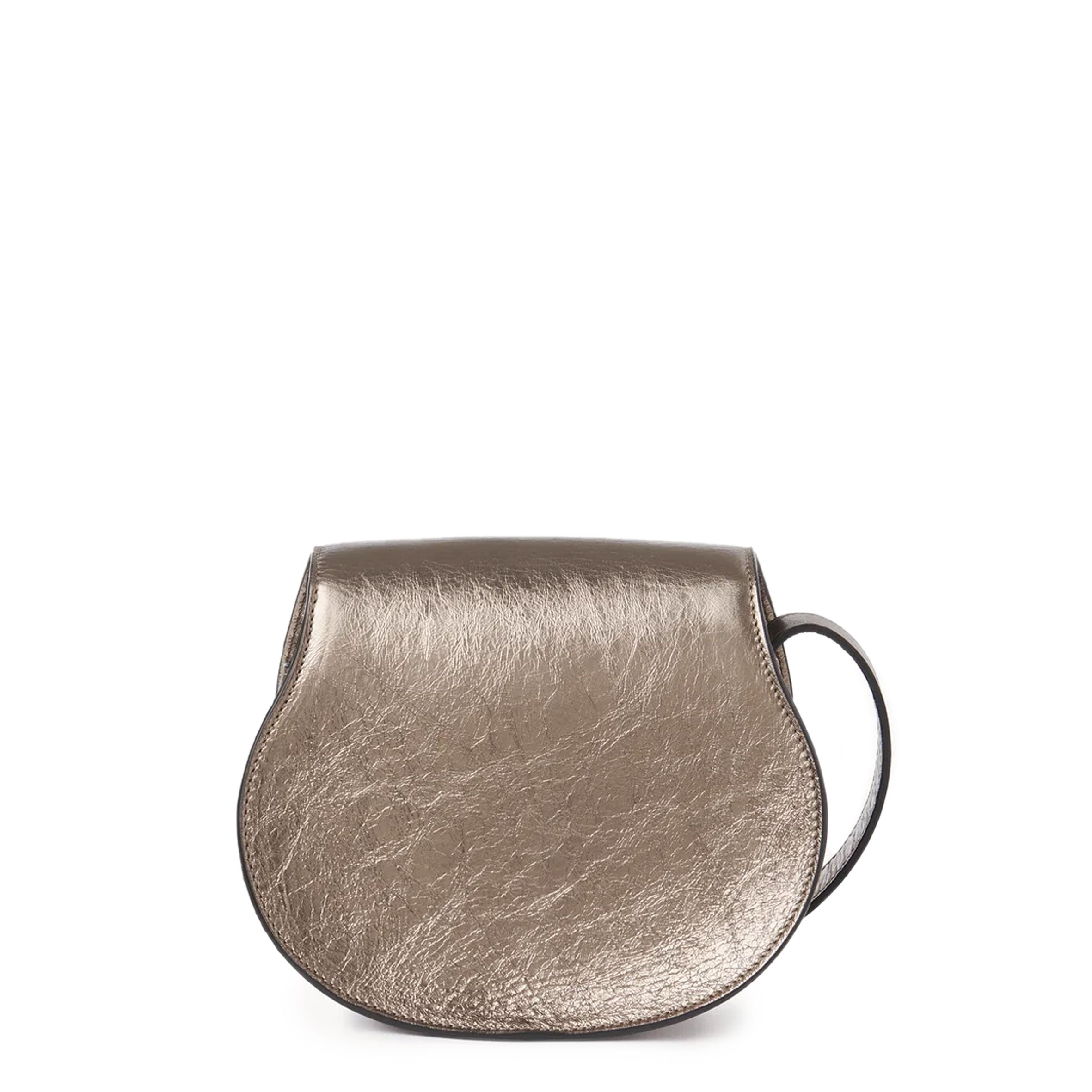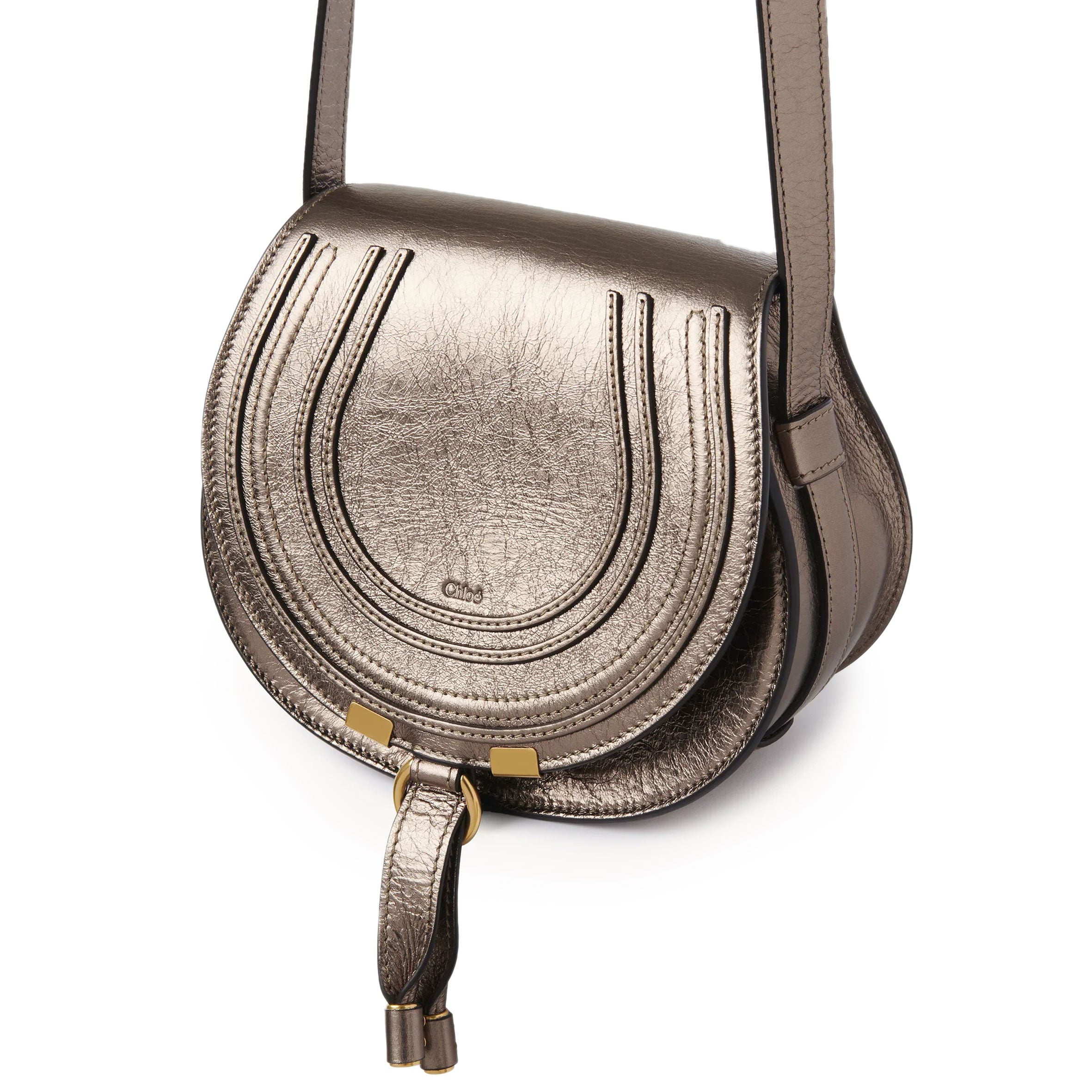 This version of Chloé’s iconic 'Marcie' shoulder bag has a metallic finish, perfect for casual evening events. Crafted from crinkled leather, it has a round shape and a front flap accented with signature horseshoe-inspired stitching.