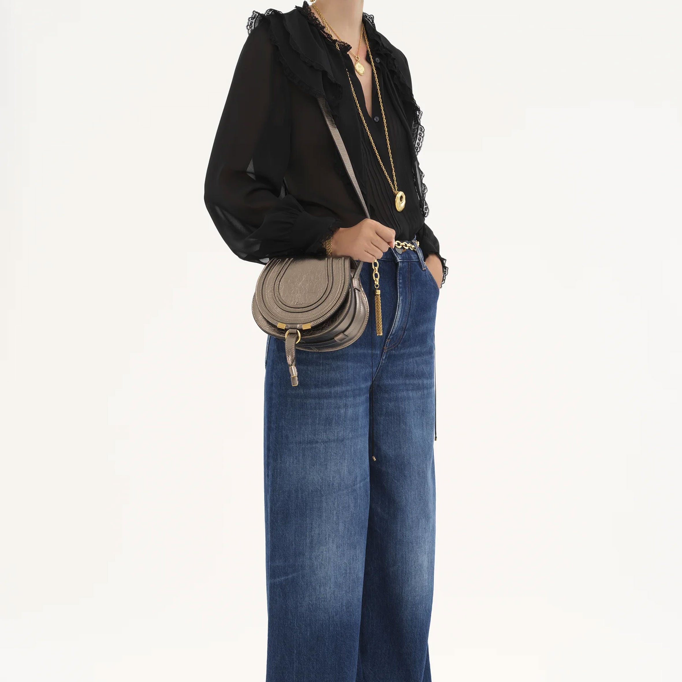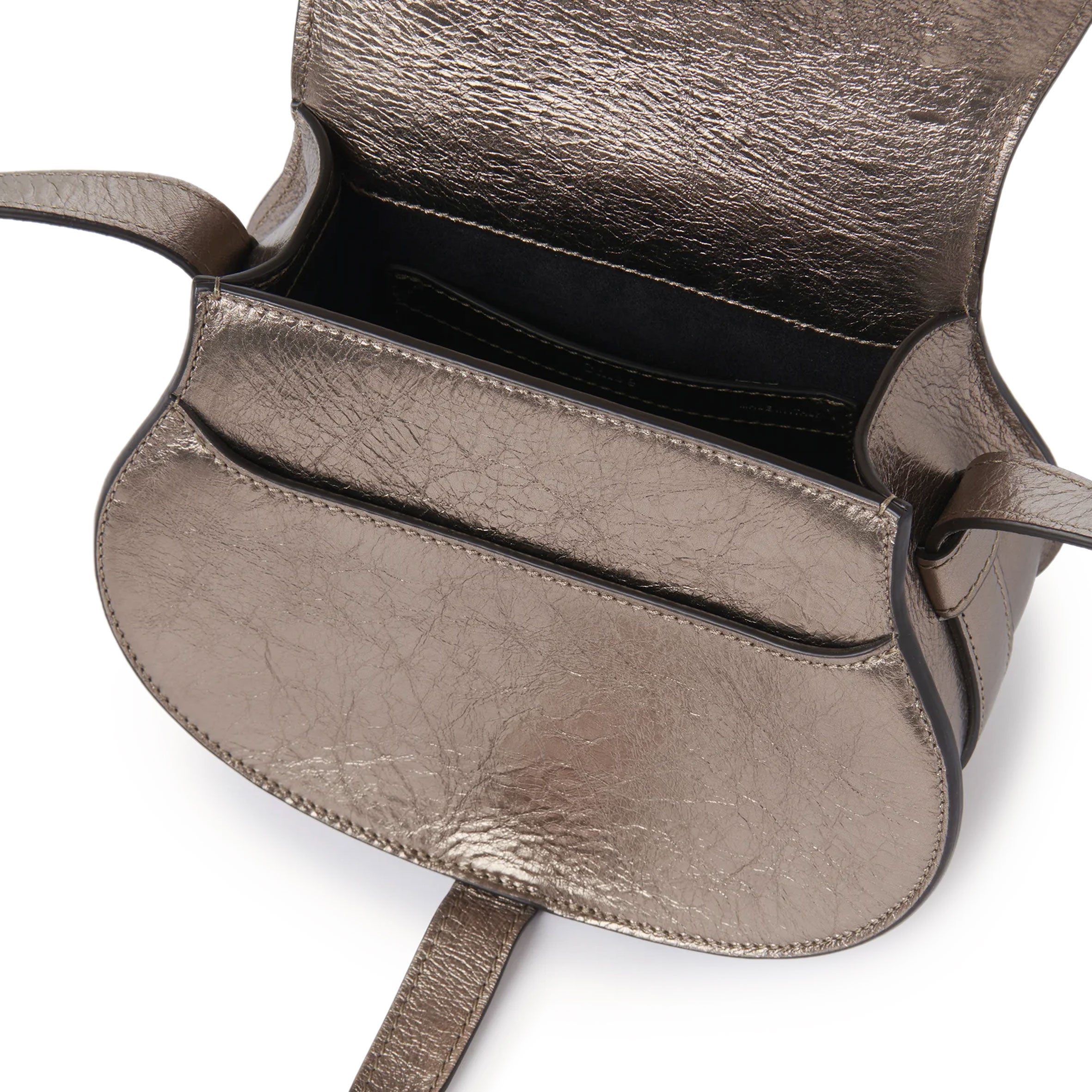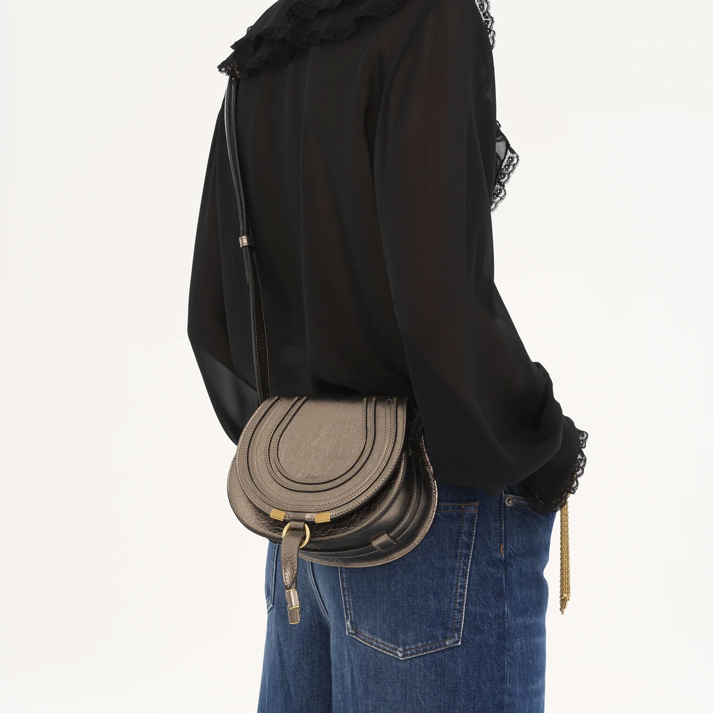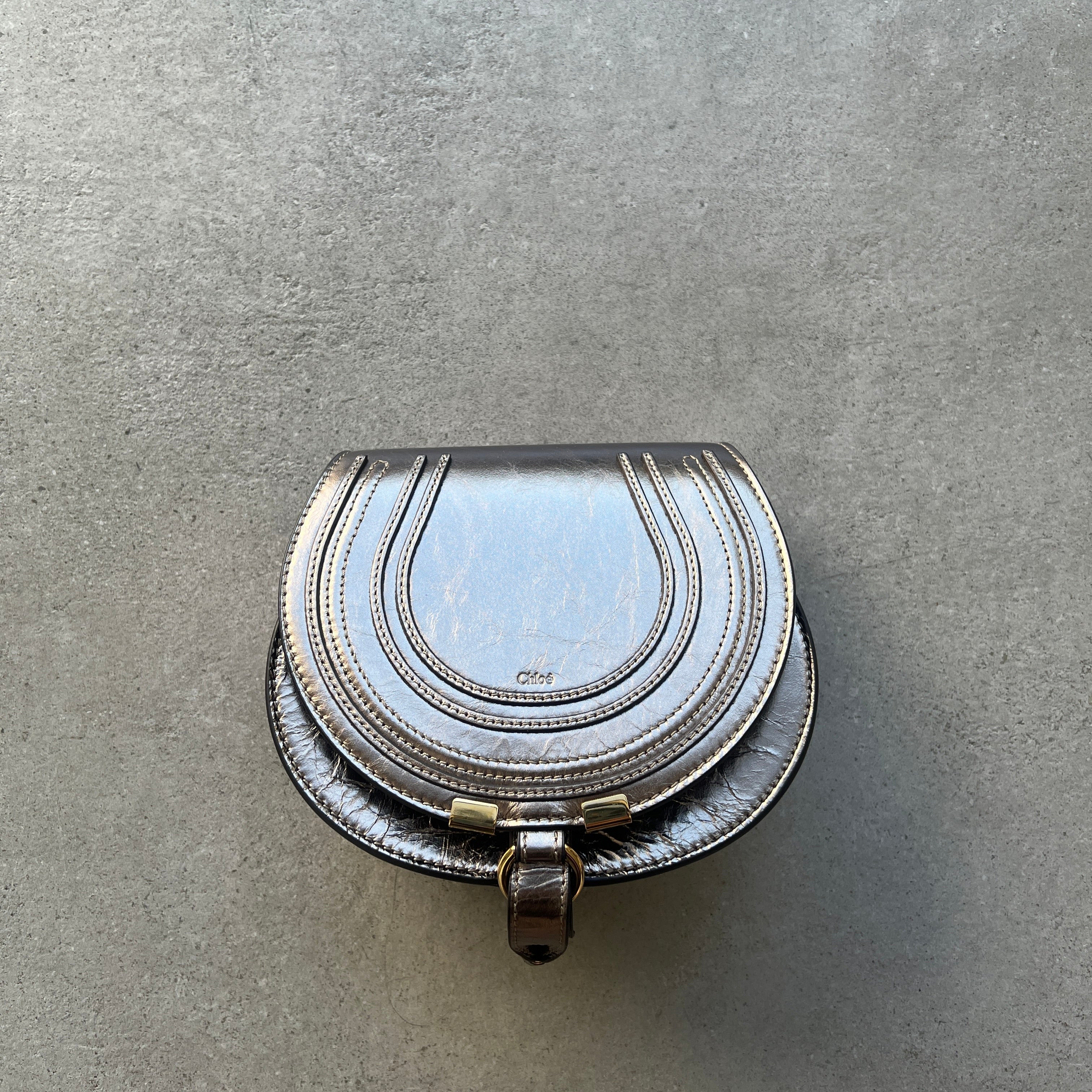 This version of Chloé’s iconic 'Marcie' shoulder bag has a metallic finish, perfect for casual evening events. Crafted from crinkled leather, it has a round shape and a front flap accented with signature horseshoe-inspired stitching.