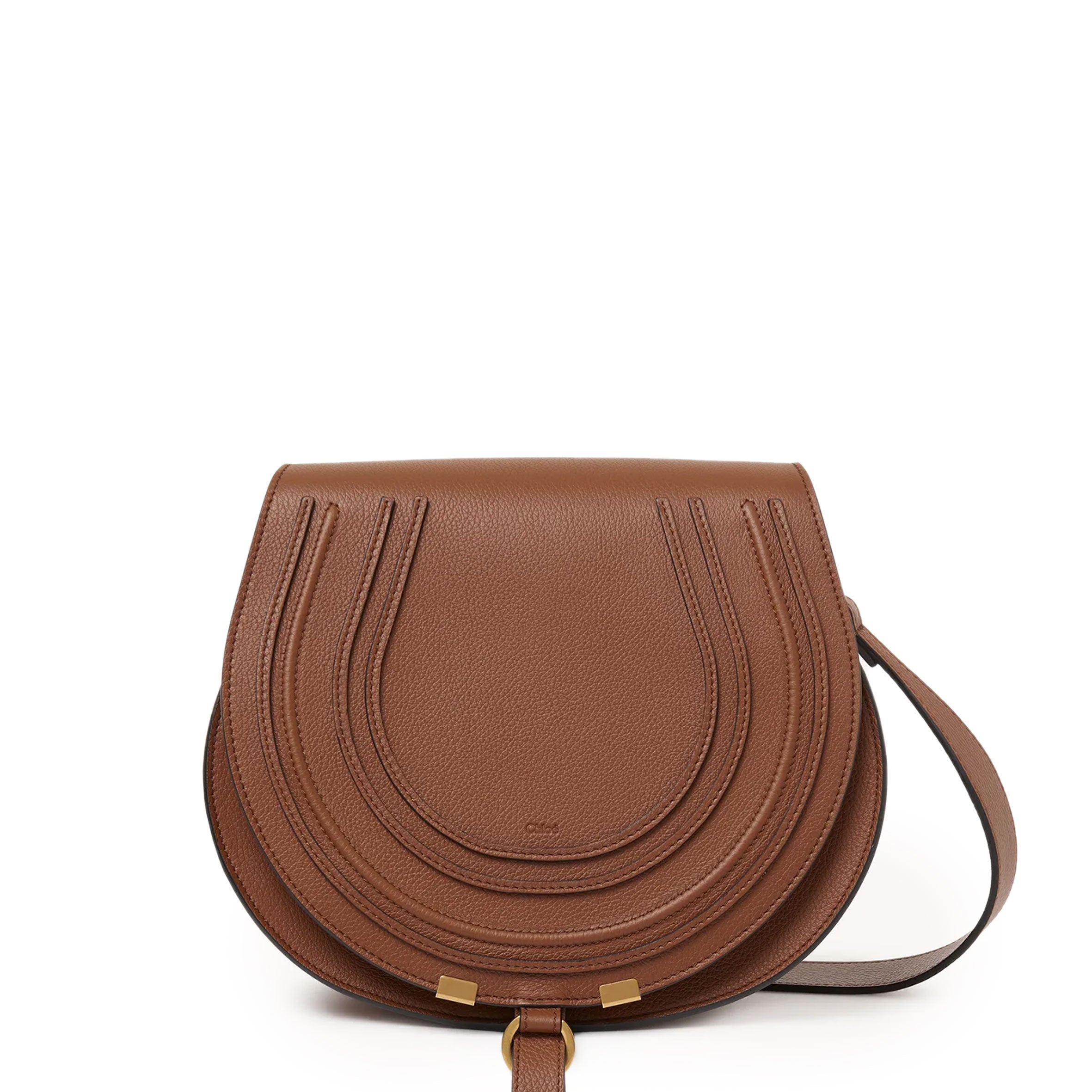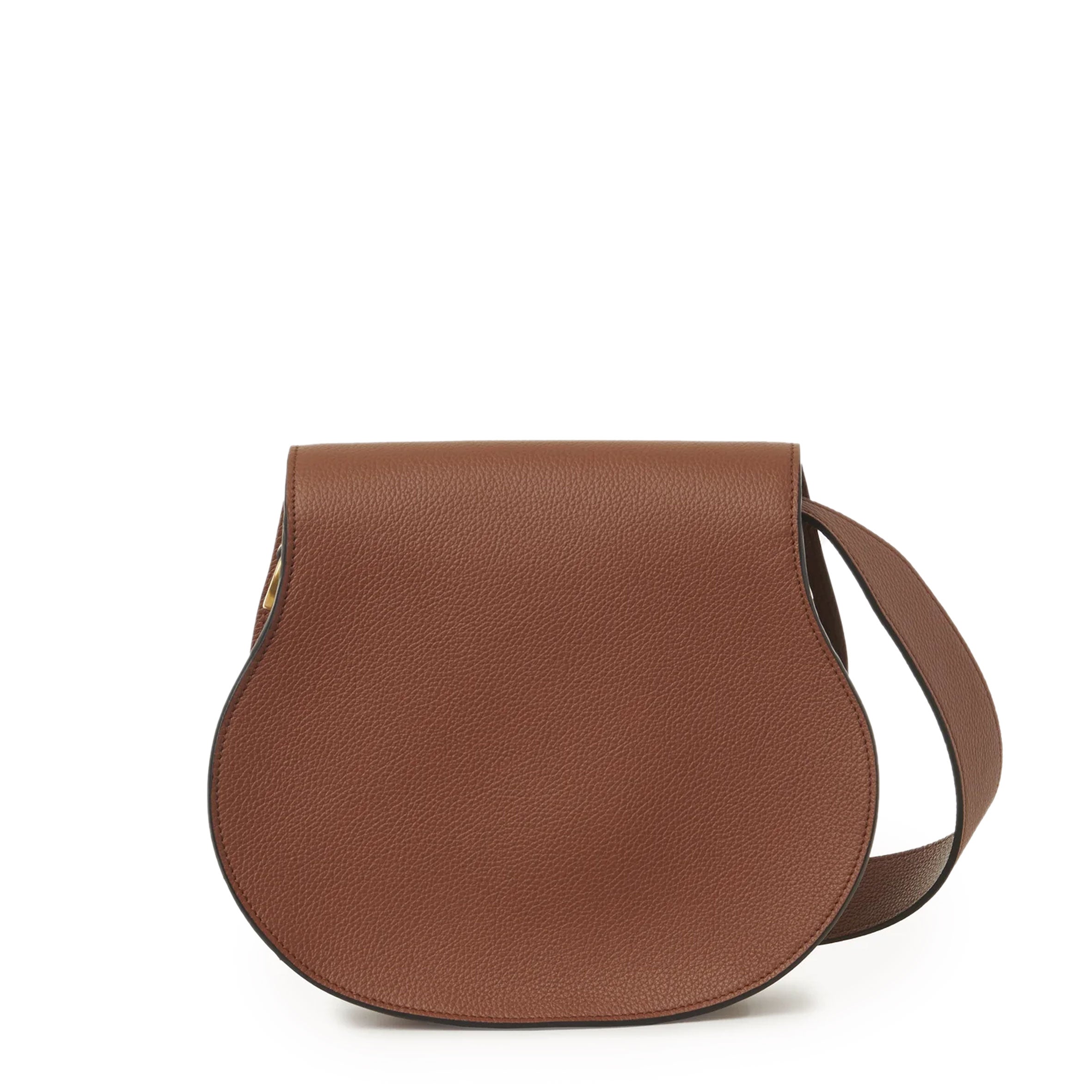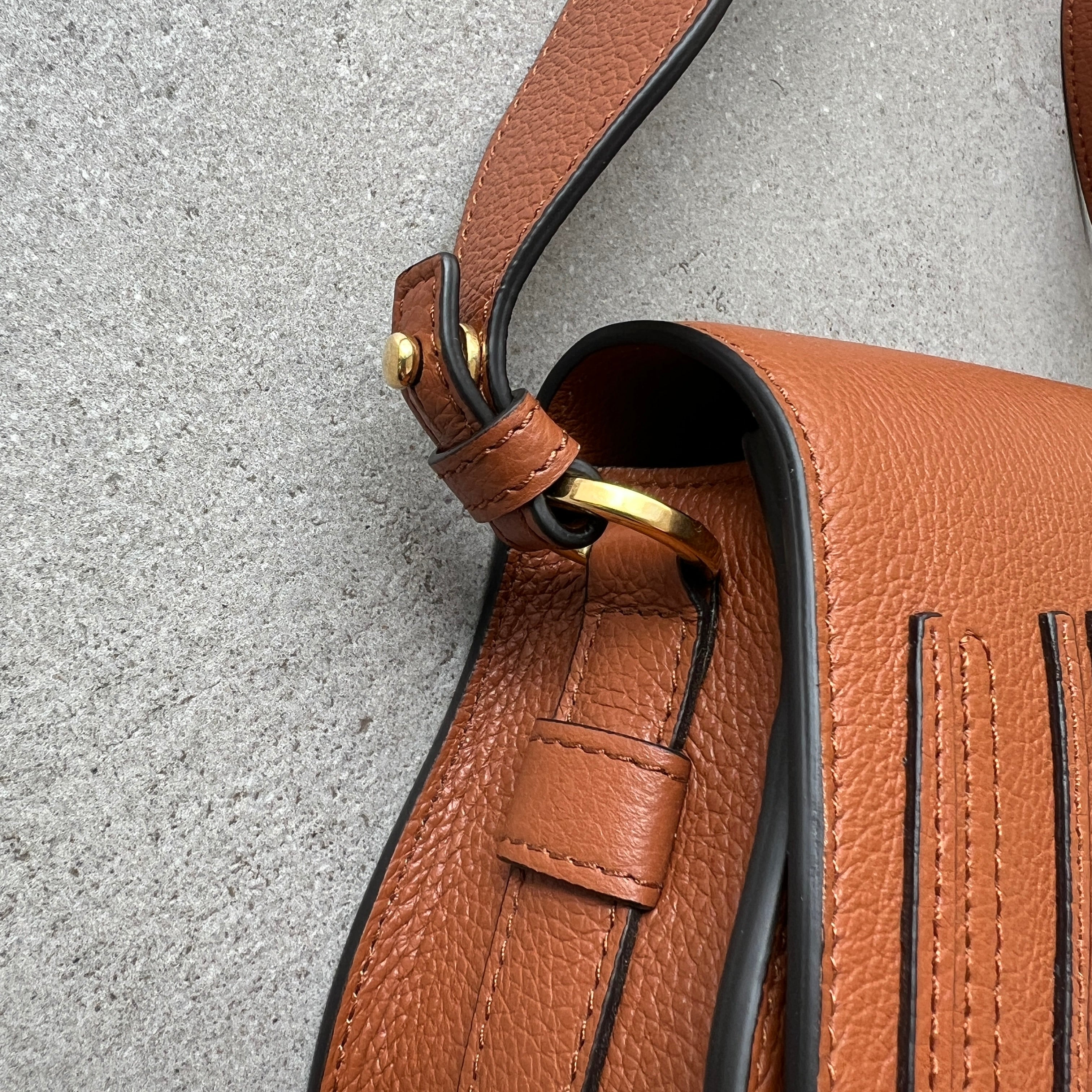 This Marcie saddle bag is crafted from grained calfskin with a rounded silhouette and a clean top line. The flap features the line's iconic saddle stitching, secured with signature dangling leather tassels.