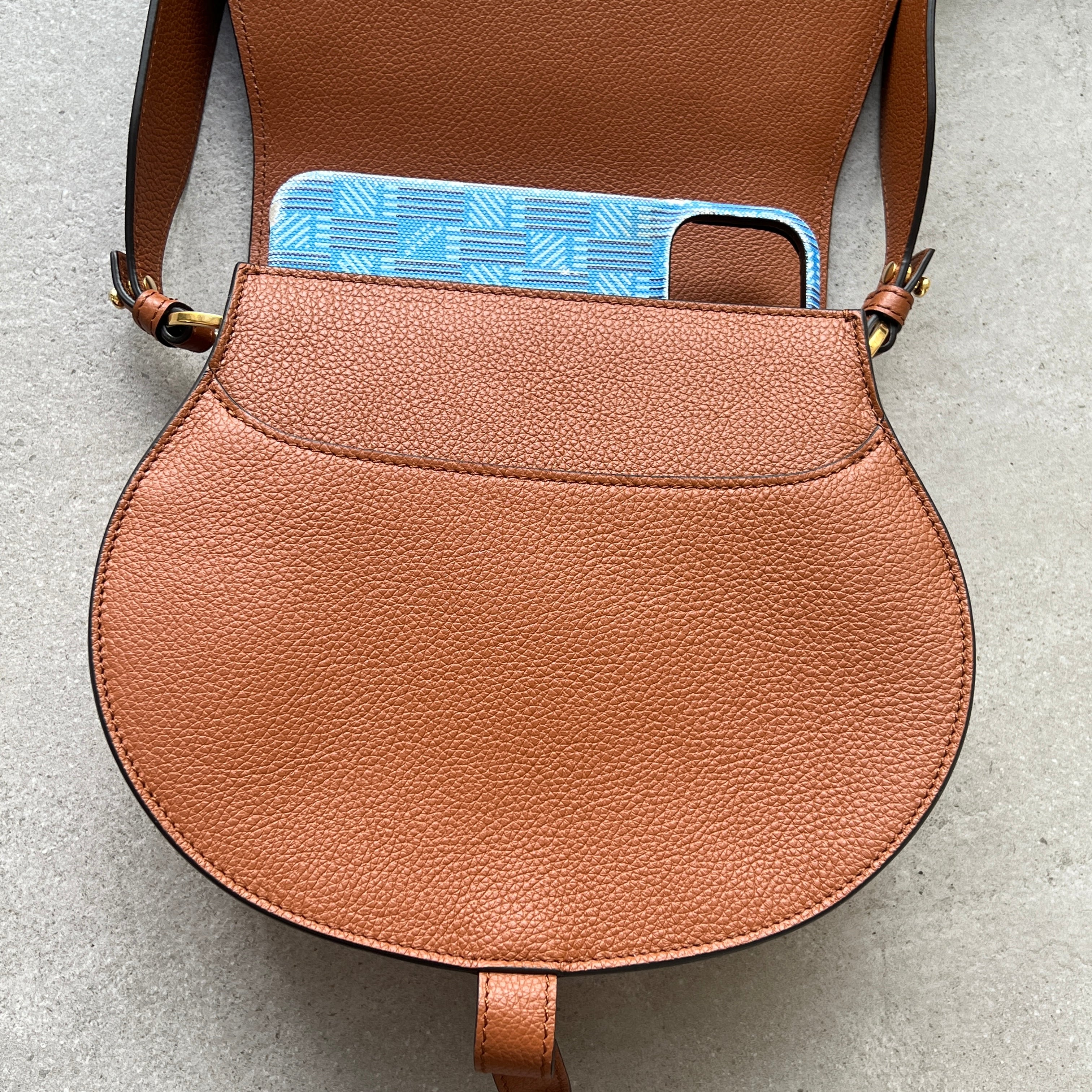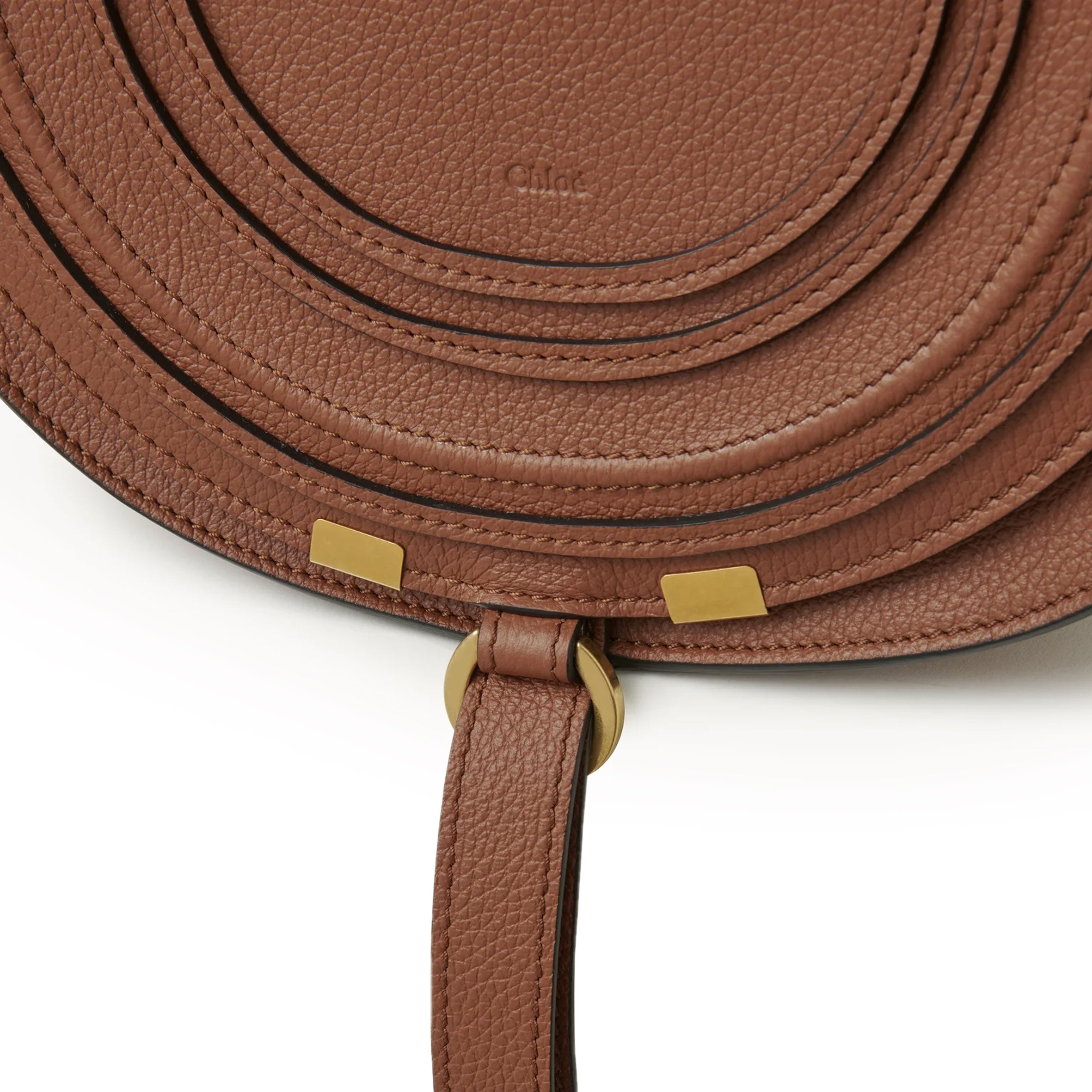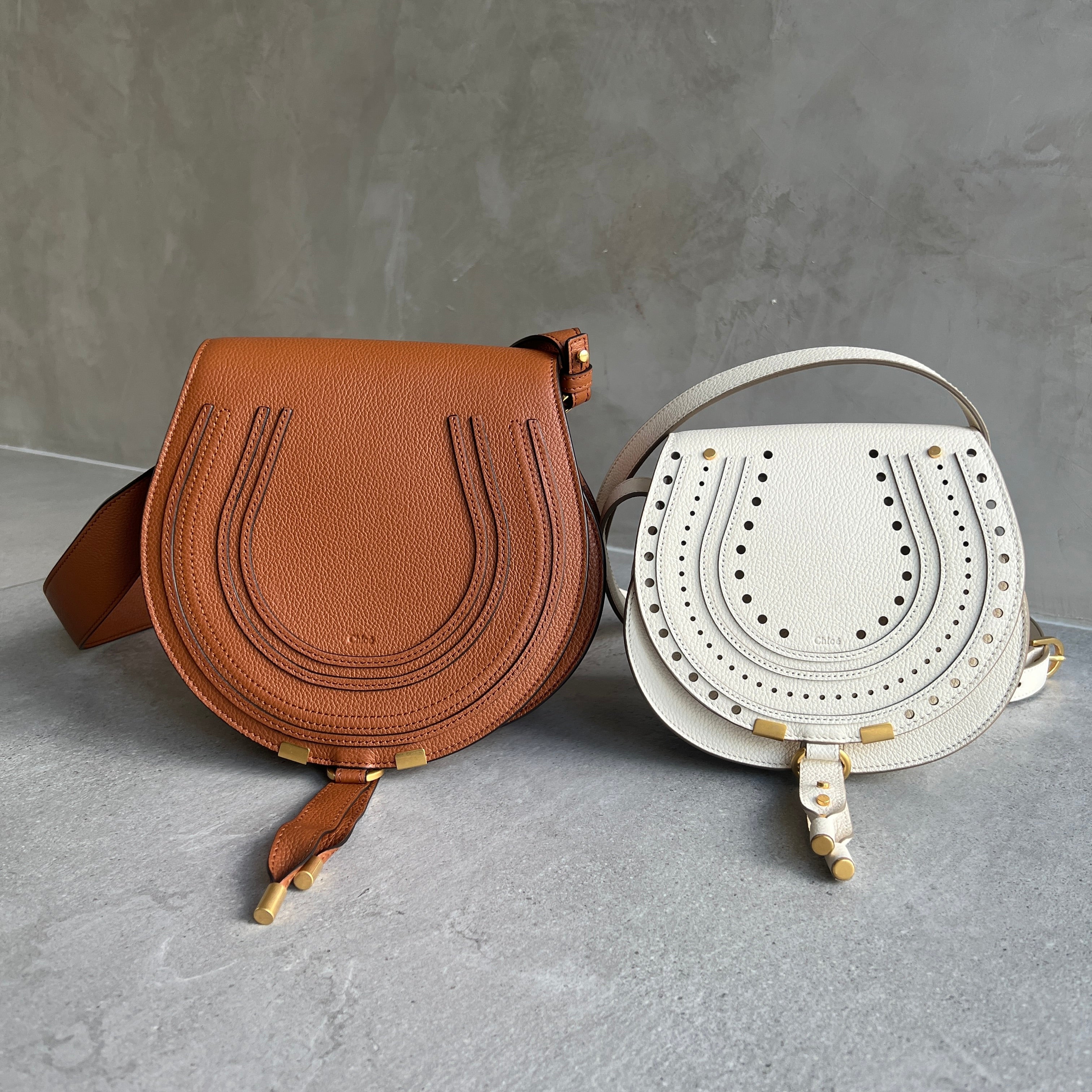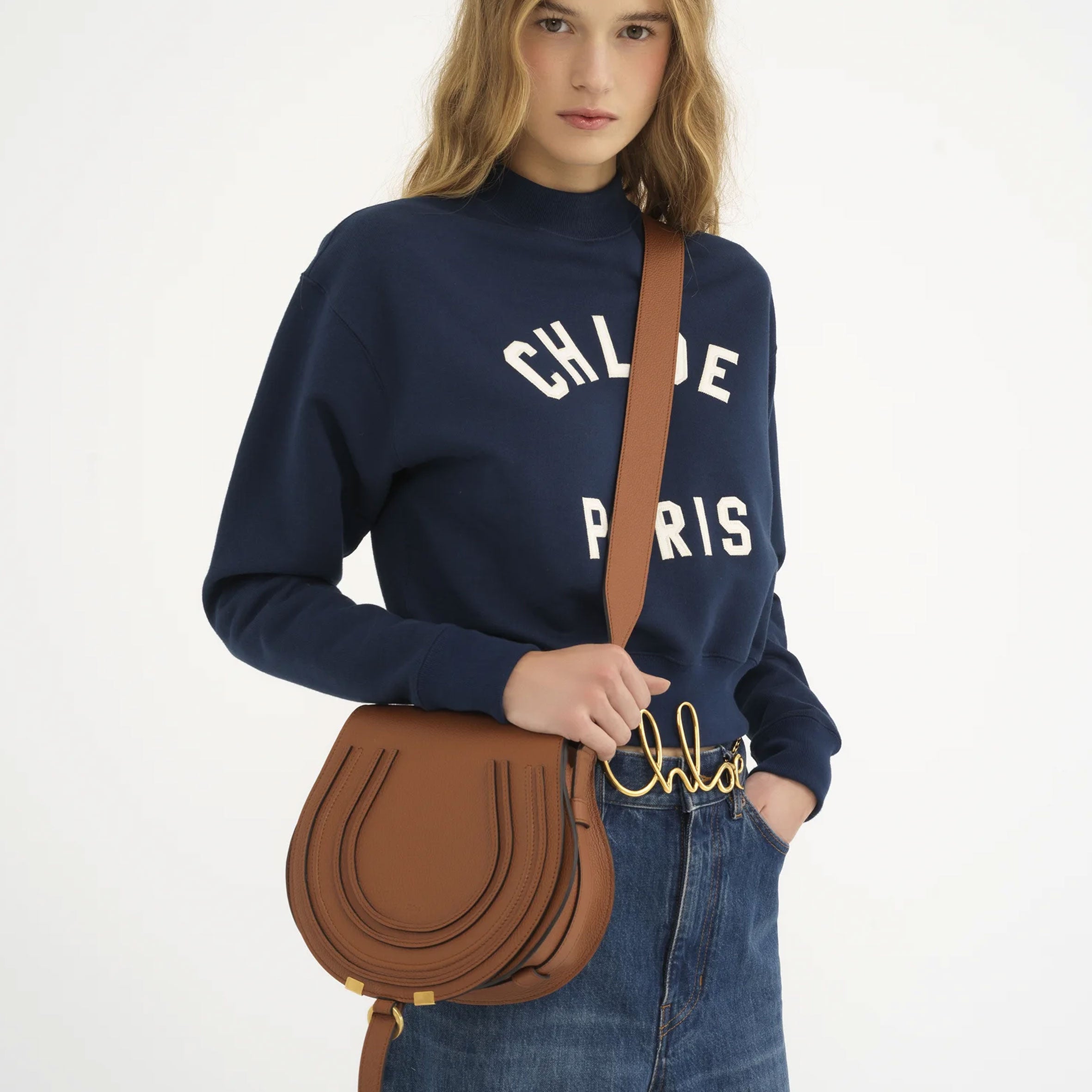 This Marcie saddle bag is crafted from grained calfskin with a rounded silhouette and a clean top line. The flap features the line's iconic saddle stitching, secured with signature dangling leather tassels.
