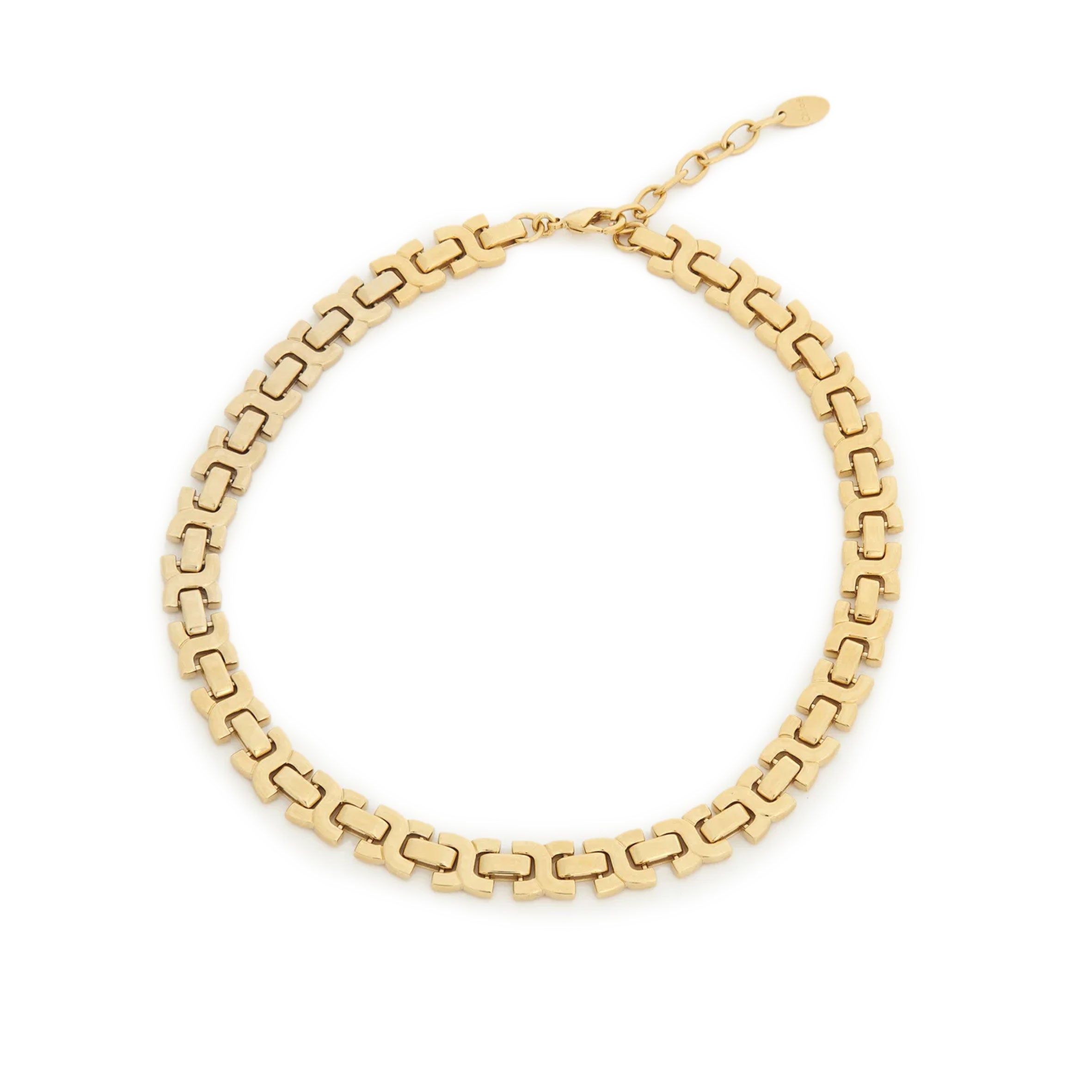 Crafted from bright gold brass, this Marcie chain necklace is strung with interlocking pieces in the line's signature shape. The hand-assembled, adjustable necklace makes an elegant statement that will complement the matching bracelet, ring or earrings.