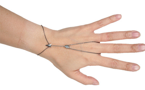 Oxidized silverfinger bracelet is made up of delicate fine chains and two spike charms. Secure it at the wrist and loop the additional chain around your middle finger.