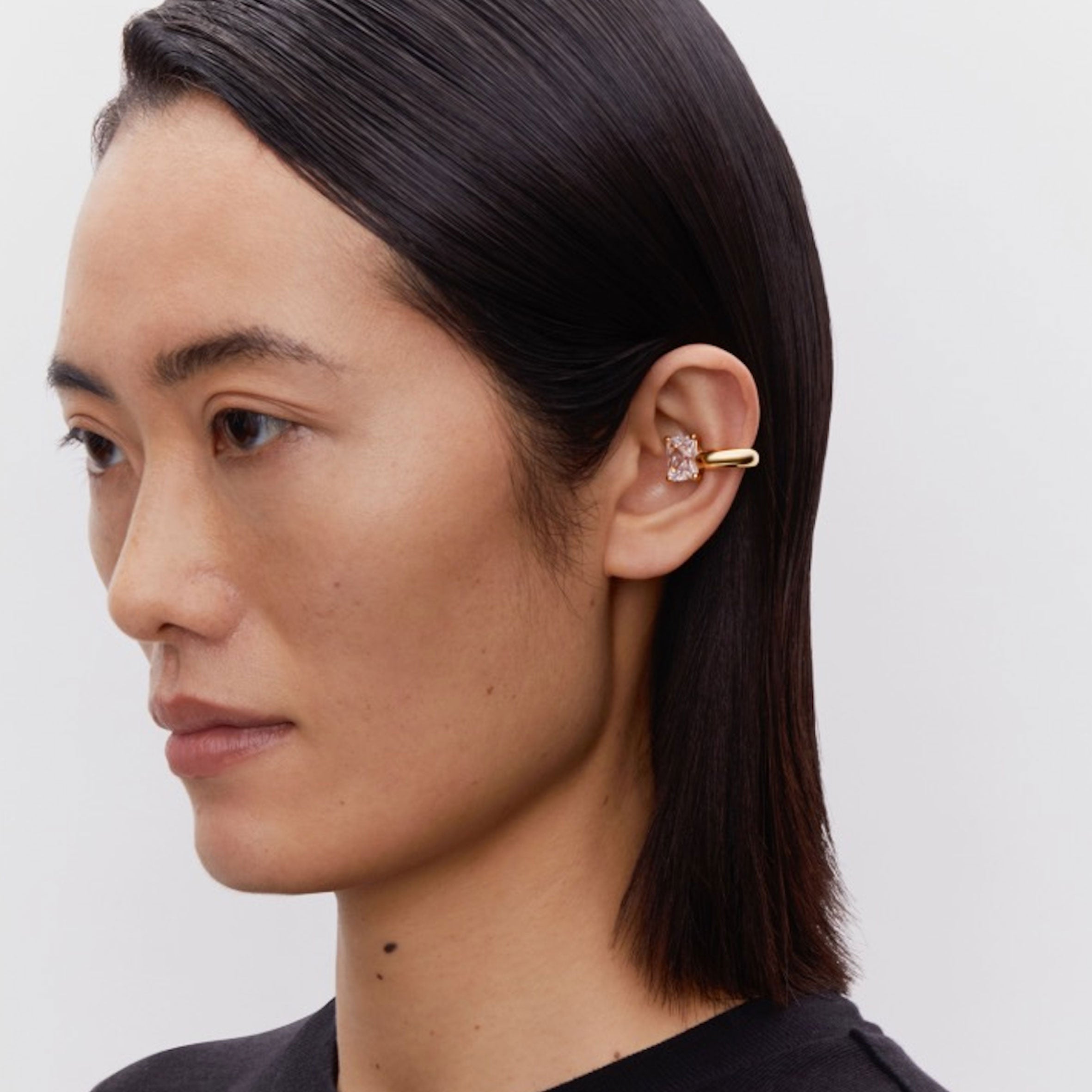 The Omotesando is a sleek ear cuff with a polished finish, skillfully crafted in recycled sterling silver. It gives the illusion of a conch piercing and is perfect for ear stacks.