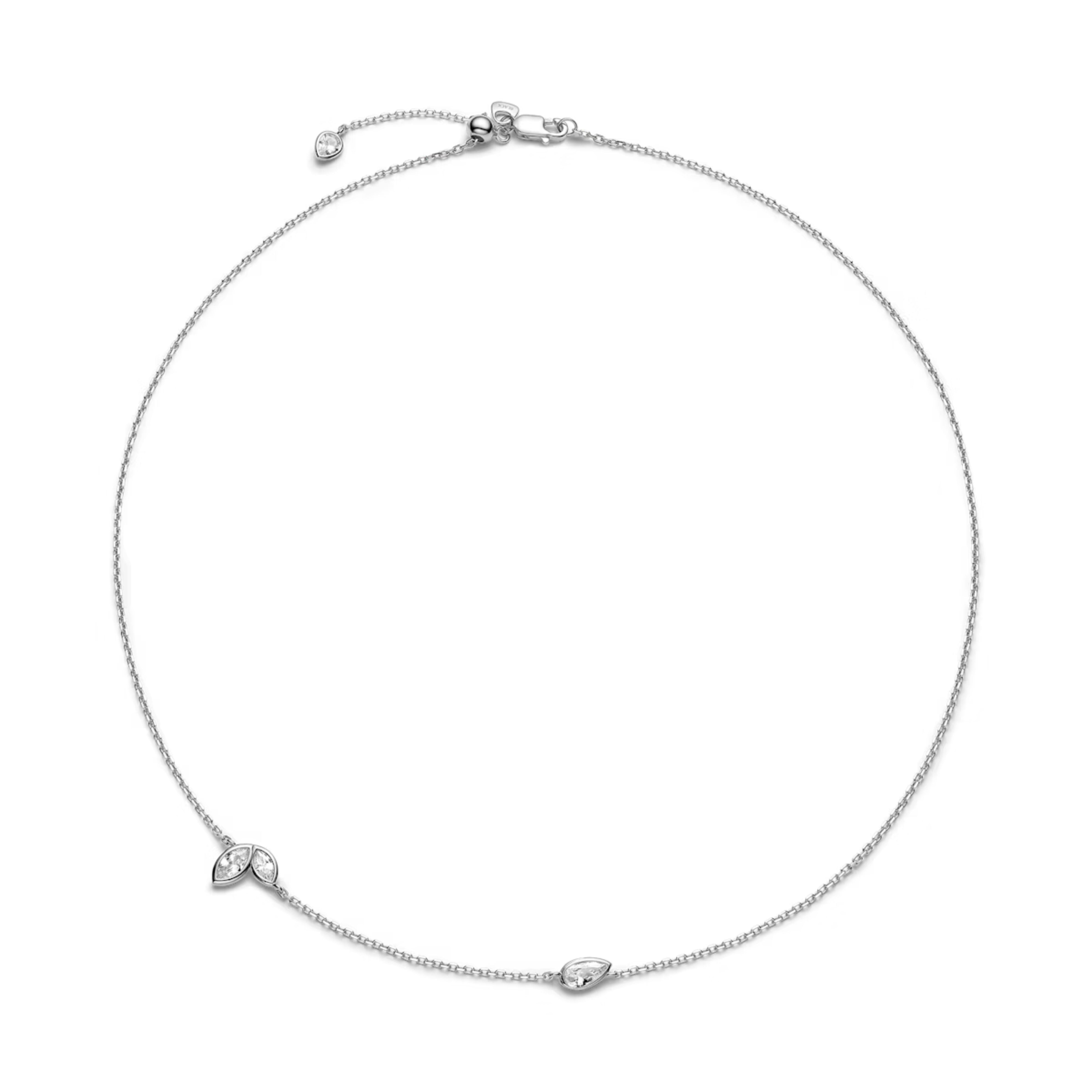 Featherlight chain necklace with unique offset floating bezel settings and marquise and pear-cut white zirconia stones. The stones are visible from the back due to the unique thin setting, ensuring the same look front and back.
