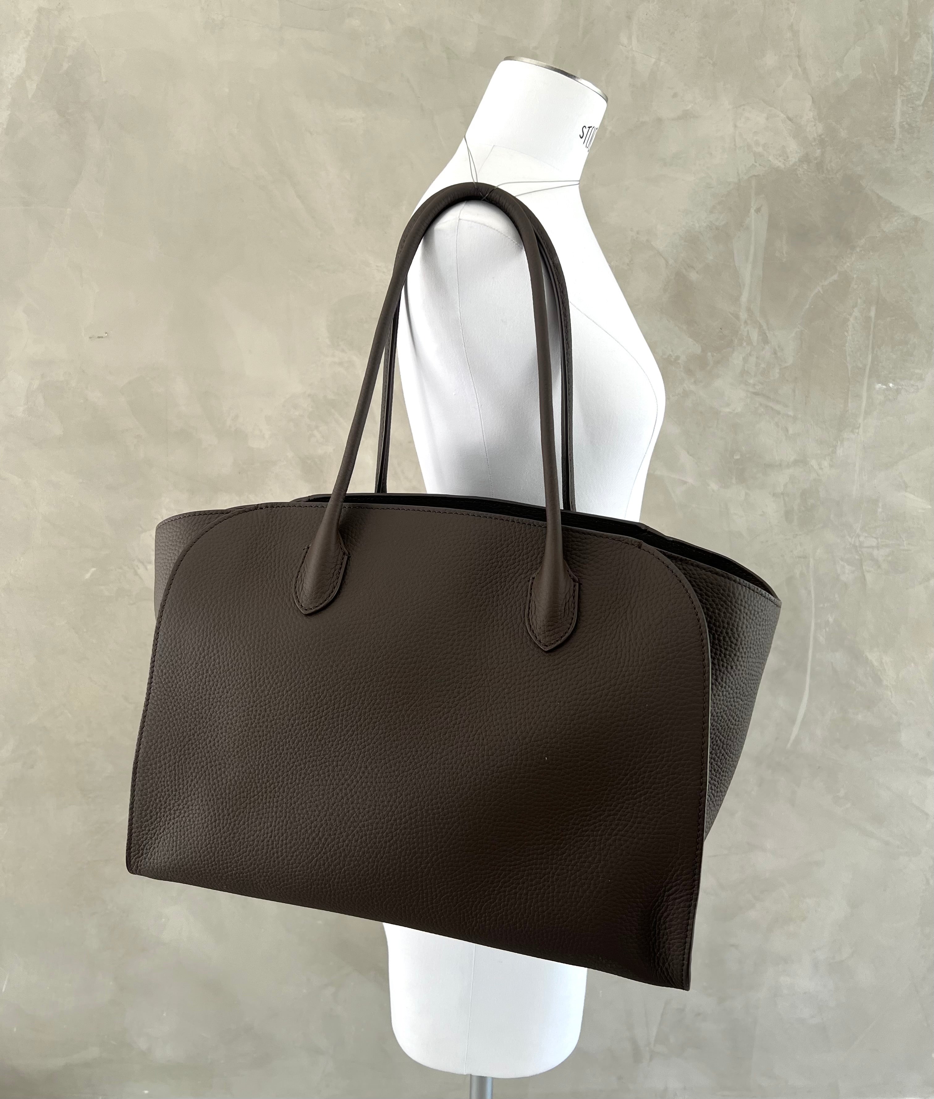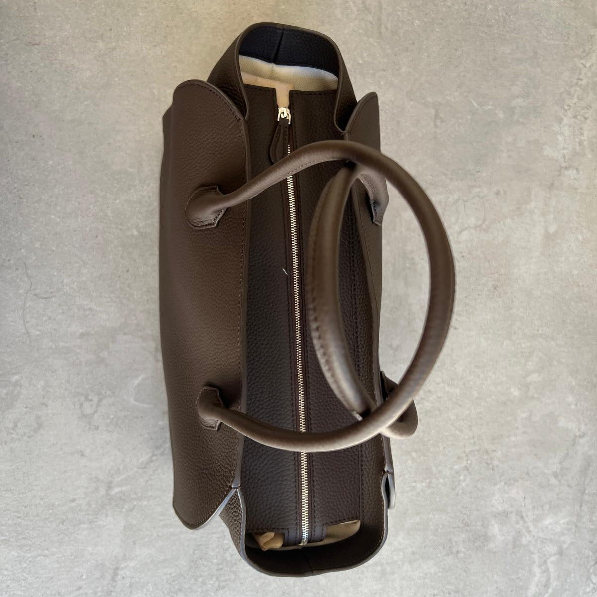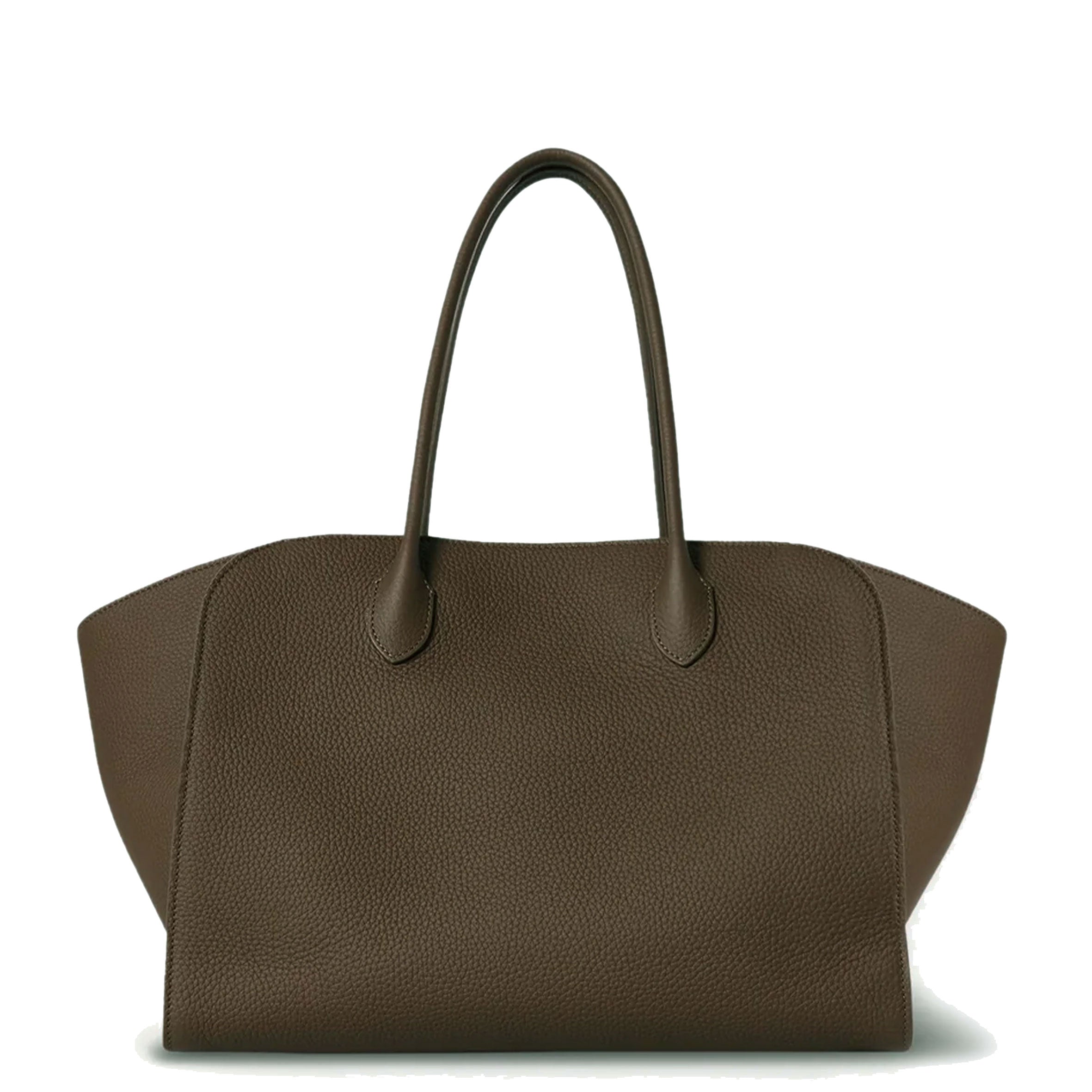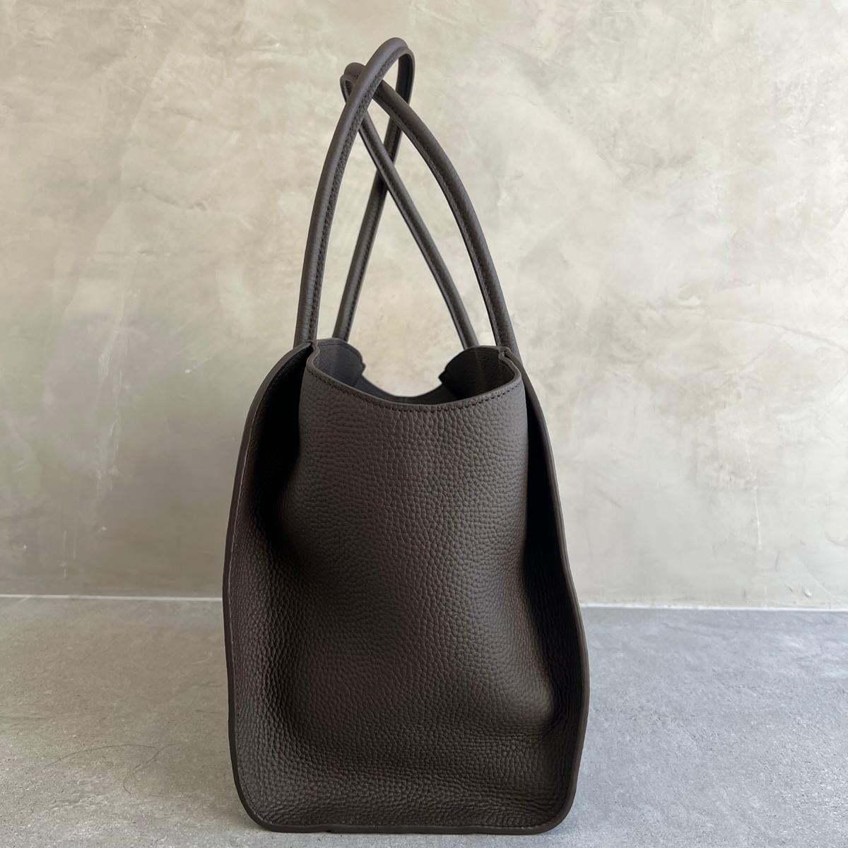 Softly structured tote bag in grained leather with tubular handles, gusseted side panels, and top zipper closure.