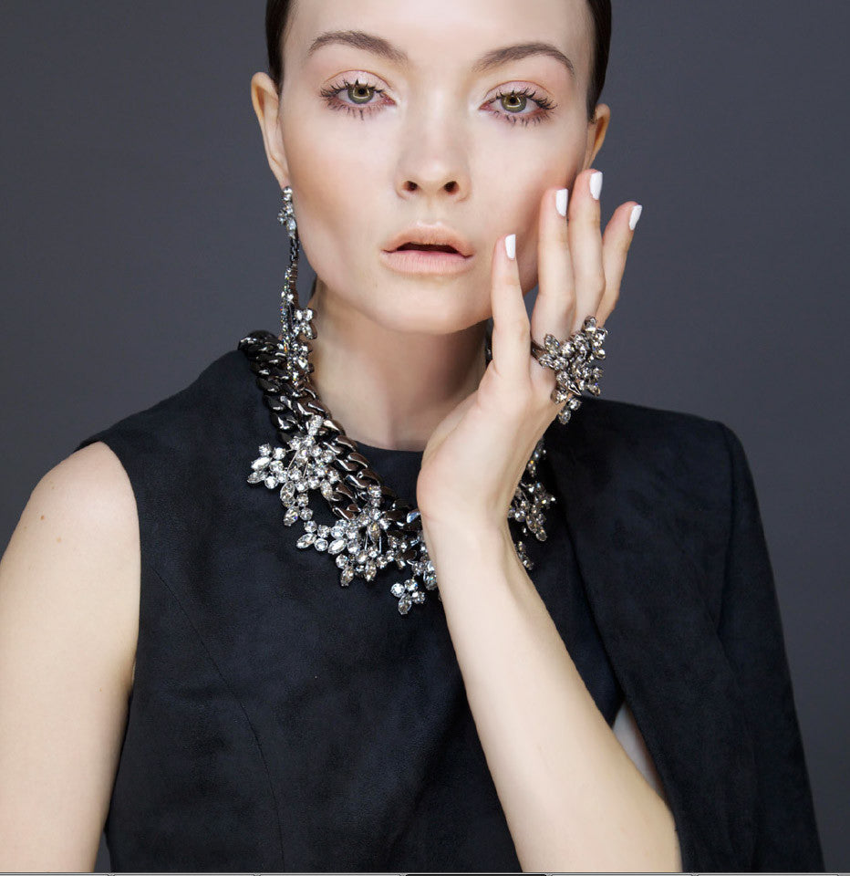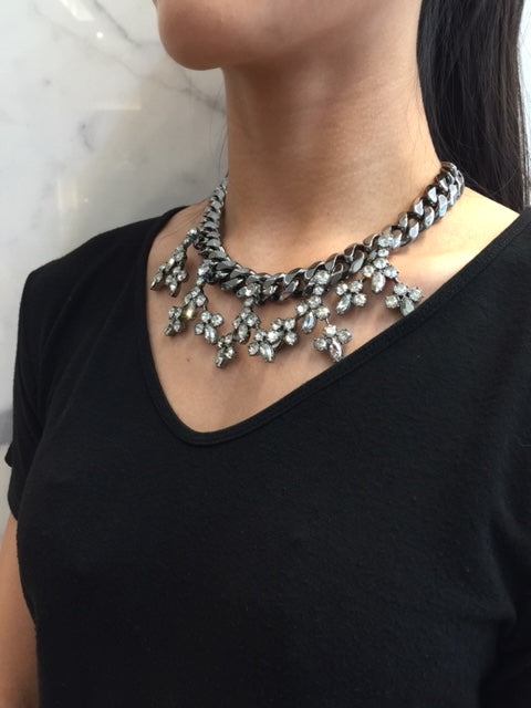 Hematite plated necklace with clear crystal blossoms. Designer inscribed clasp fastening at rear.