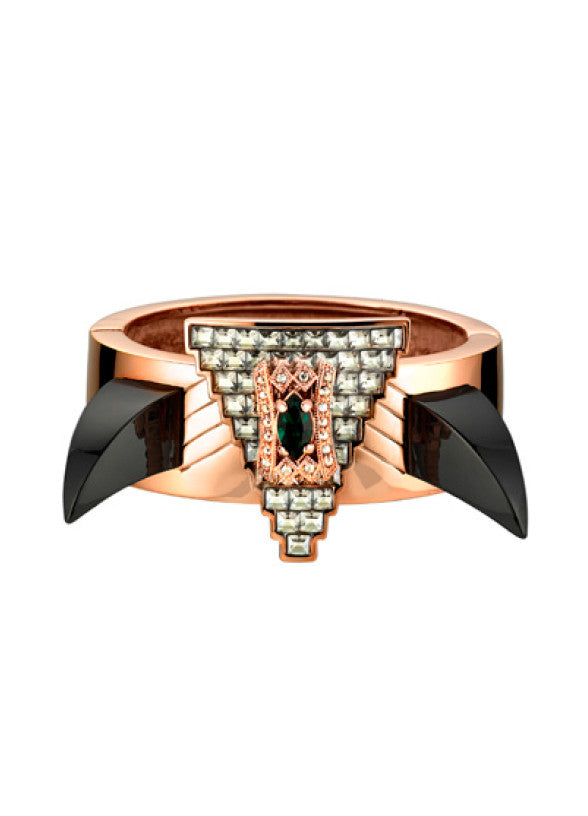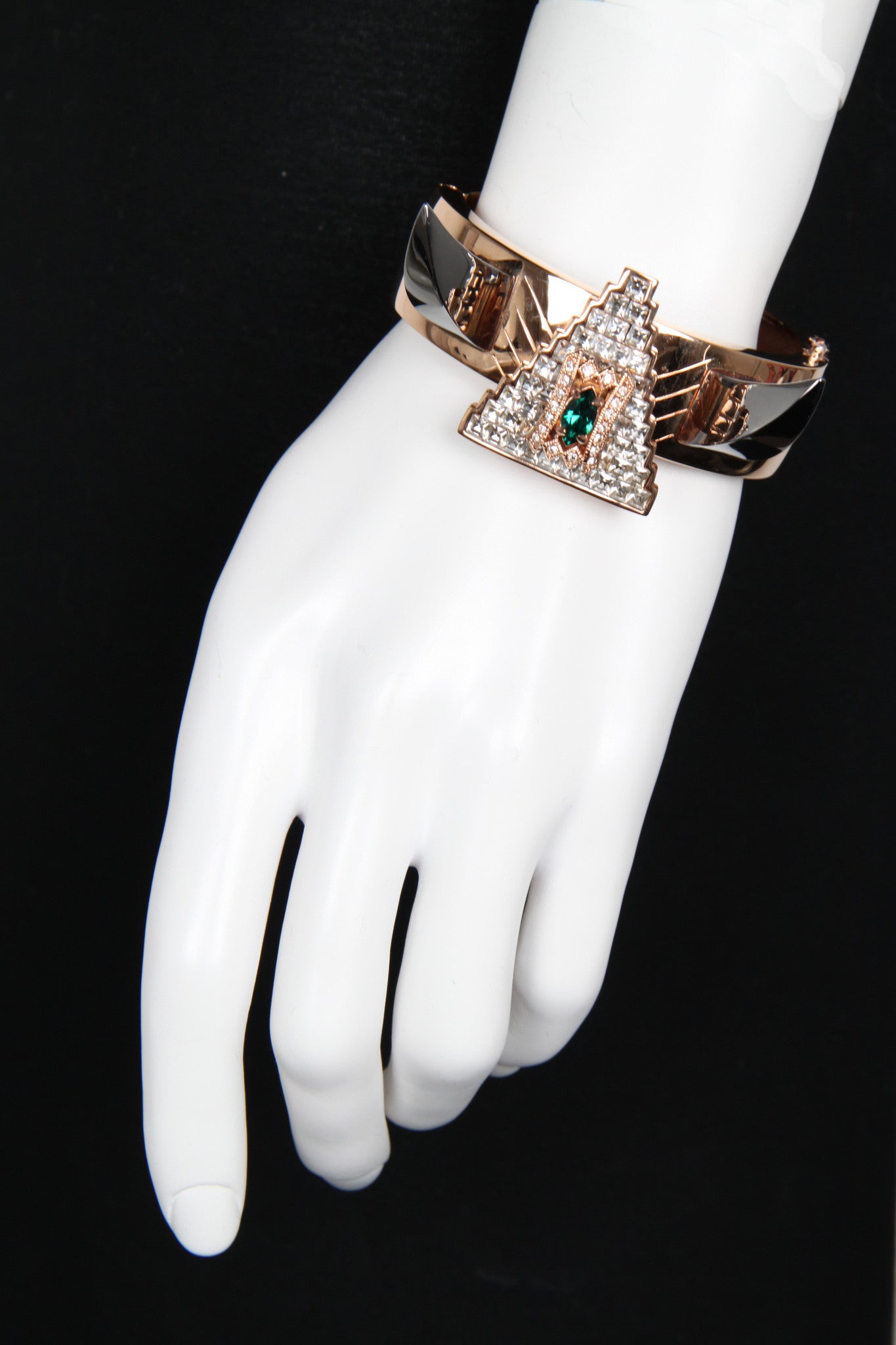 This Rose Gold plated hinged bangle has two angular deco fangs and a central crystal encrusted deco prism. Wear it with anything from a simle blouse and pants at the office to a cutting edge mini in the evening, this decorative piece will easily hold its own.